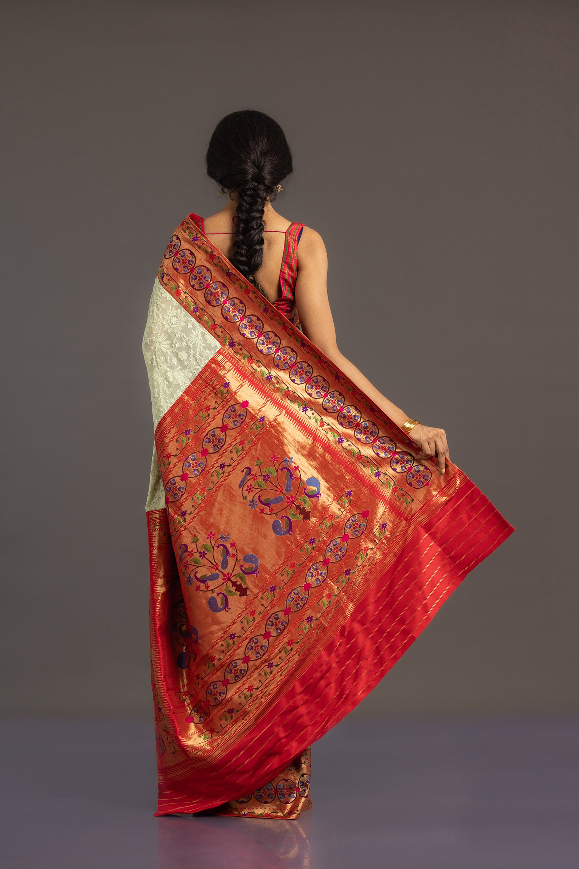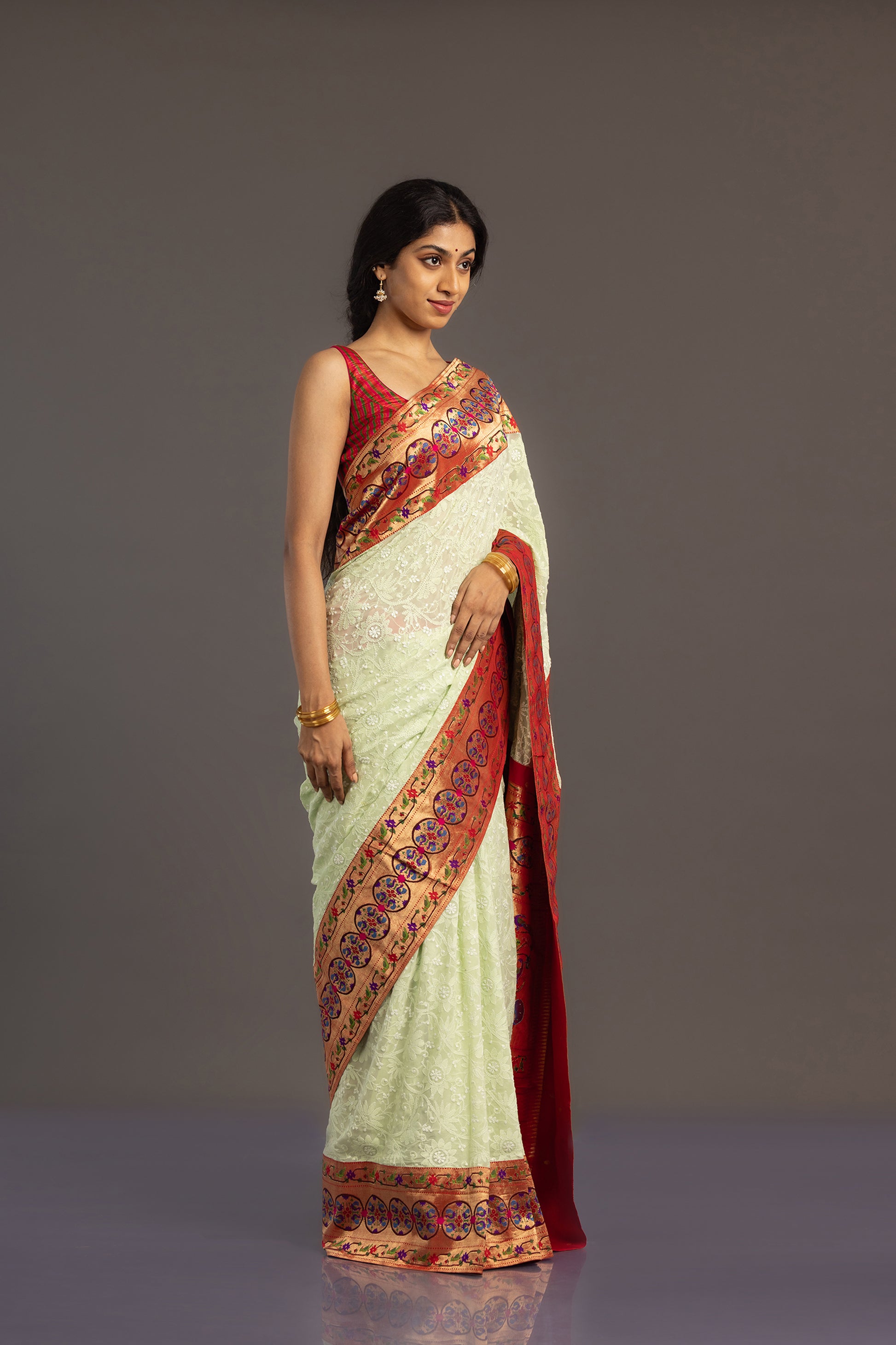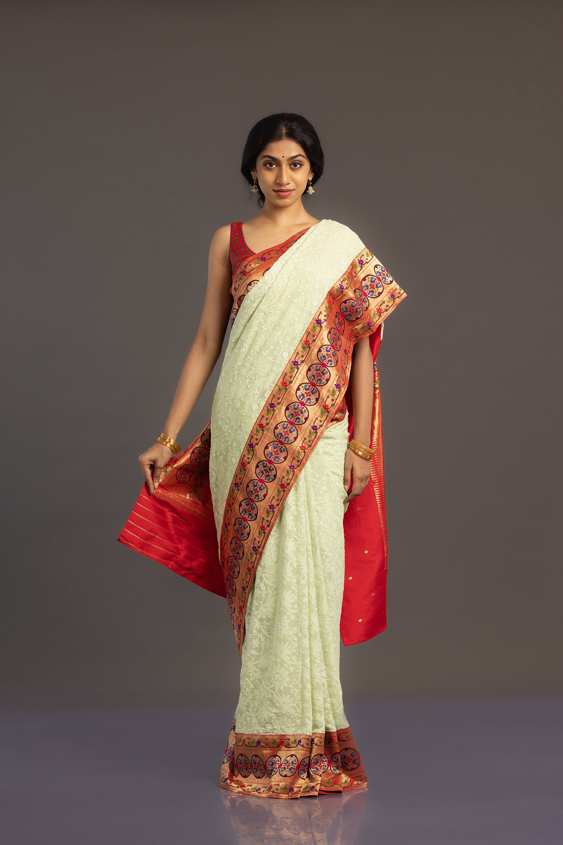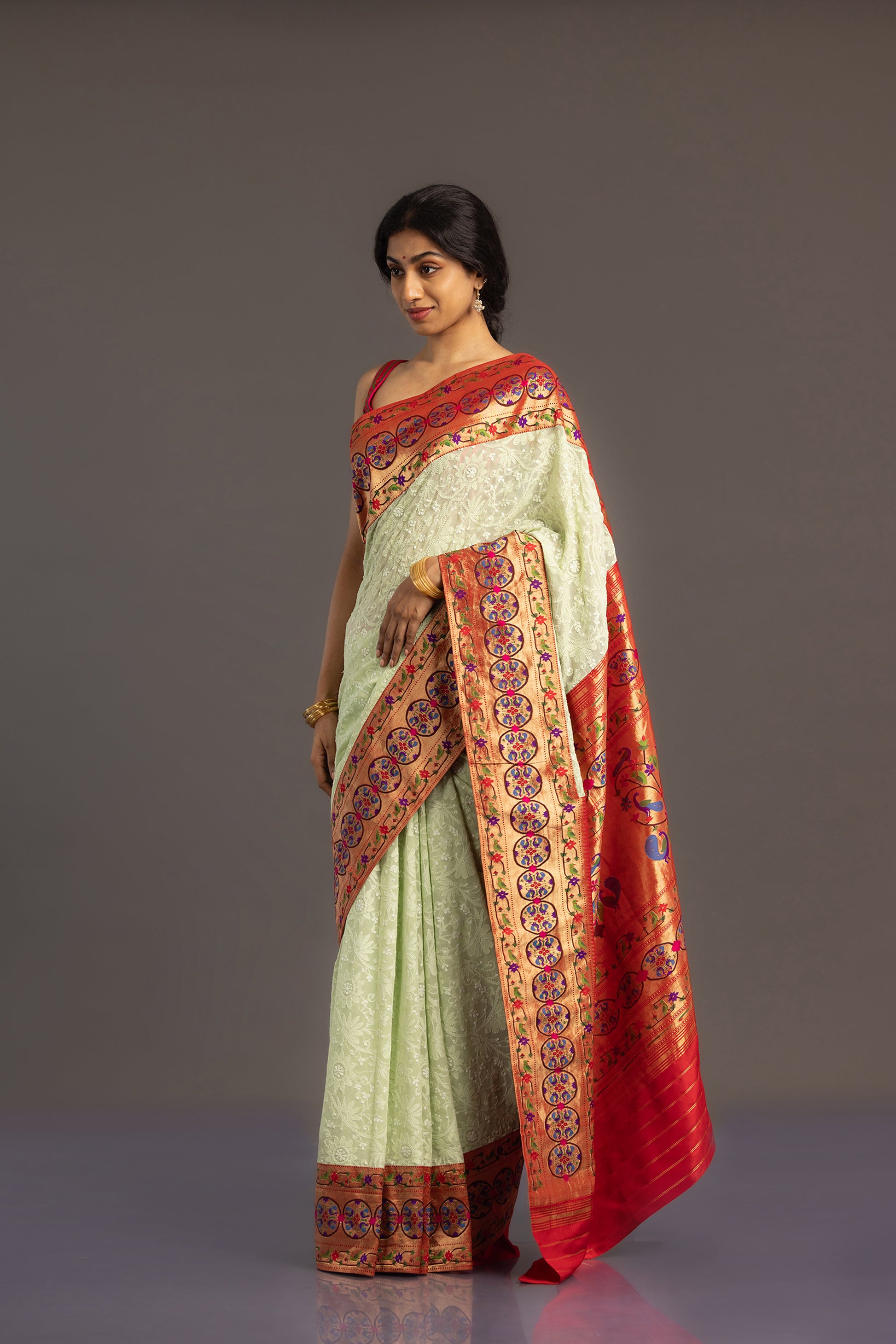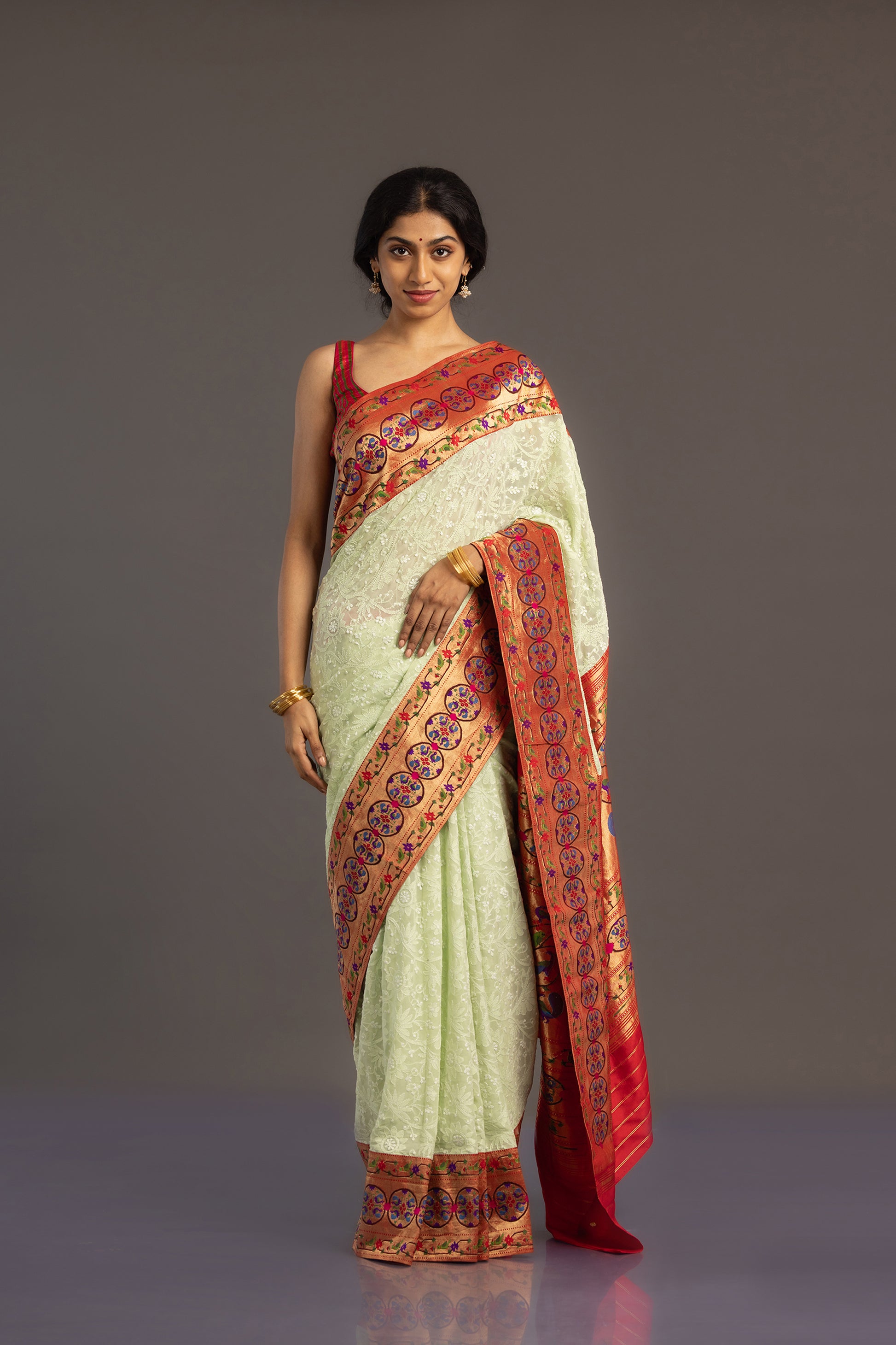Pure georgette saree in sage green with handmade Chikankari work. Handwoven Paithani border with Bangadi Mor and Muma Parinda motifs. Paithani pallu has Bangadi Mor, Muma Parinda, and Muniya borders, with peacock and parrot designs.