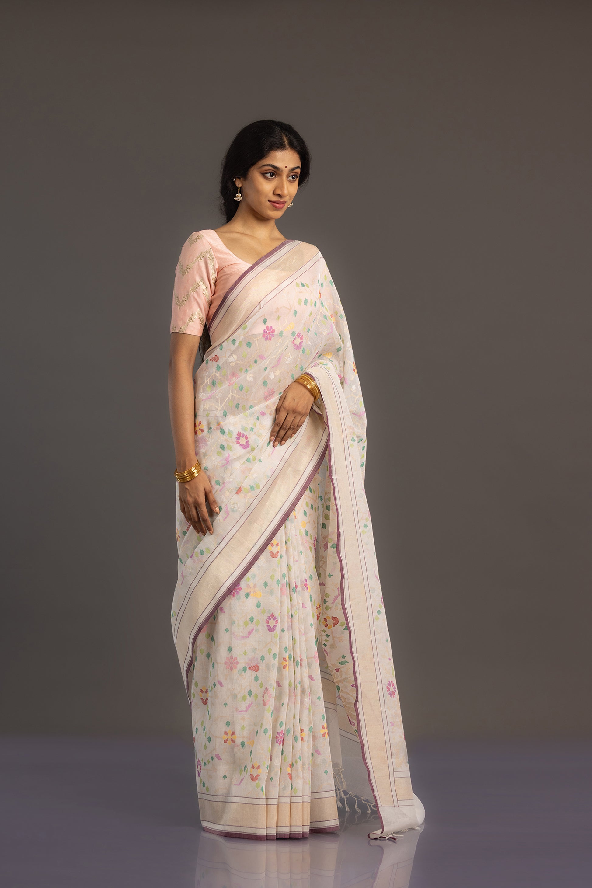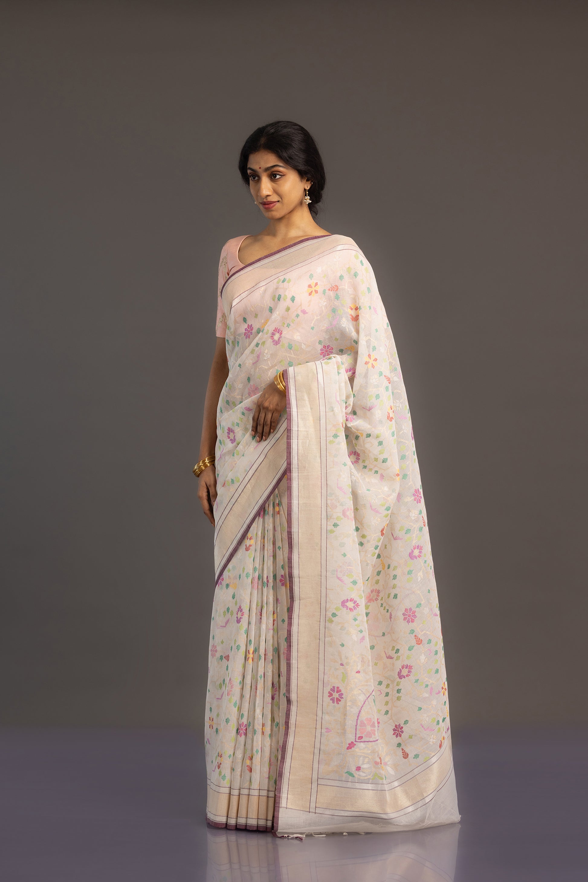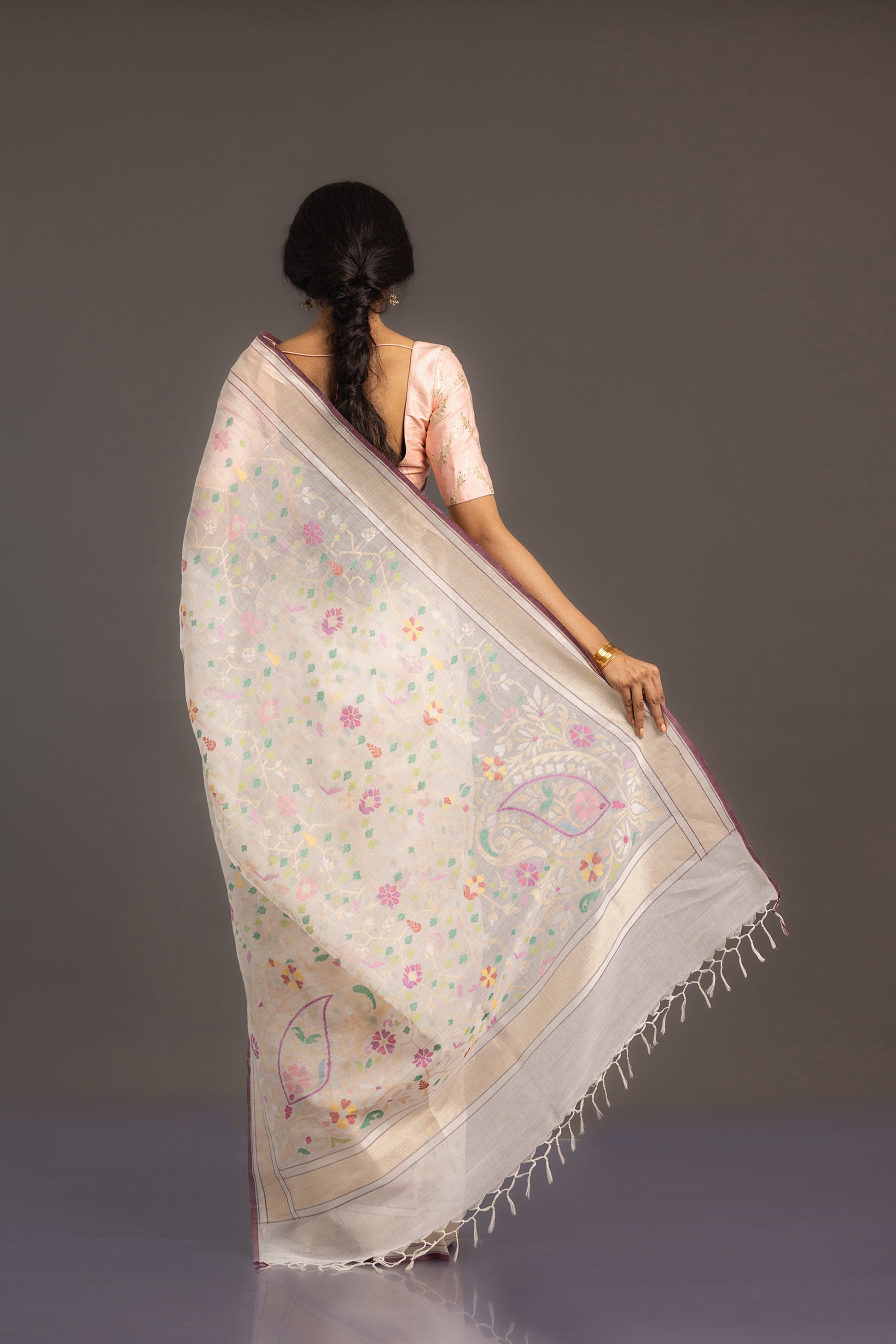 Handloom cotton Jamdani Benarasi saree in white with Jamdani woven all-over floral motifs in Zari and colorful threads. Zari kadi border with contrasting burgundy selvedge. Pallu continues the floral motifs with the Zari kadi border.