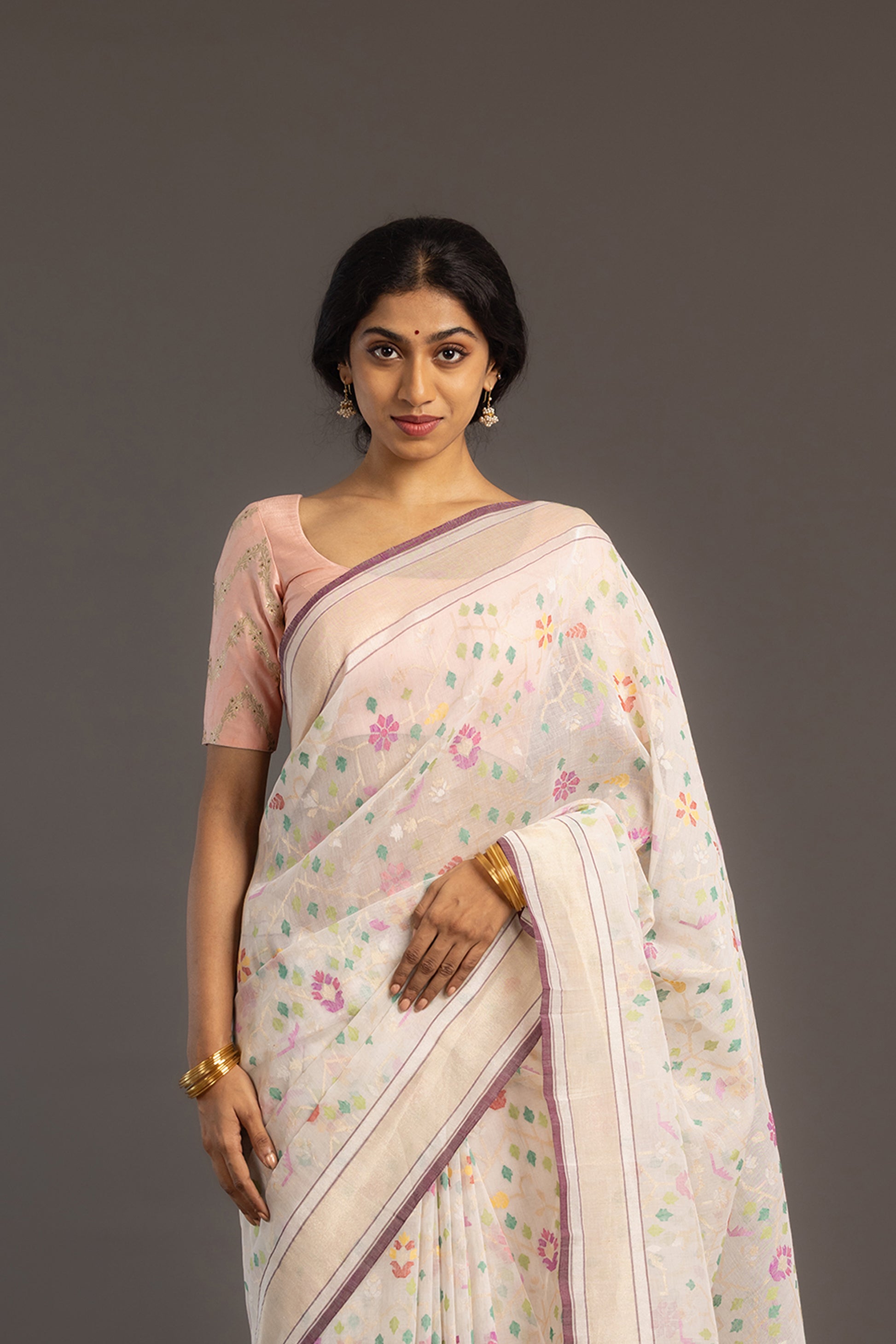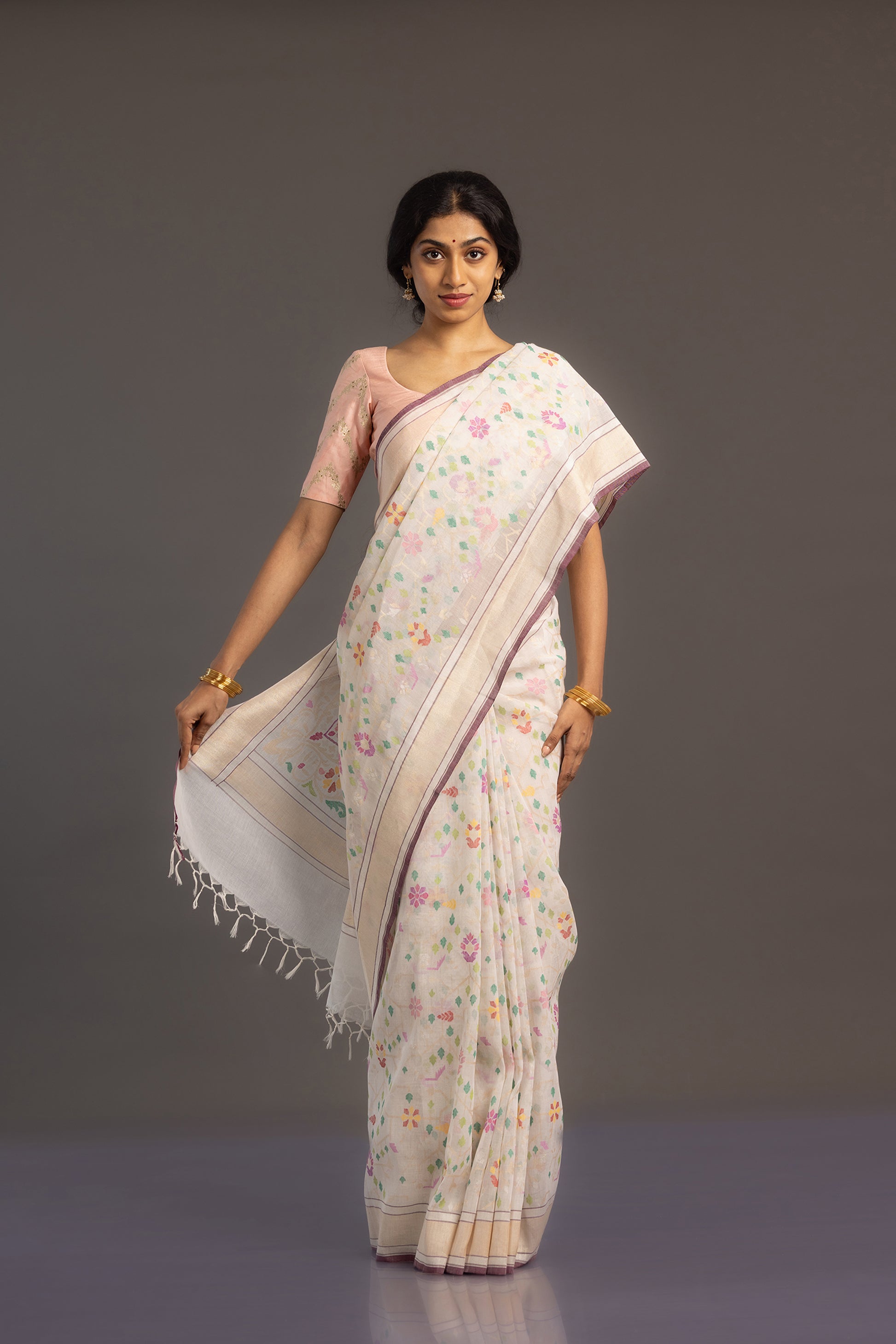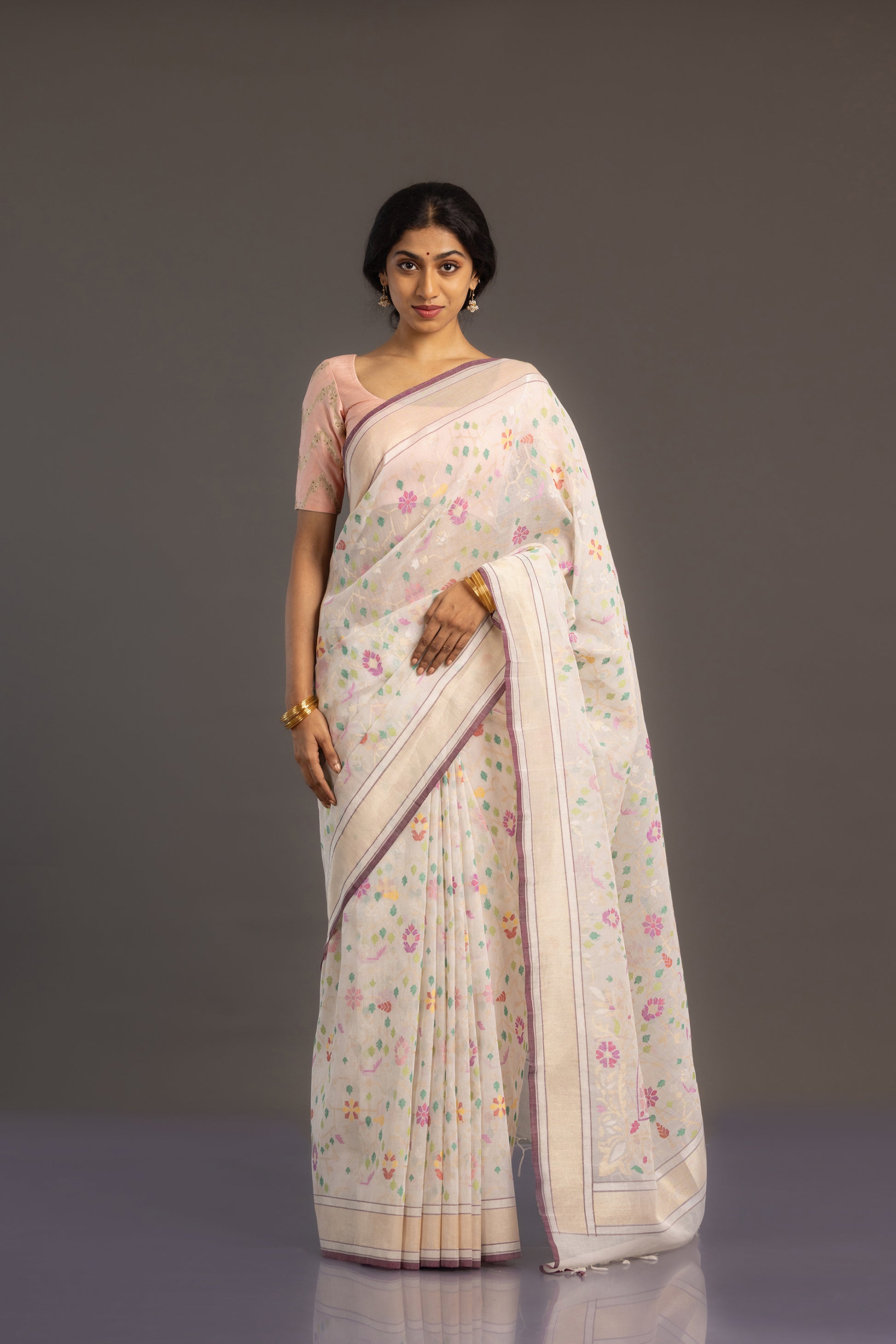 Handloom cotton Jamdani Benarasi saree in white with Jamdani woven all-over floral motifs in Zari and colorful threads. Zari kadi border with contrasting burgundy selvedge. Pallu continues the floral motifs with the Zari kadi border.