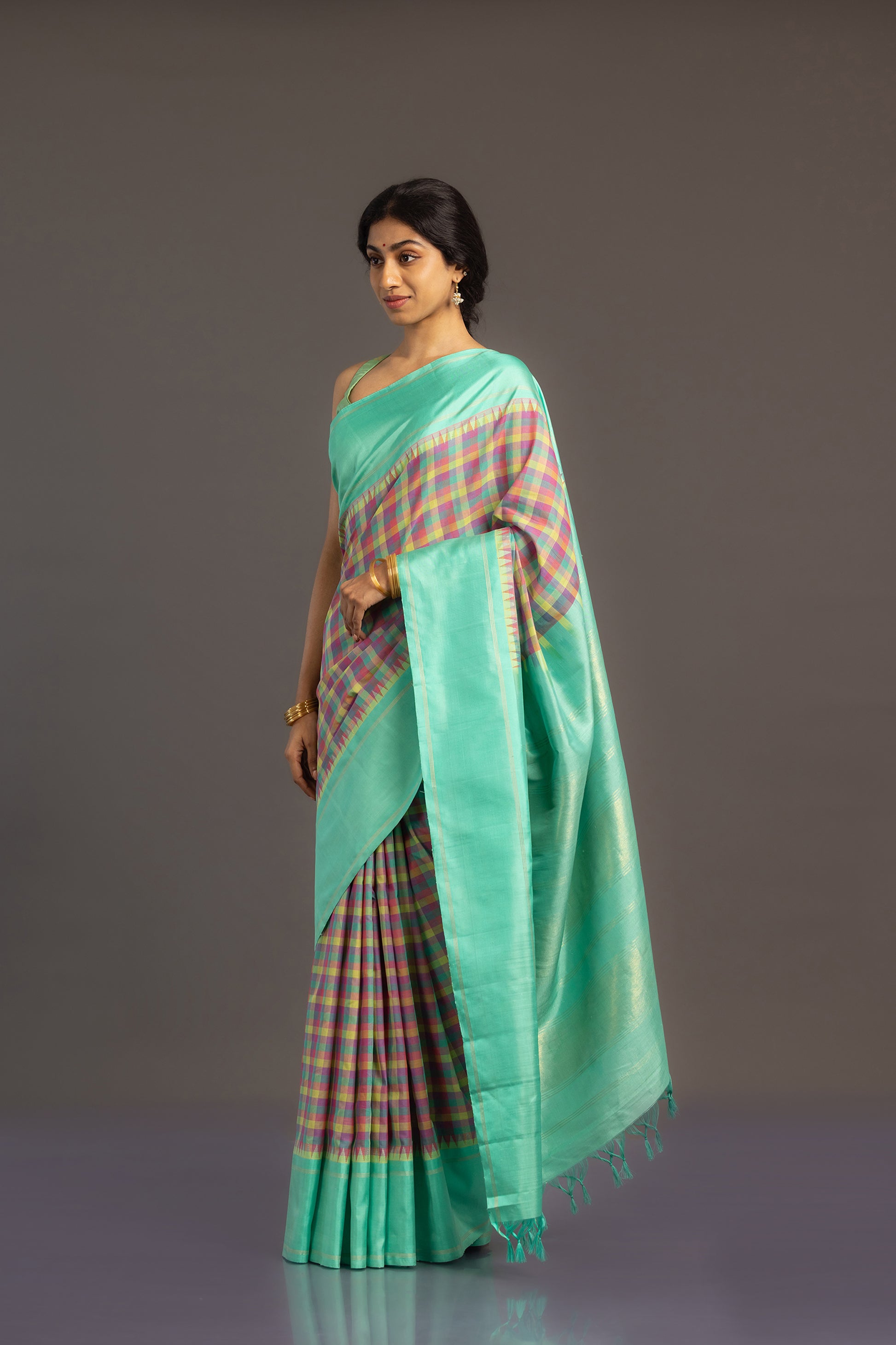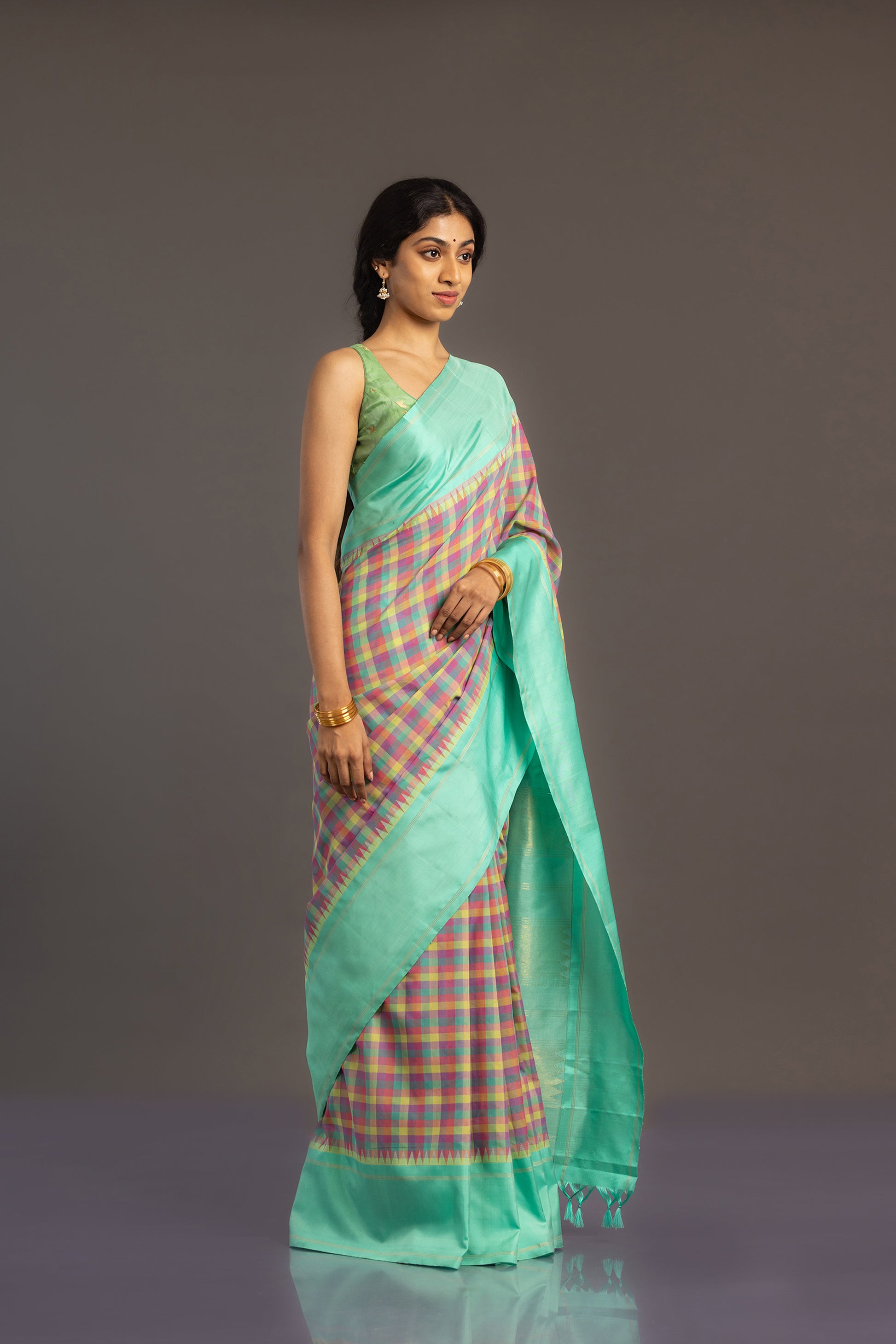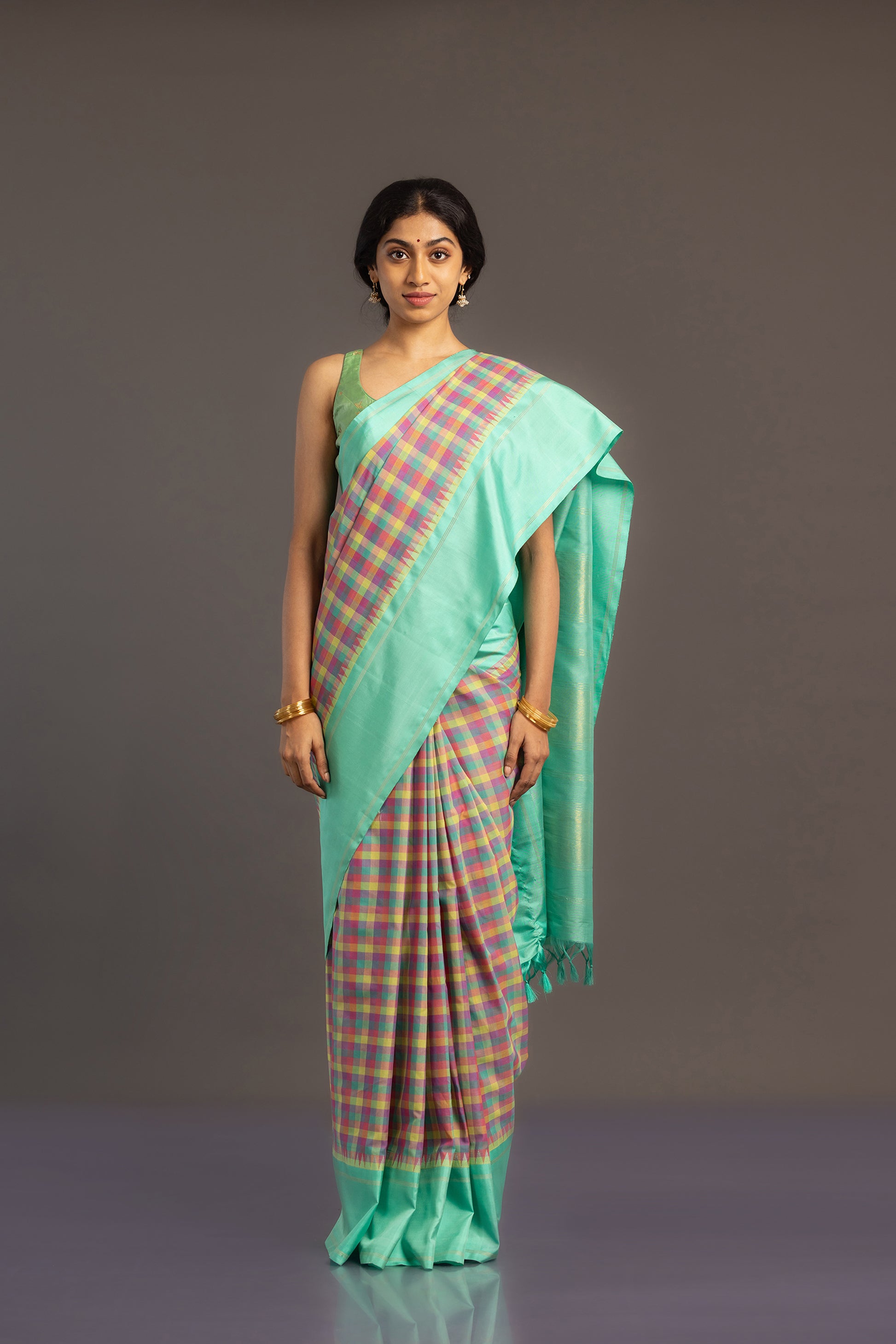 Handloom Kanjivaram cotton saree woven with multi-colored and white checks. Seafoam green border with a gold Zari stripe and traditional seafoam green temple border. Pallu is adorned with Seeprekku (stepped) pattern and alternating gold Zari stripes.