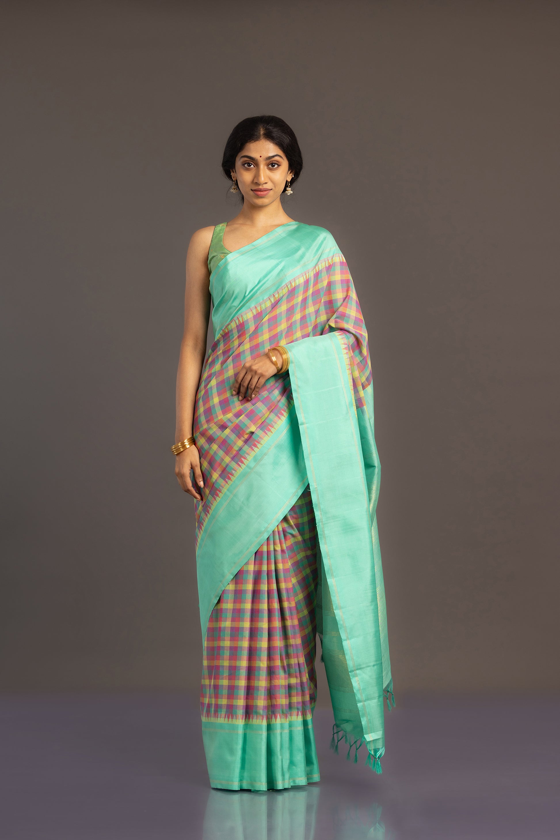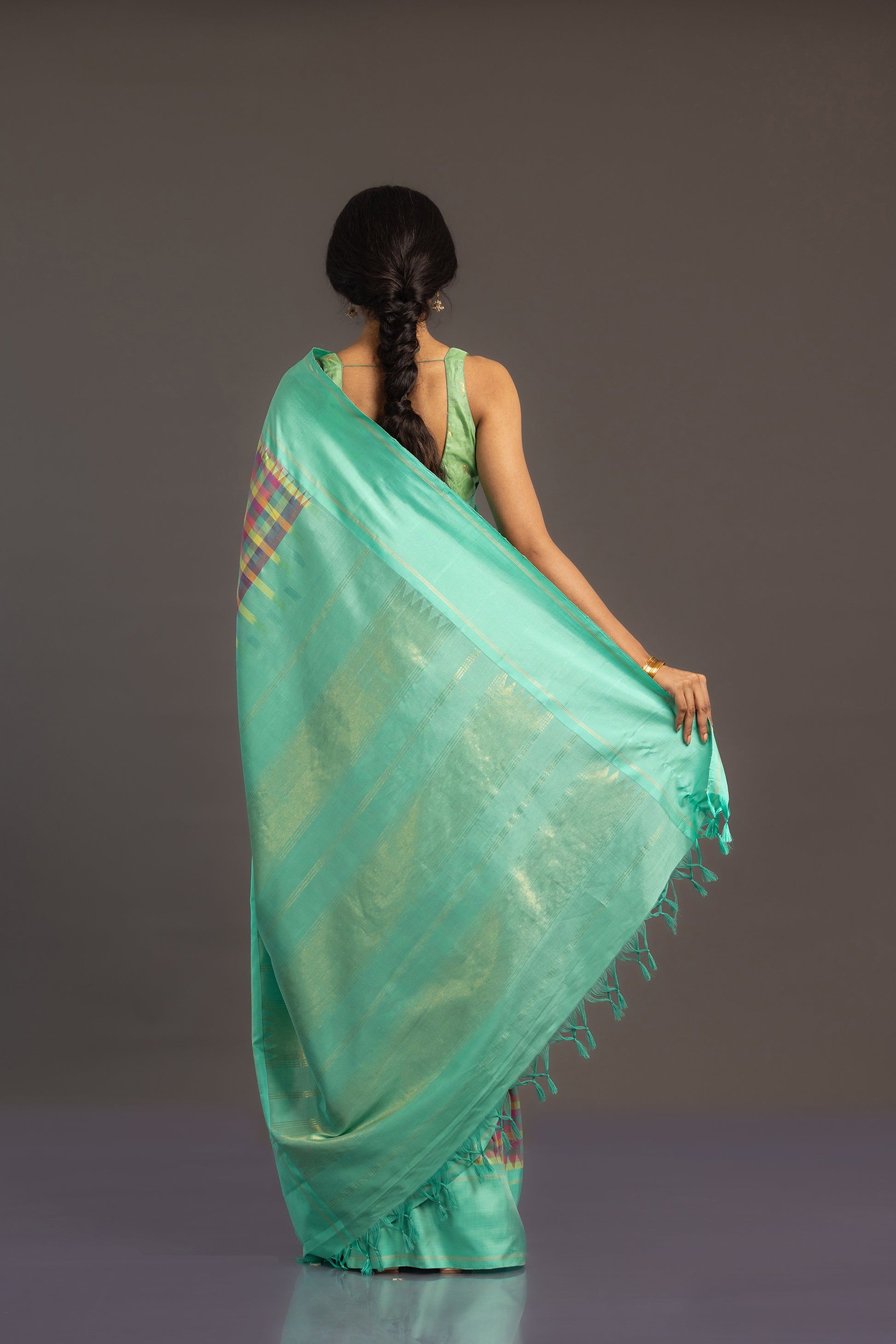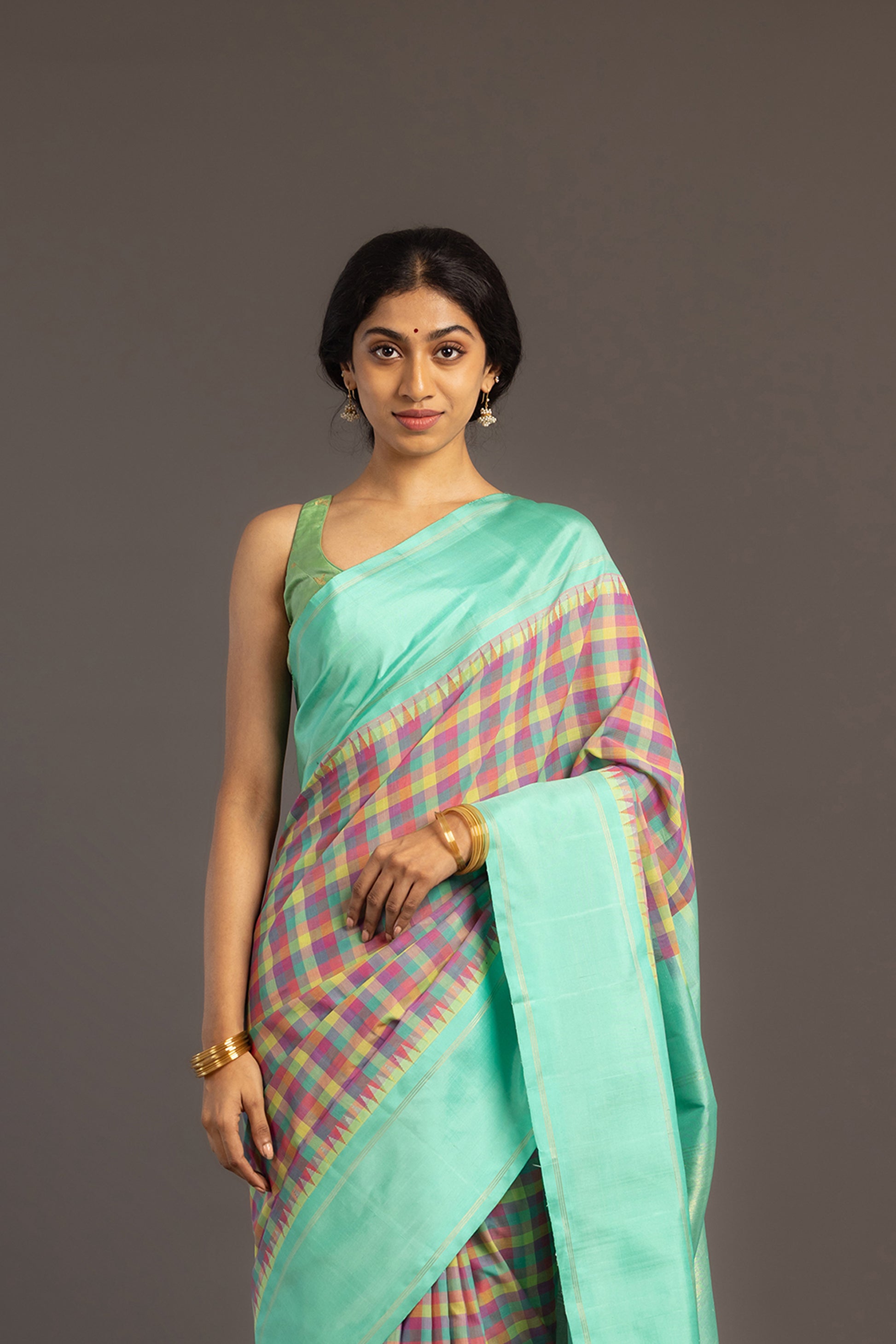 Handloom Kanjivaram cotton saree woven with multi-colored and white checks. Seafoam green border with a gold Zari stripe and traditional seafoam green temple border. Pallu is adorned with Seeprekku (stepped) pattern and alternating gold Zari stripes.