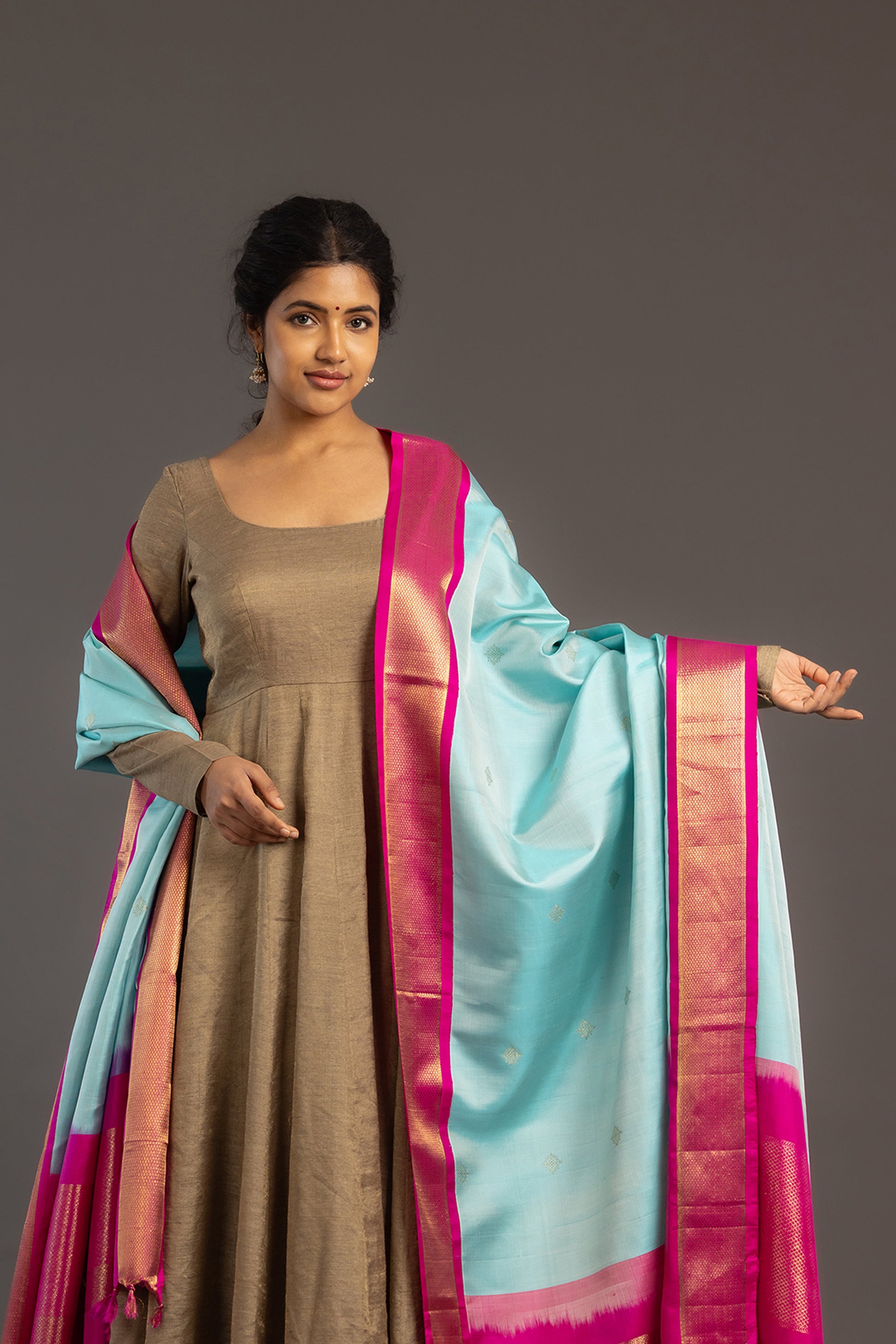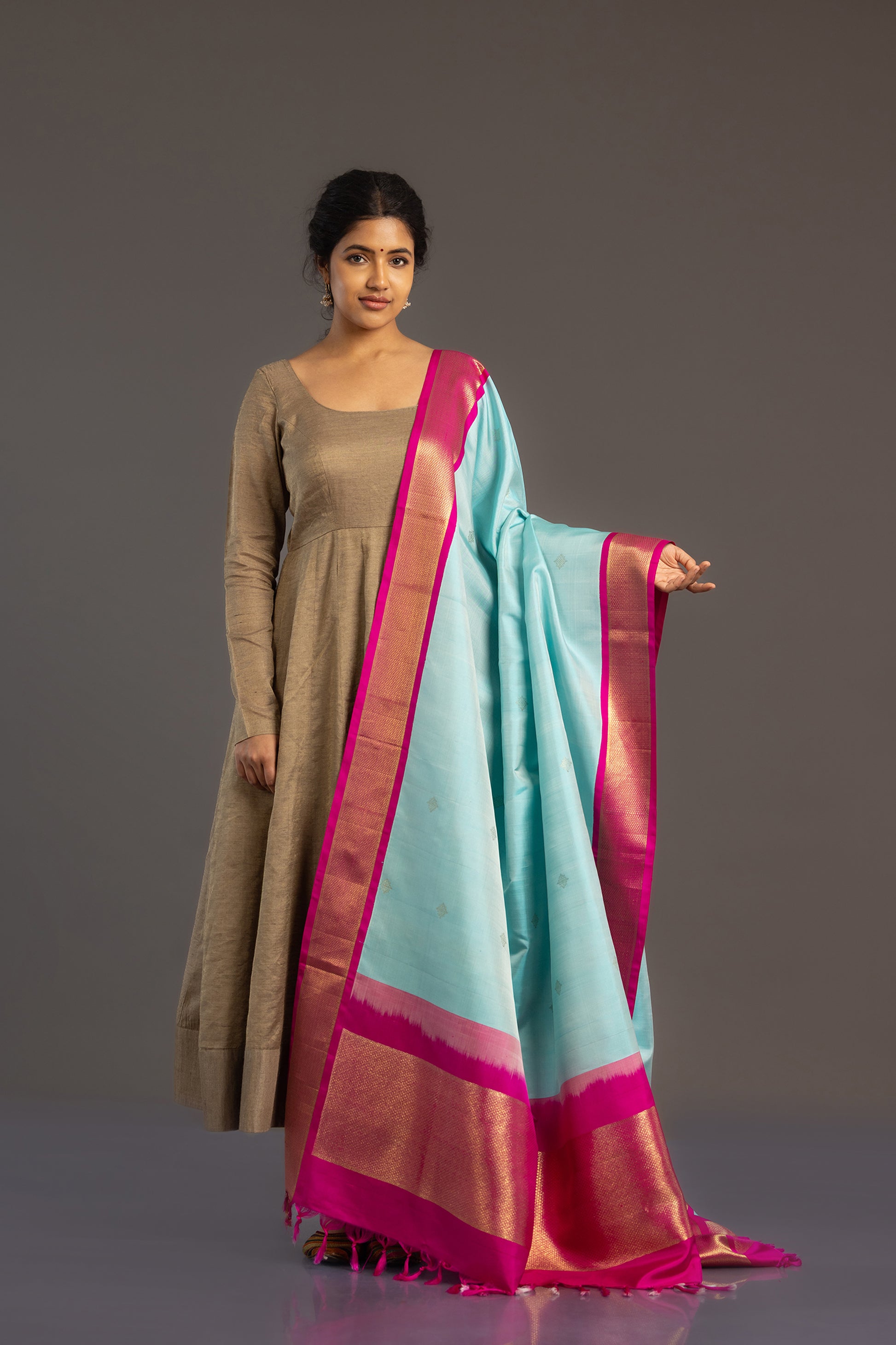 Handwoven Kanjivaram dupatta in sky blue with woven gold Zari motifs. Contrasting pink border with Mayilkann (Peacock's Eye) pattern woven with Zari, flowing into the pallu.