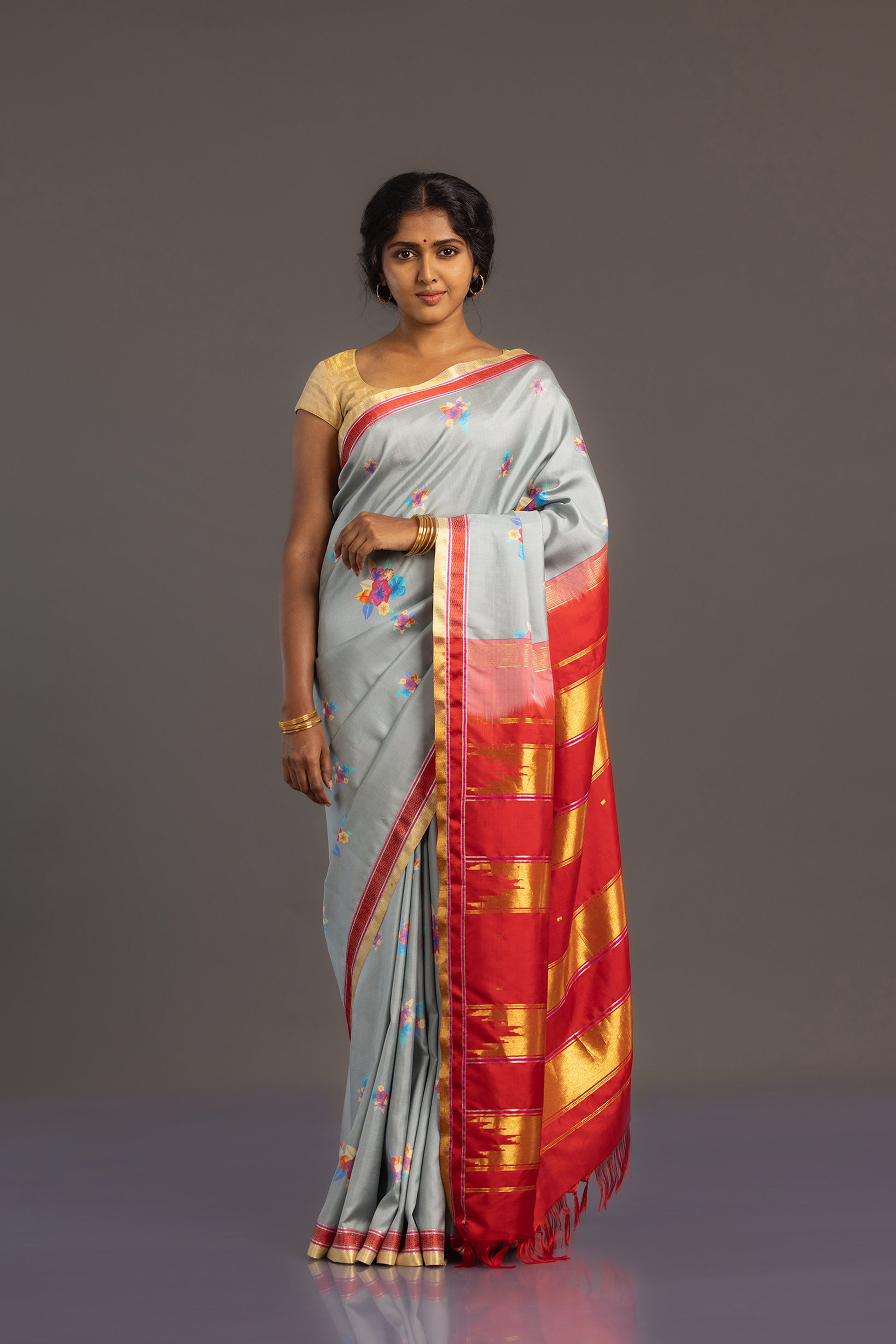 Handloom Kanjivaram printed saree in light blue with a vibrant floral art print.Contrasting red thread border and gold Zari border woven with a geometric pattern. Pallu has Seeprekku band and alternating gold Zari stripes.