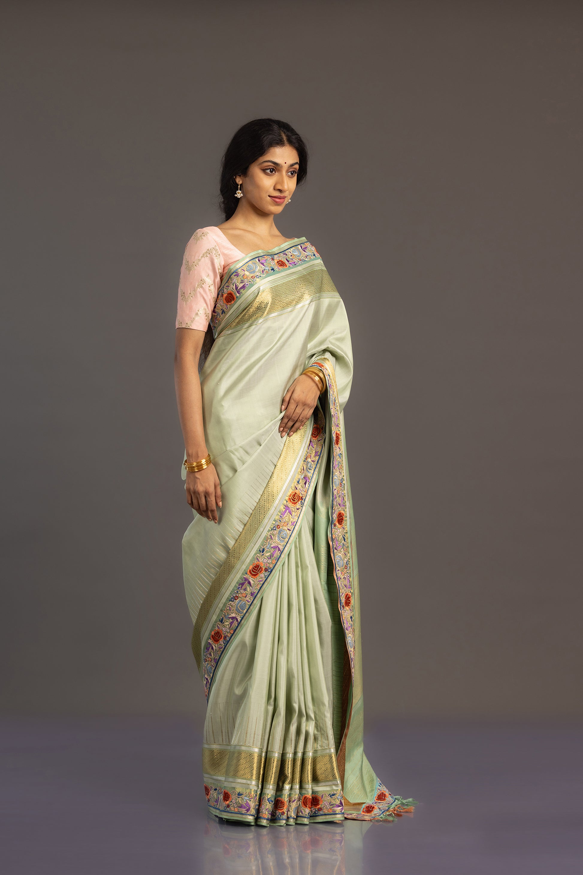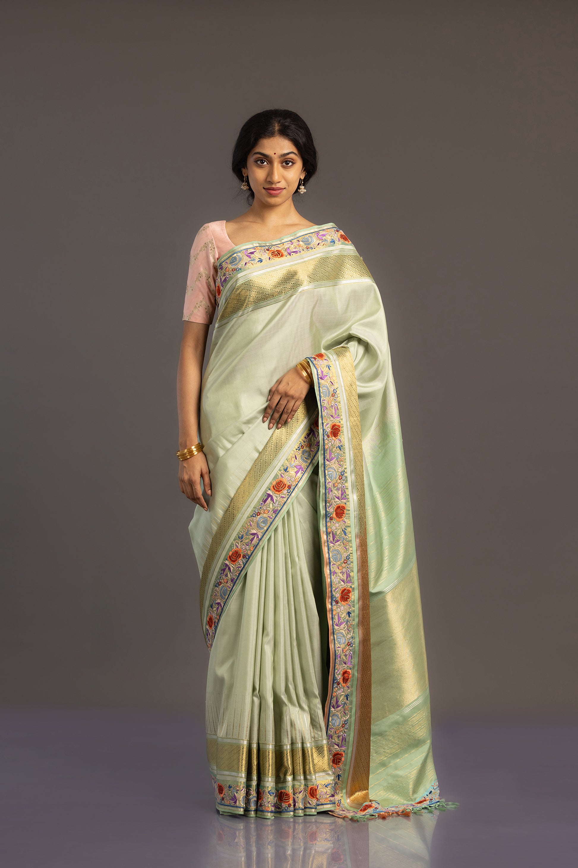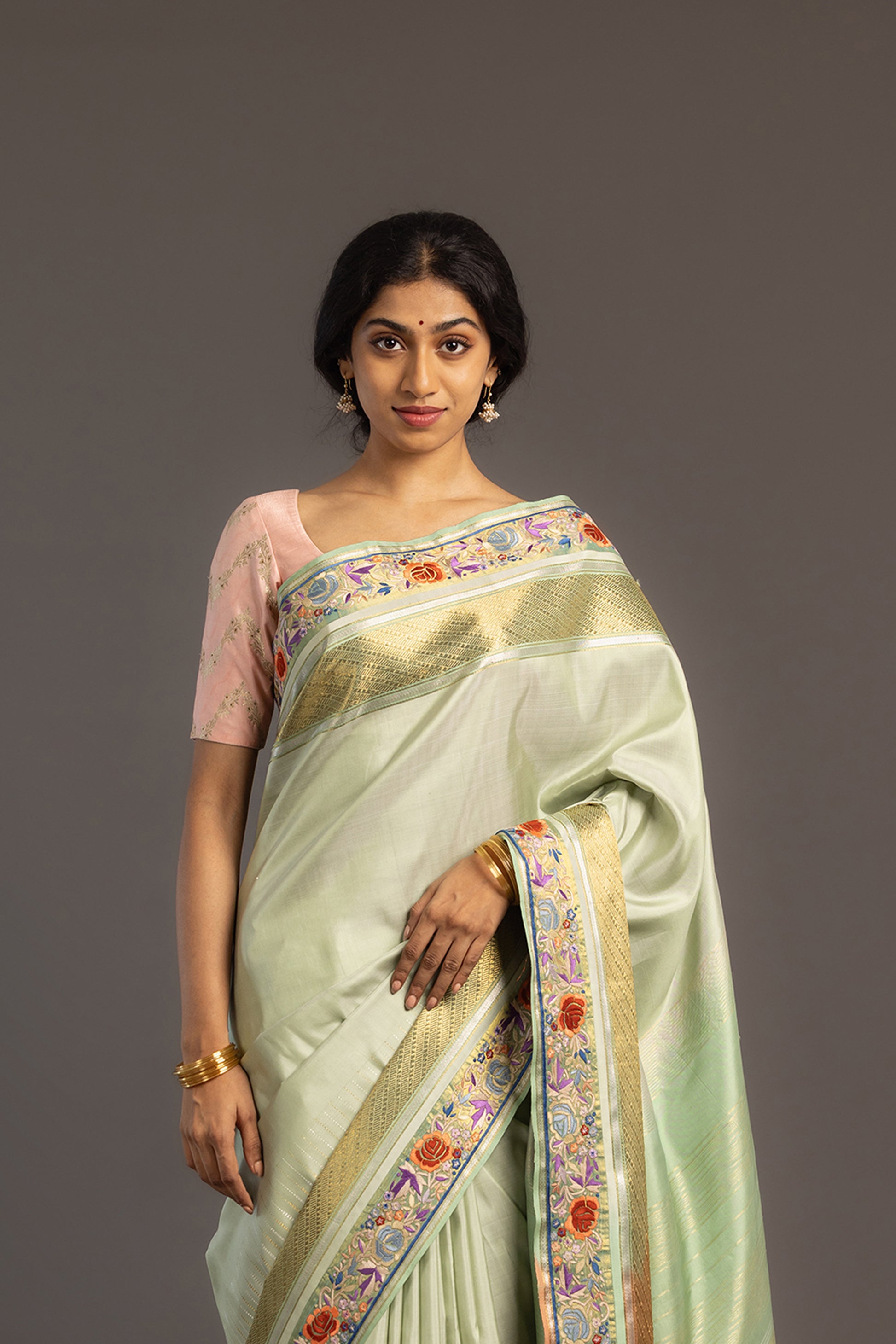 Handwoven Kanjivaram saree in pastel green woven with Zari in a raindrop design. Self-border has a geometric design in Zari and Parsi embroidery. Parsi embroidery and Zari work flows into the pallu.