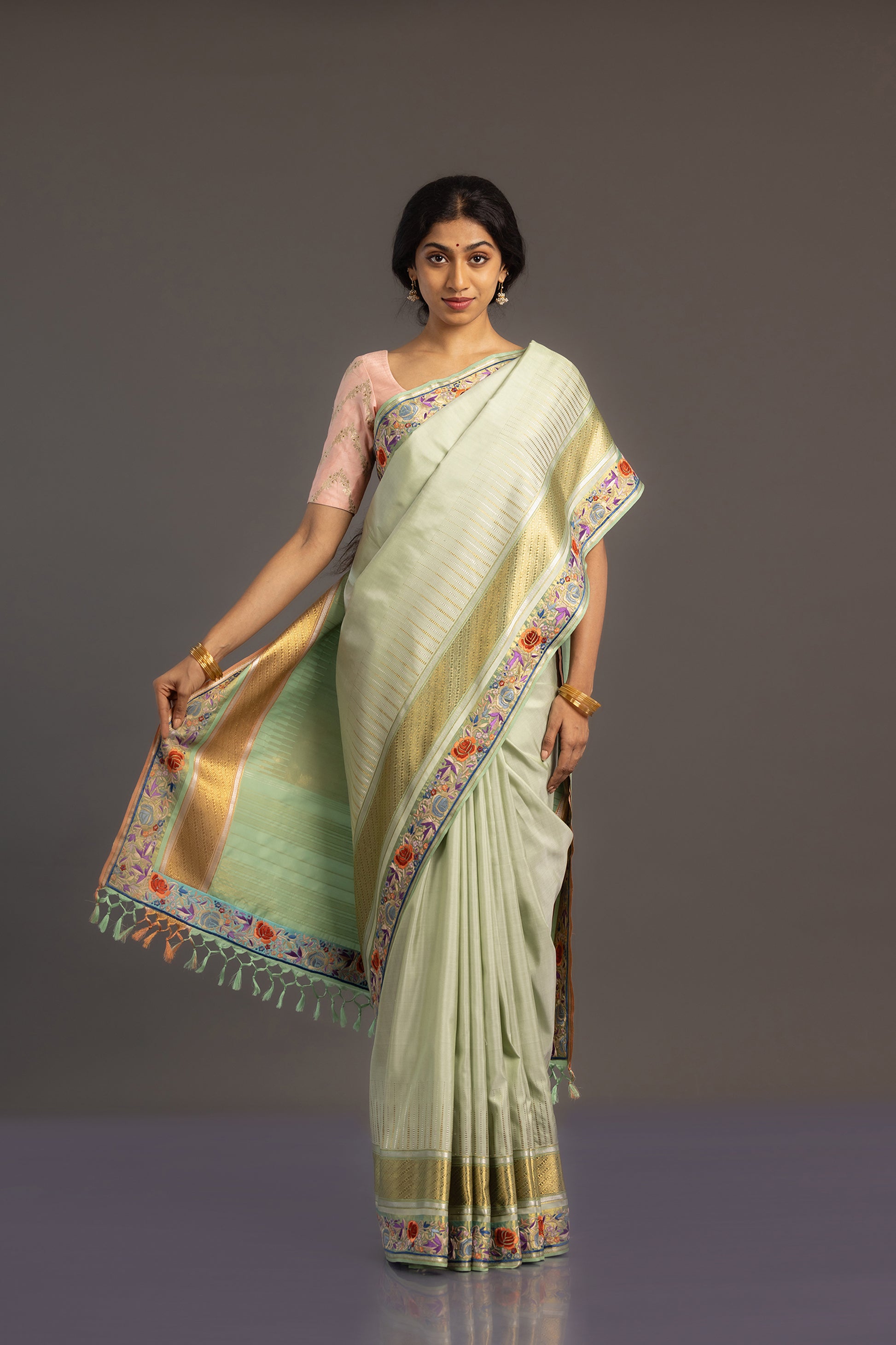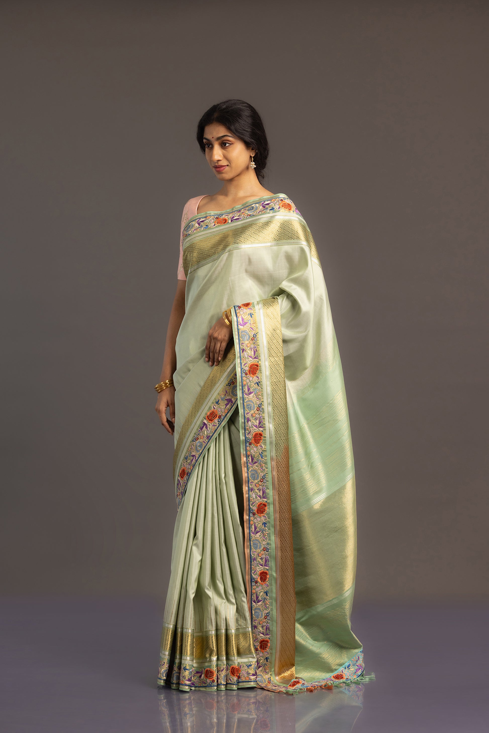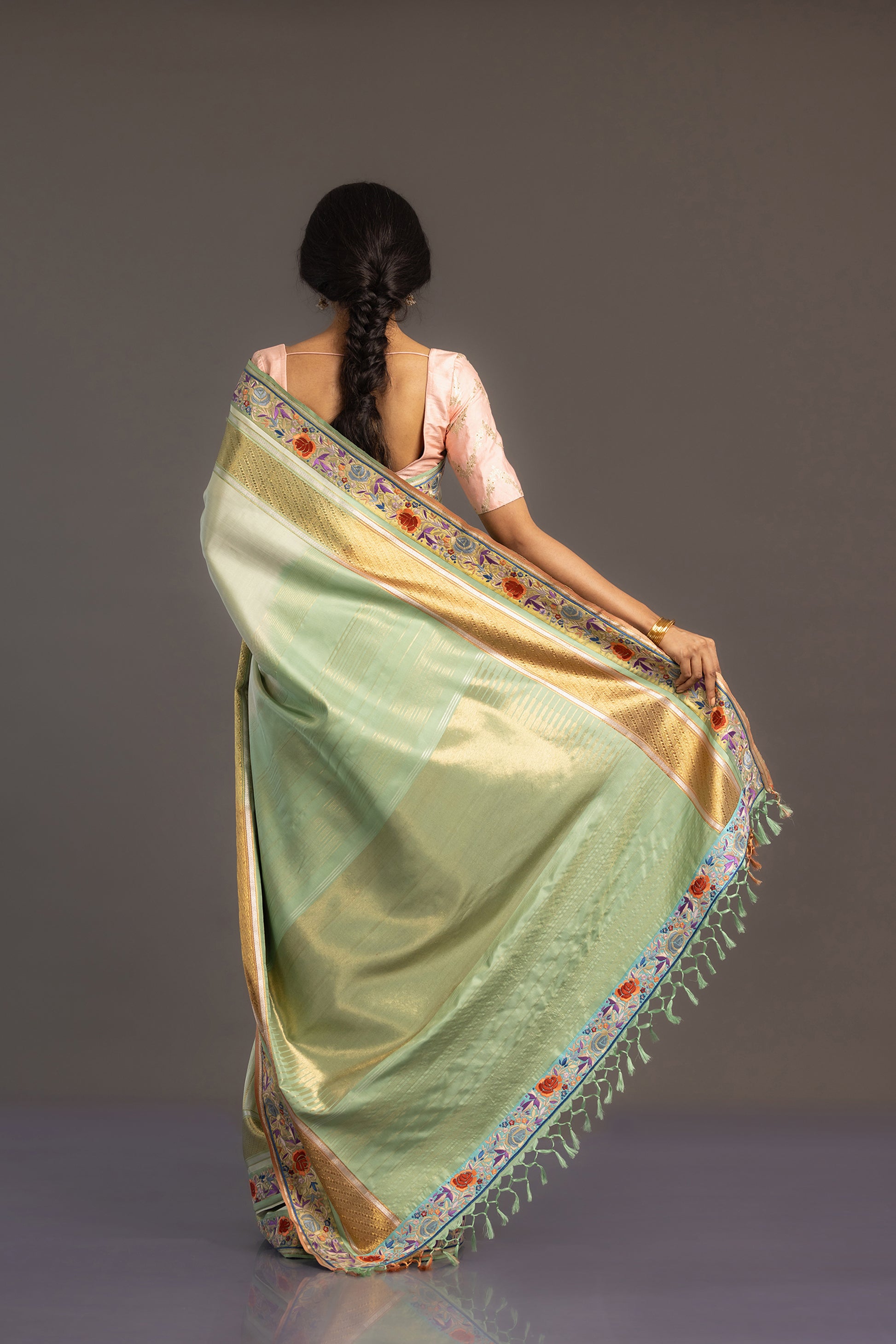 Handwoven Kanjivaram saree in pastel green woven with Zari in a raindrop design. Self-border has a geometric design in Zari and Parsi embroidery. Parsi embroidery and Zari work flows into the pallu.