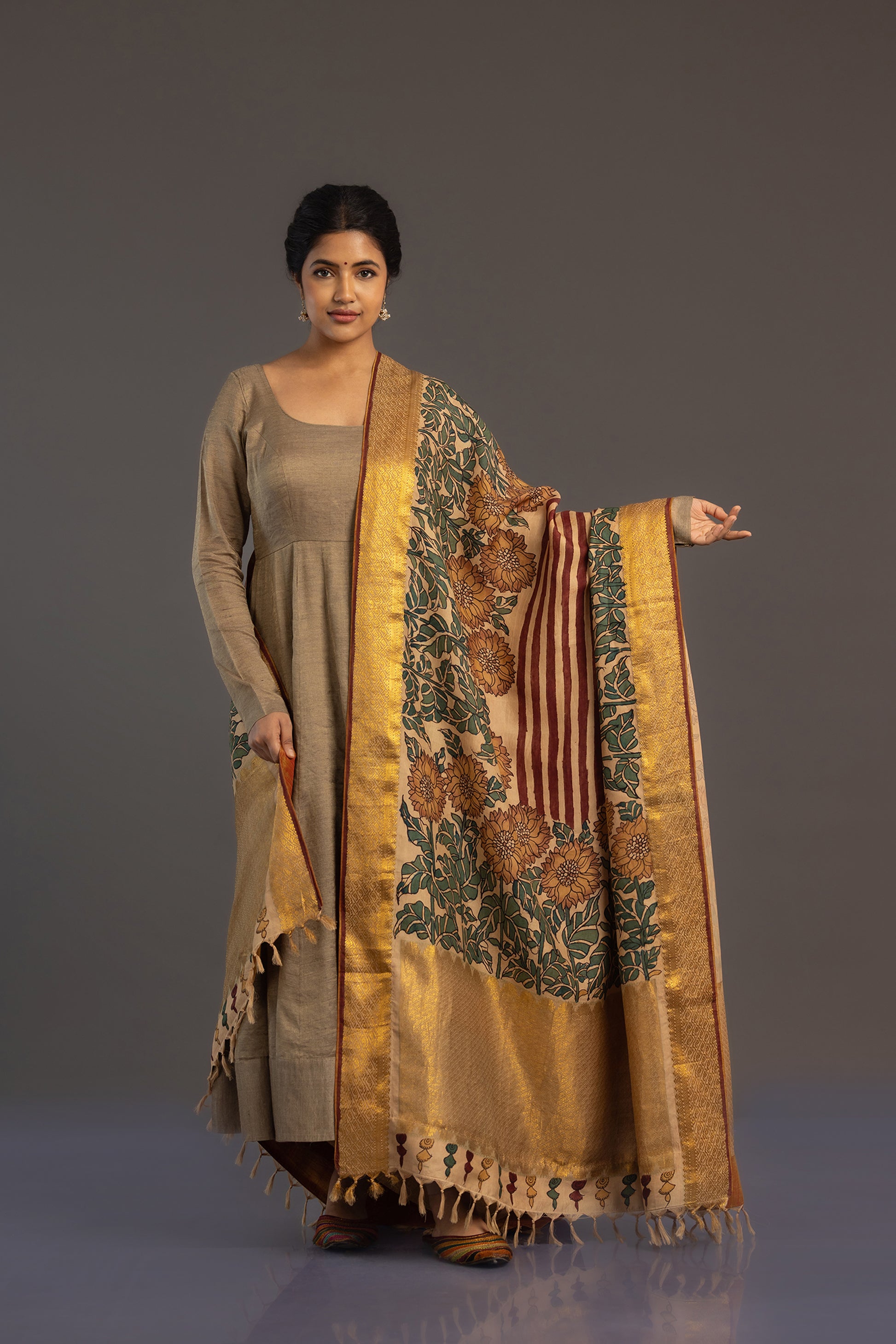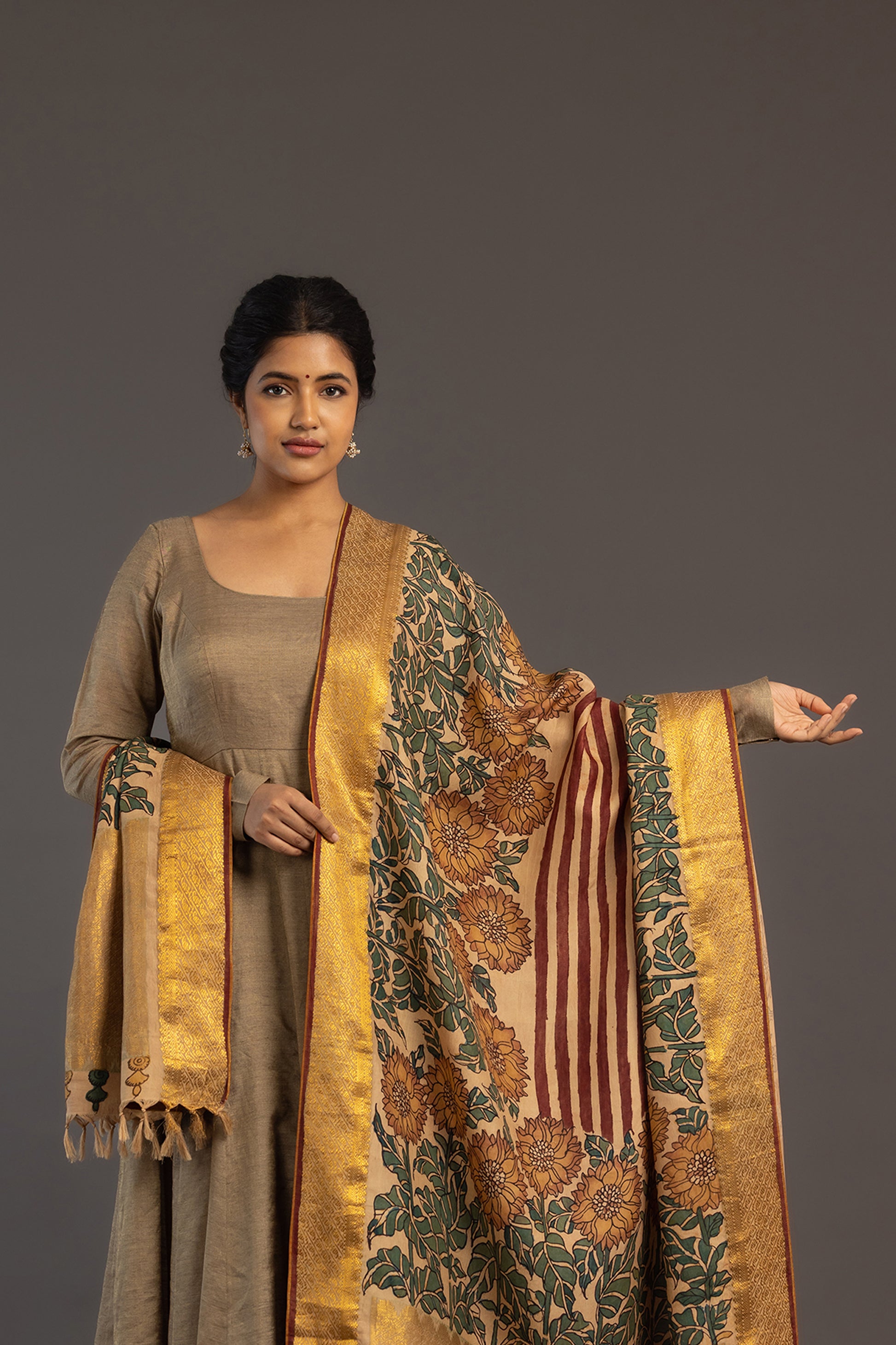 This handwoven Kanjivaram dupatta features a beautiful pen Kalamkari. The dupatta is set on a soft peach backdrop and includes hand-drawn sunflower designs. Maroon stripes flow across, creating depth and contrast. The borders are woven with graceful Manga (mango) stripe designs and the Kanjivaram weaving technique and framed with a deep maroon selvedge. The pallu features sunflower pen Kalamkari and a woven panel of Manga stripes accented with a well-placed pen Kalamkari pattern.