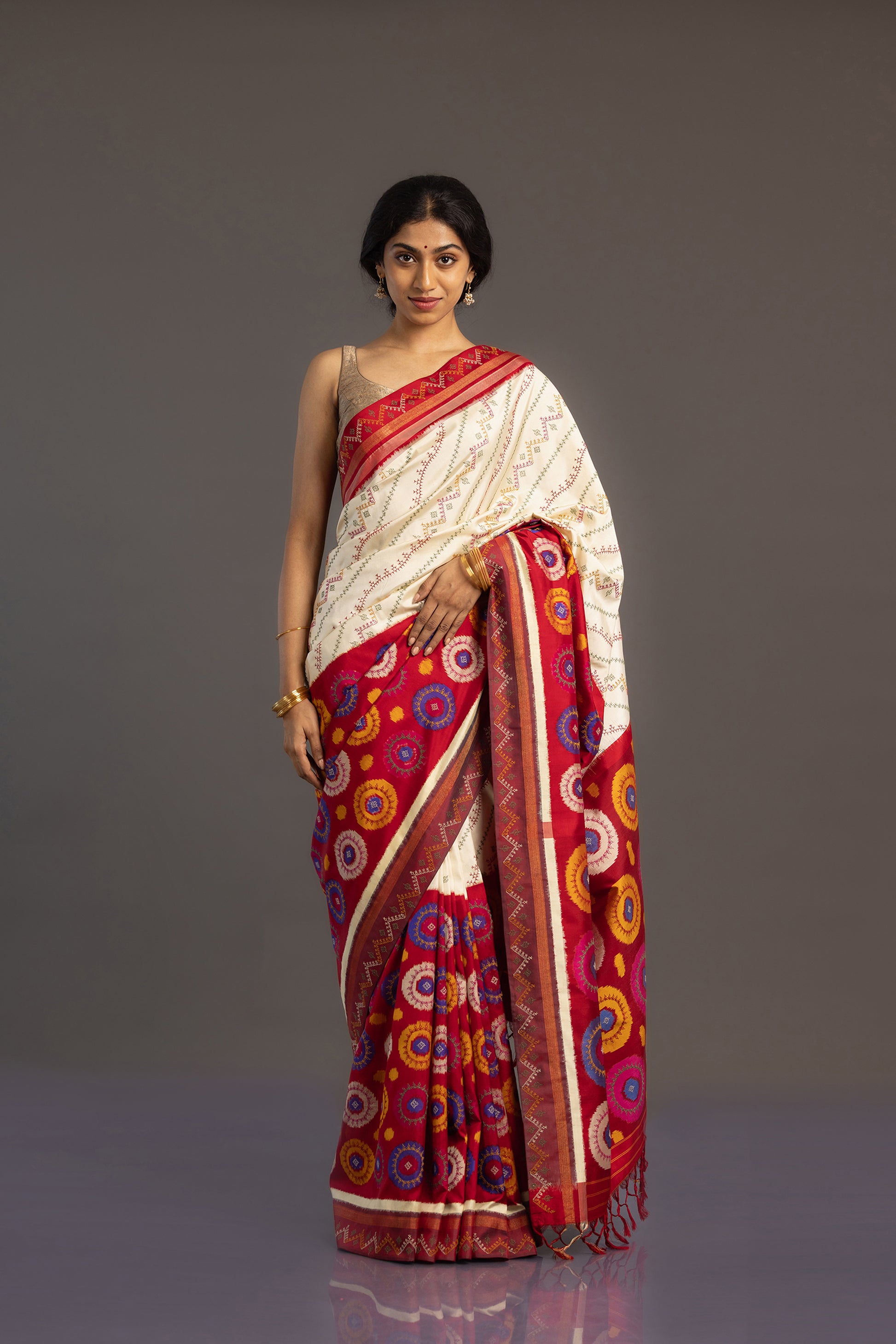 Handloom Ikkat saree in off-white with Dharwad embroidery in modern diagonal designs. Contrasting upper border with red Ikkat weaving, Zari accents, and a white thread band. Bottom border features a deep maroon background interlaced with a red border with Ikkat designs, and both borders are embellished with contrast-colored thread Dharwad embroidery. Pallu has woven Ikkat circular patterns in contrast color threads and embellished with Dharwad embroidery.