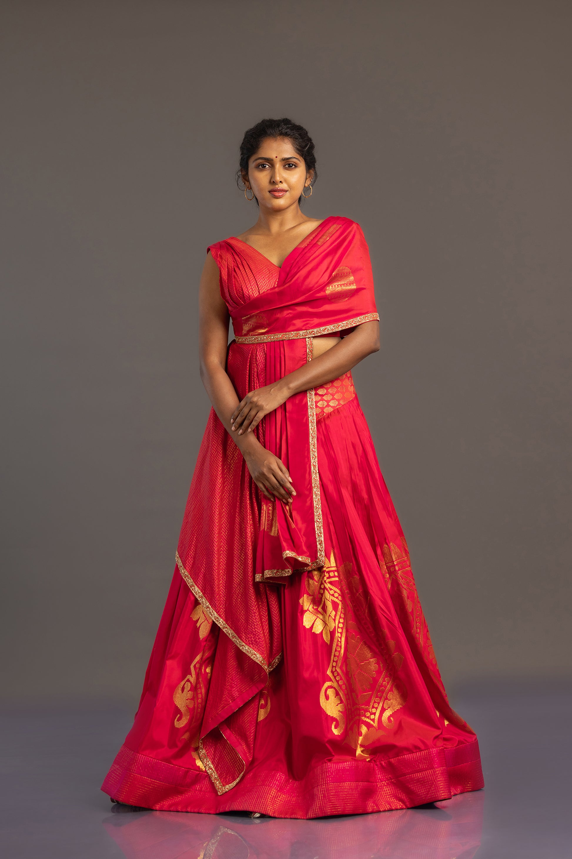 The pre-pleated drape is designed for easy wear, ready-to-wear lehenga style. This suit, worn with a pre-pleated draped blouse, has a one-of-a-kind mix of check-pattern Kanjivaram weave and motif-rich Kanjivaram fabric, finished with a carefully hand-embroidered border that gives a touch of artisanal delicacy.