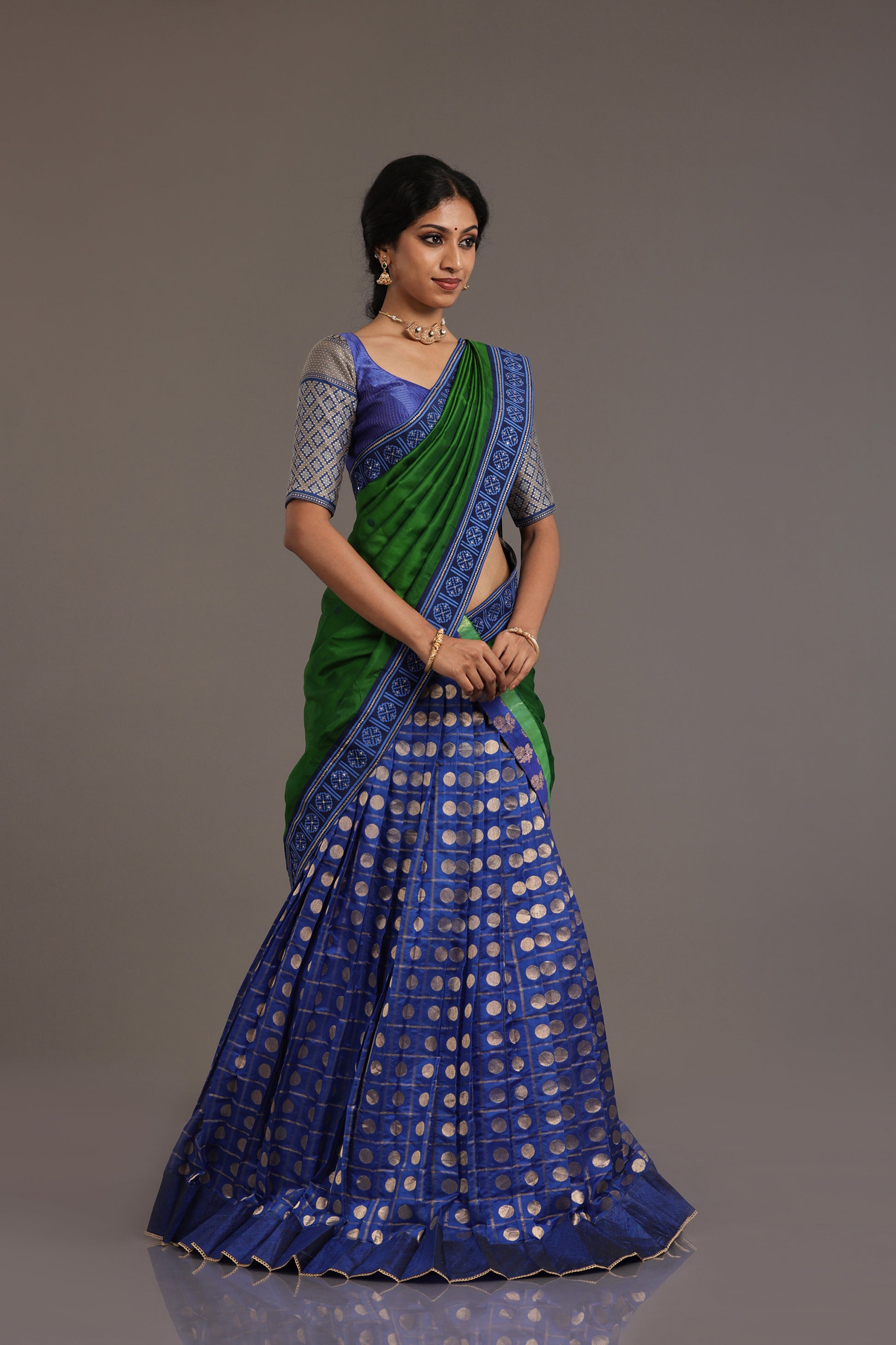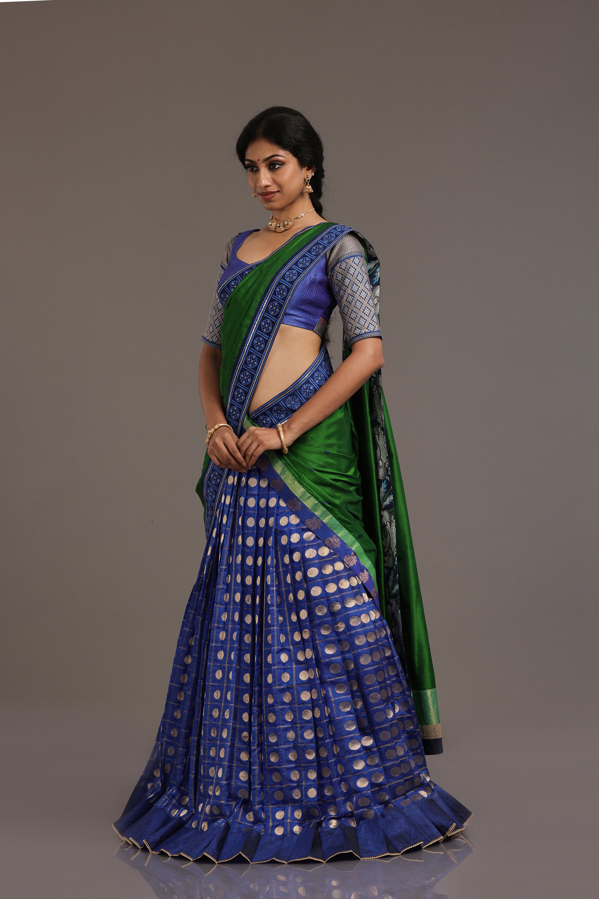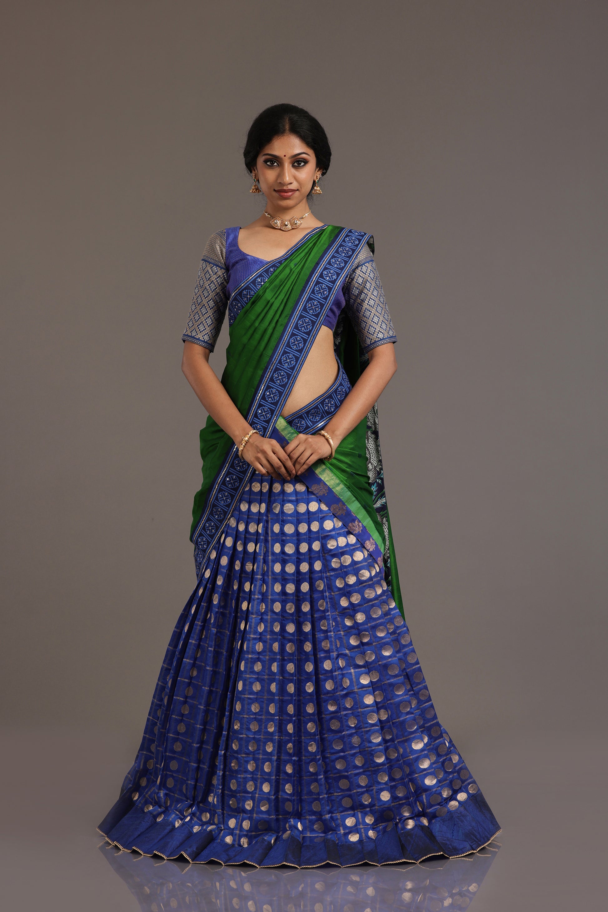 The outfit is completed with a Kanchi blouse in a complementary blue backdrop, woven with classic Zari checks and embellished with sumptuous Benarasi sleeves for a statement look.