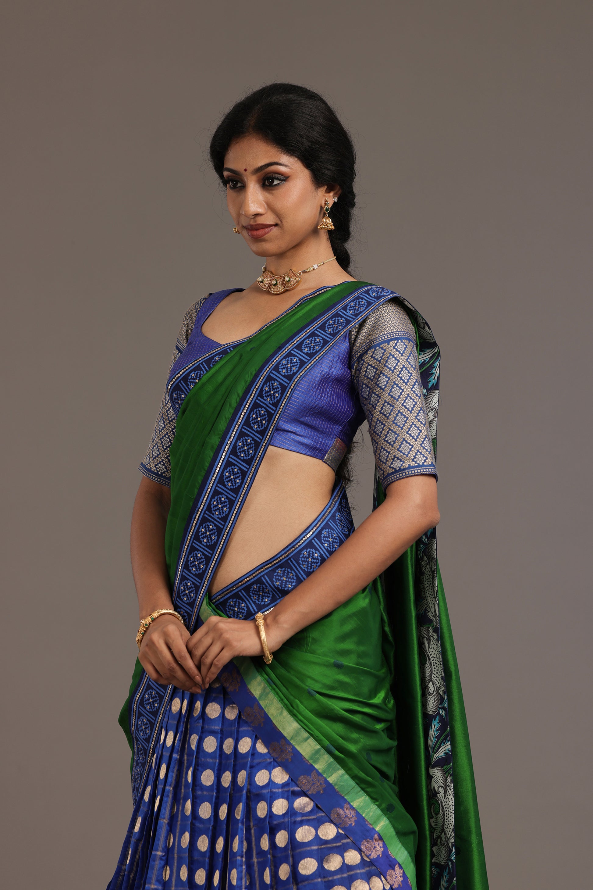 Kanchi blouse in blue with woven Zari checks woven and Benarasi sleeves.
