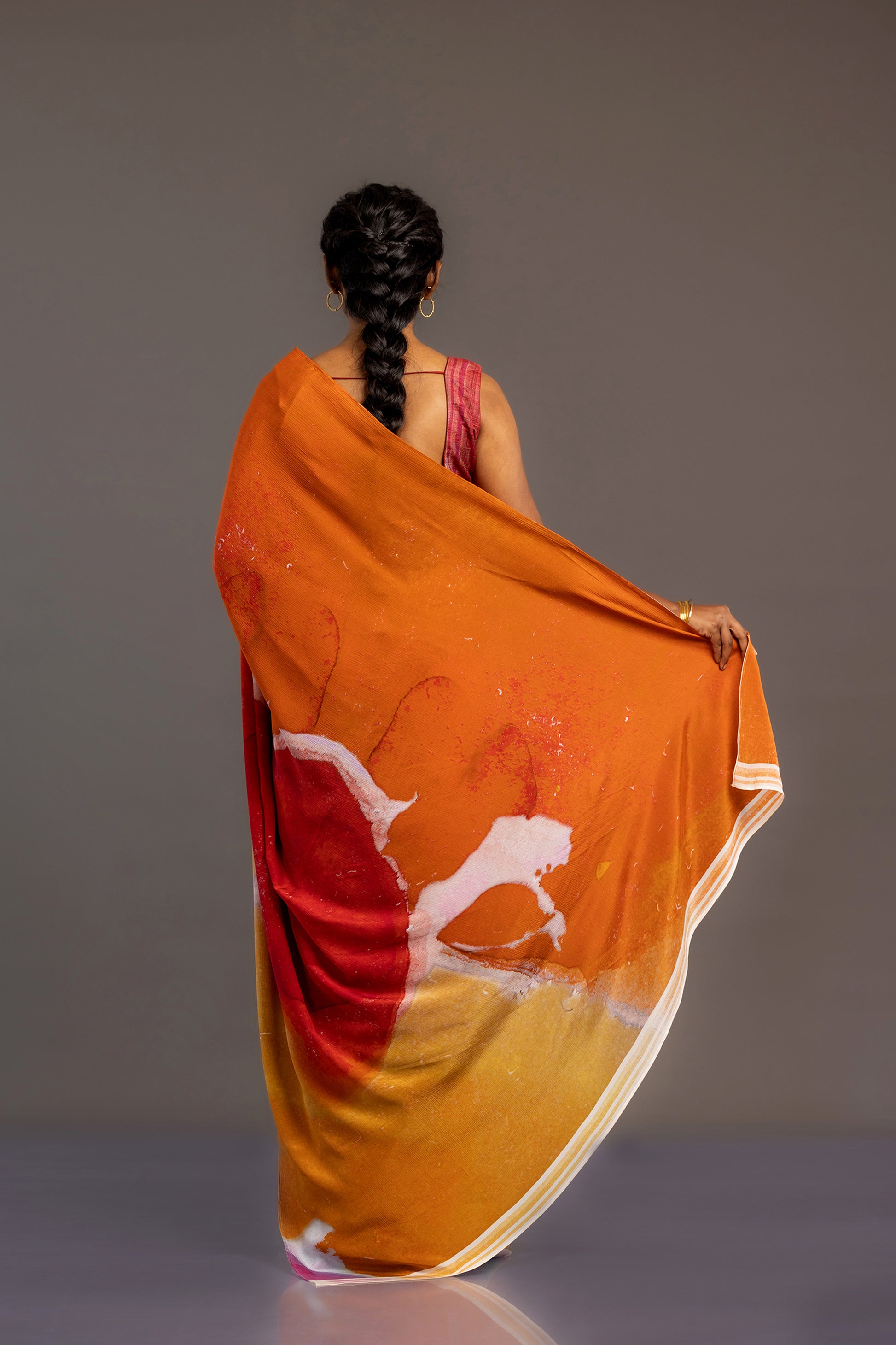 Pure chiffon orange saree with a modern art print that continues onto the pallu.