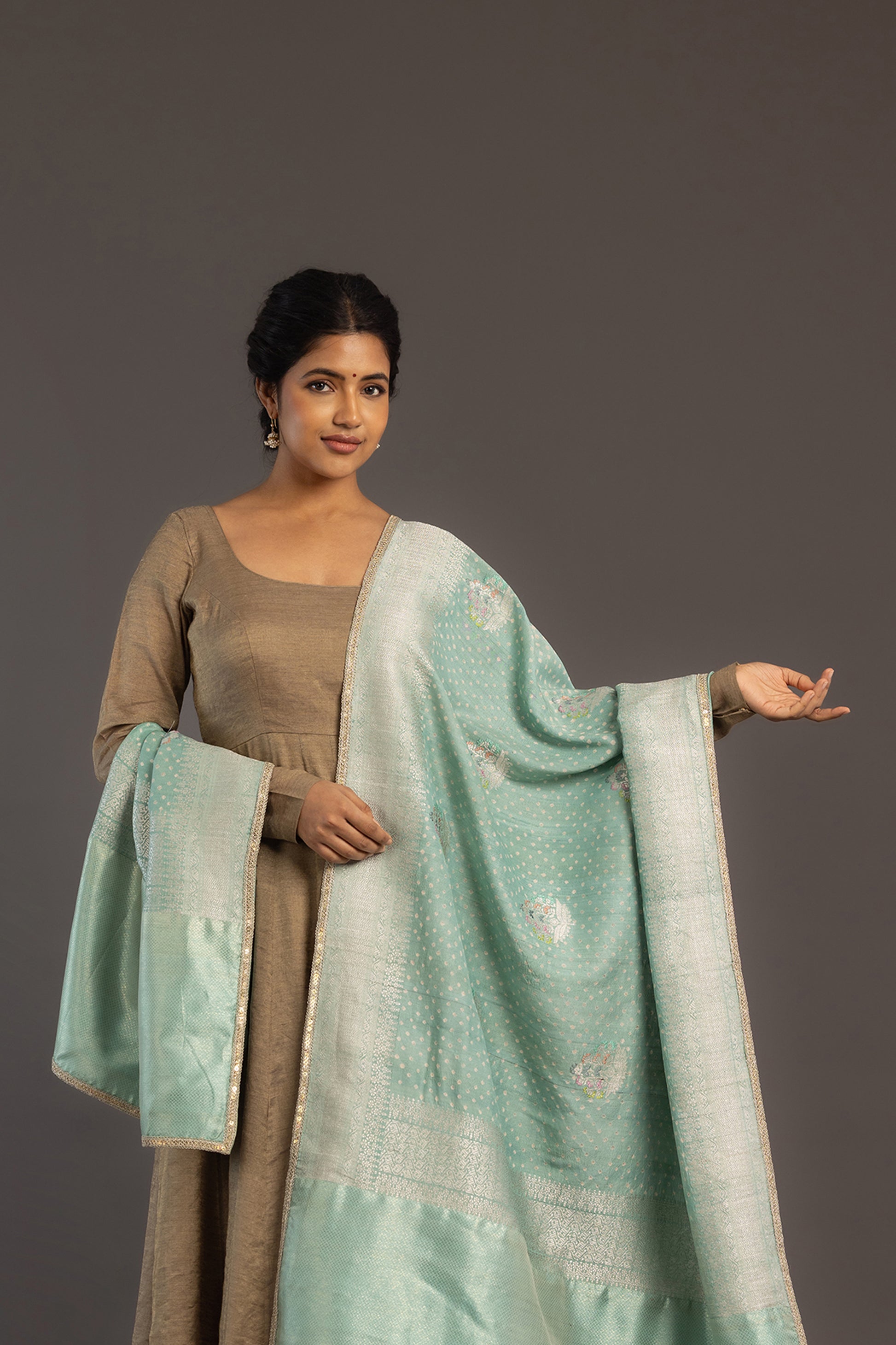 Handwoven Benarasi dupatta in ice blue with tie & dye Bandhini. Embellished with Benarasi flower motifs and woven Meenakari detailing. Woven Benarasi border with silver dori lace. Pallu has a Benarasi border, a woven Kanchi panel, and silver dori lace.