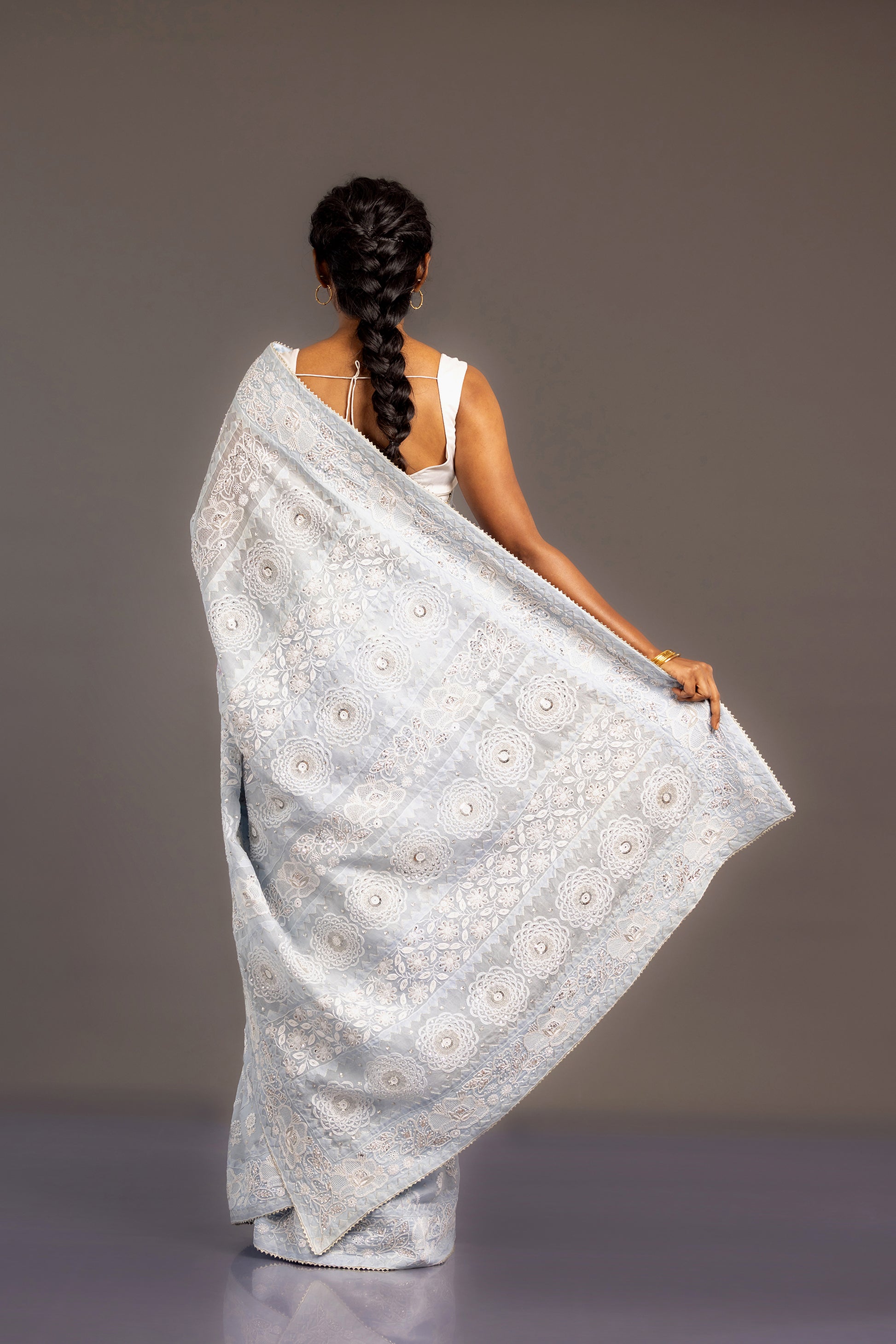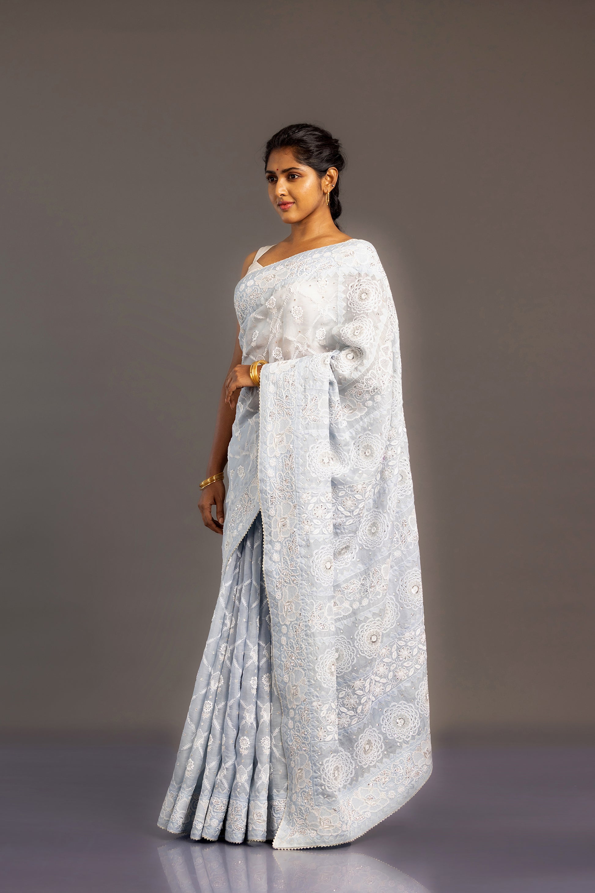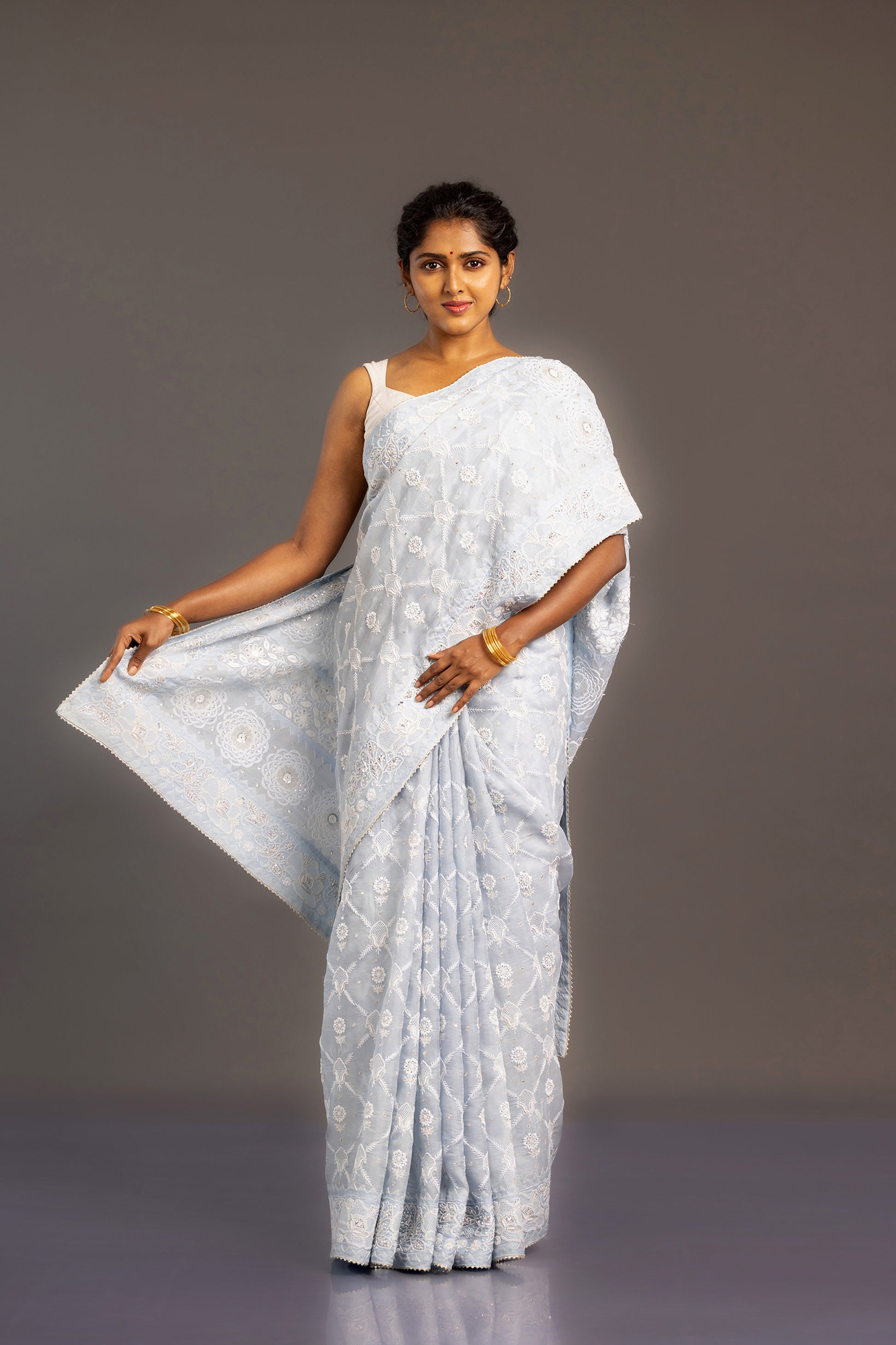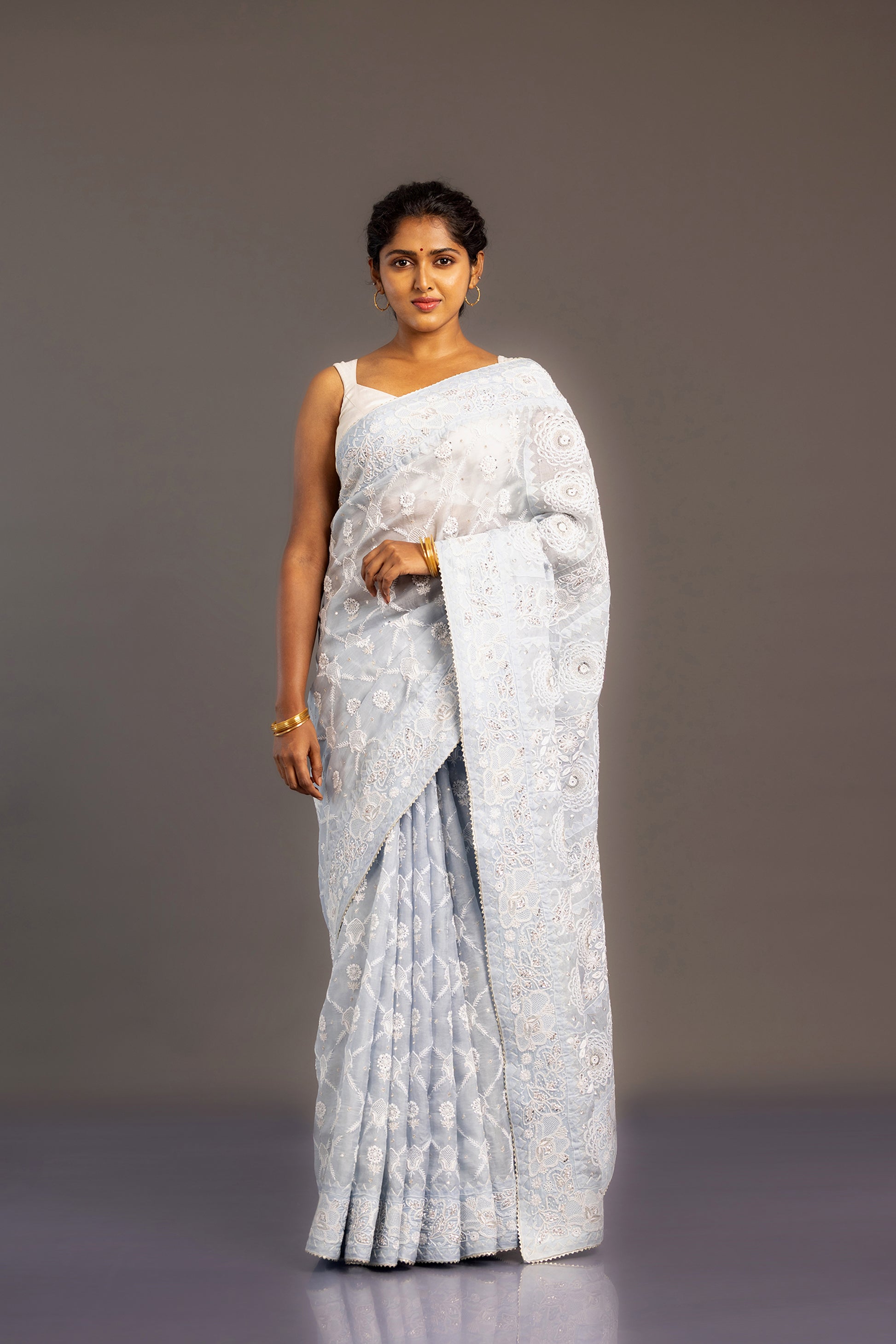 Pure organza saree in light blue, embellished with handmade Chikankari embroidery. All-over contemporary check pattern, with each section containing floral designs. Self-border with floral and temple-inspired motif embroidery. Pallu has flower motifs hand-embroidered in Chikankari and accented with sequin work