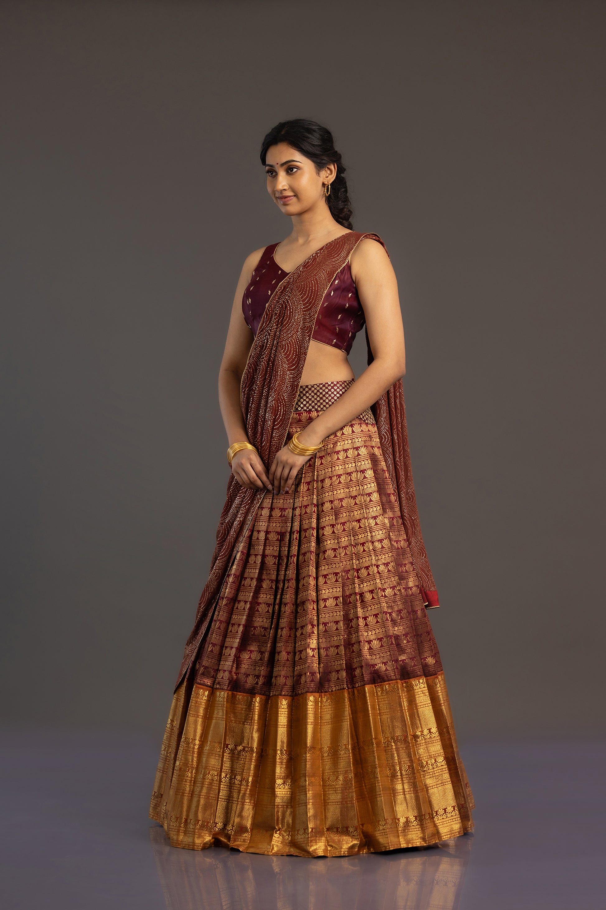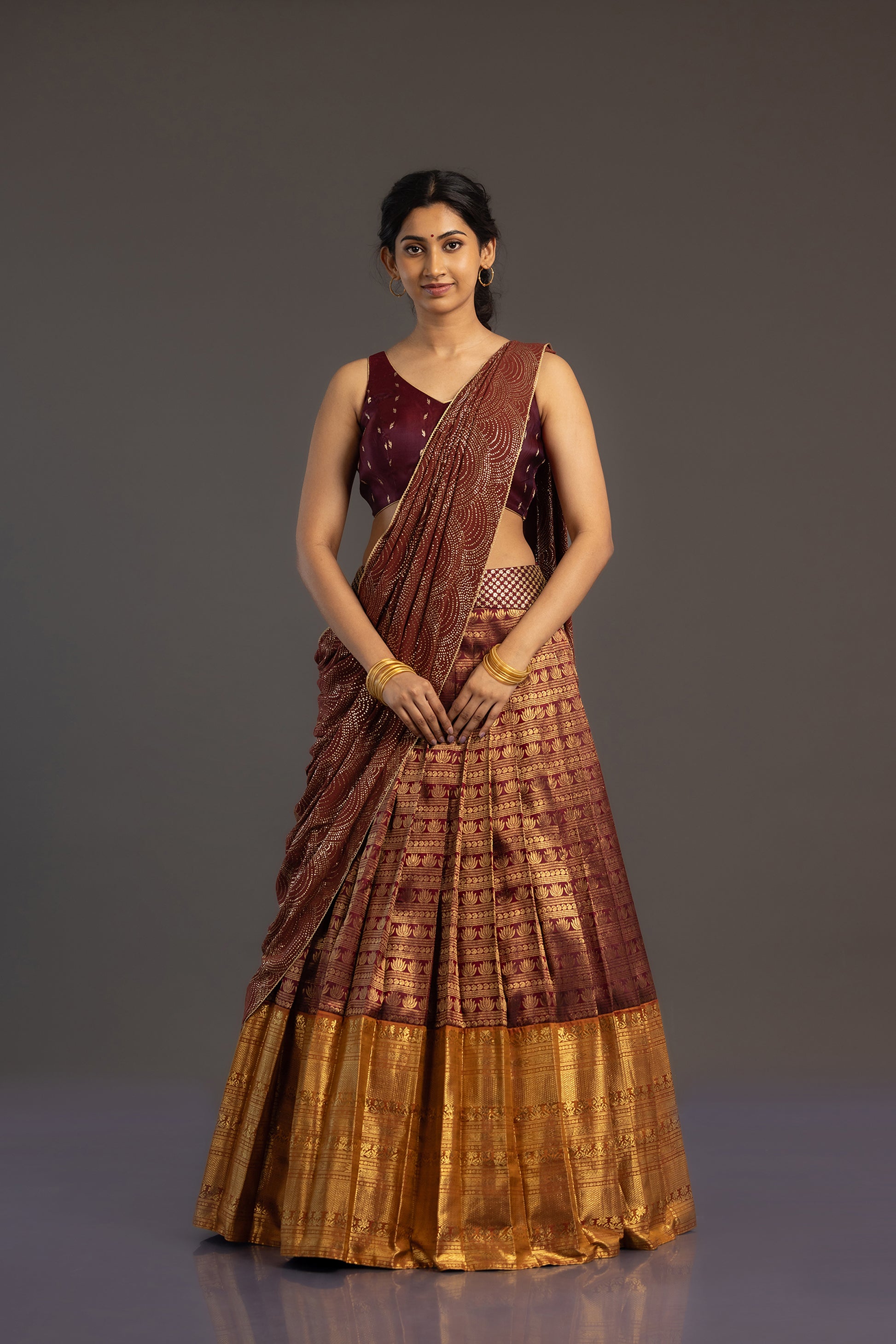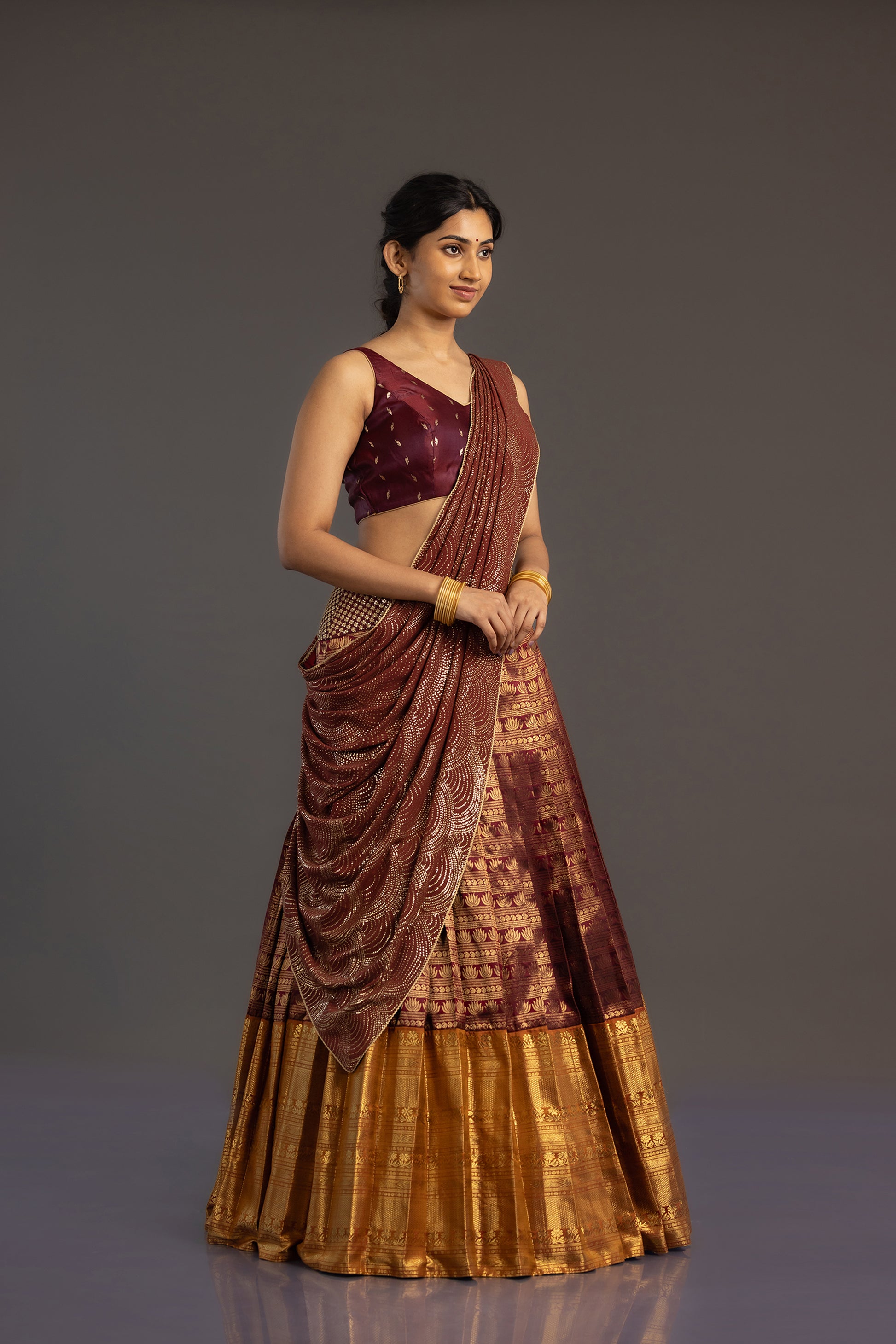 The set is finished with a Benarasi blouse in a deeper shade of maroon, embellished with classic Zari motifs that combine the ancient textile traditions of Kanchipuram and Benaras.