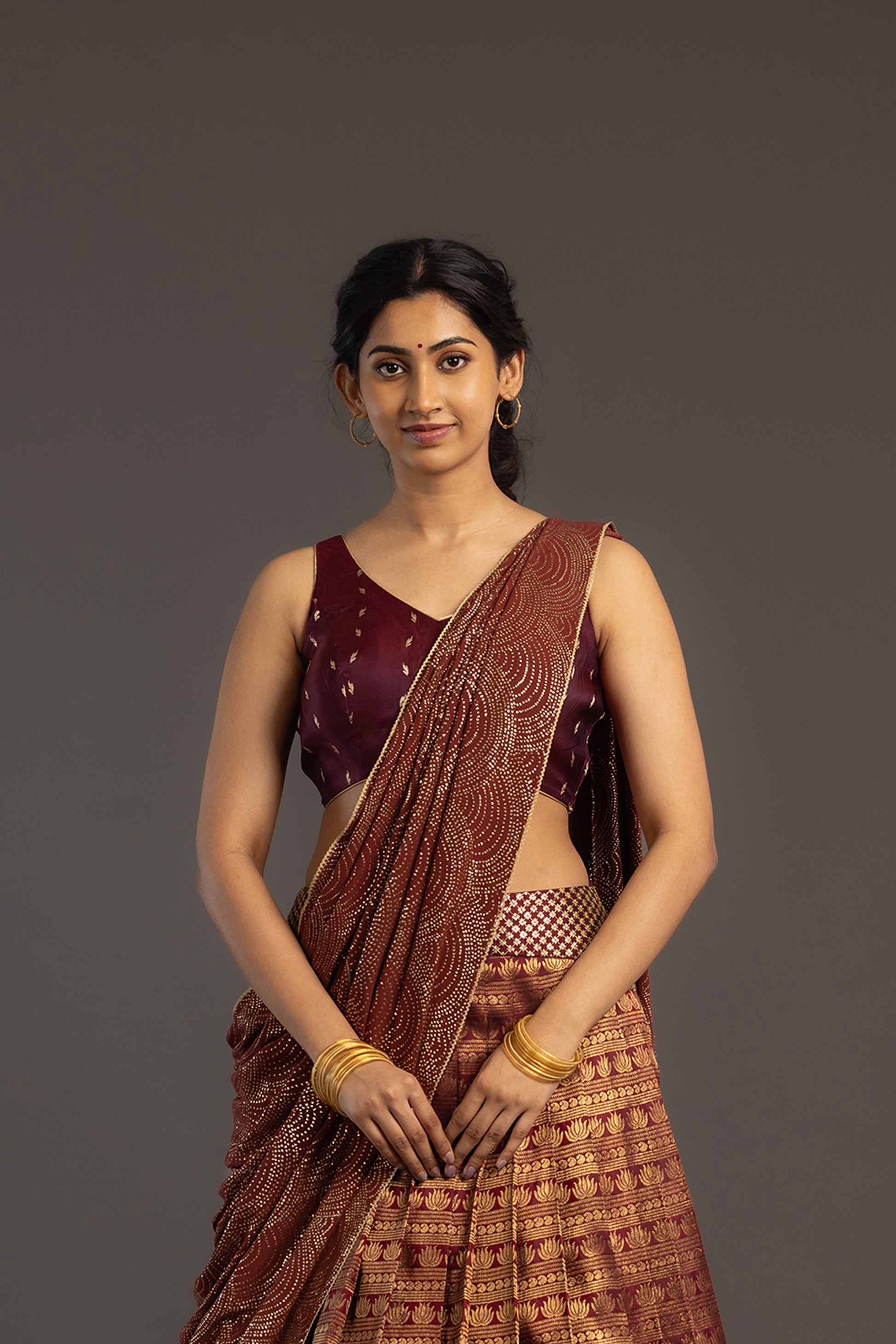 Benarasi blouse in a deeper shade of maroon, with classic Zari motifs.
