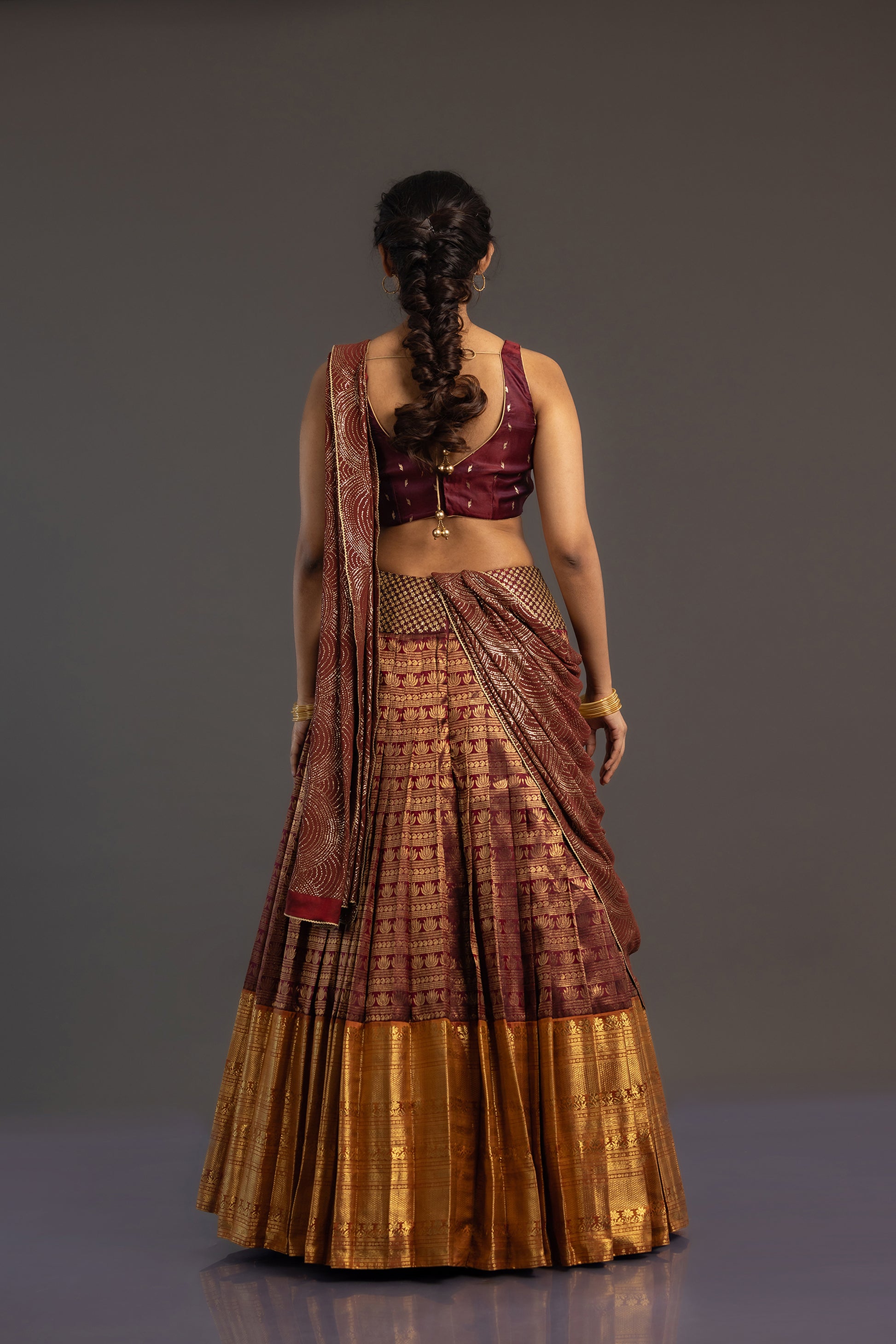 Handwoven Kanjivaram lehenga in deep maroon with woven horizontal stripes of lotus, vanki, and manga (mango) patterns. Contrasting golden yellow Kanchi border and a handmade waist belt with sequin embroidery.