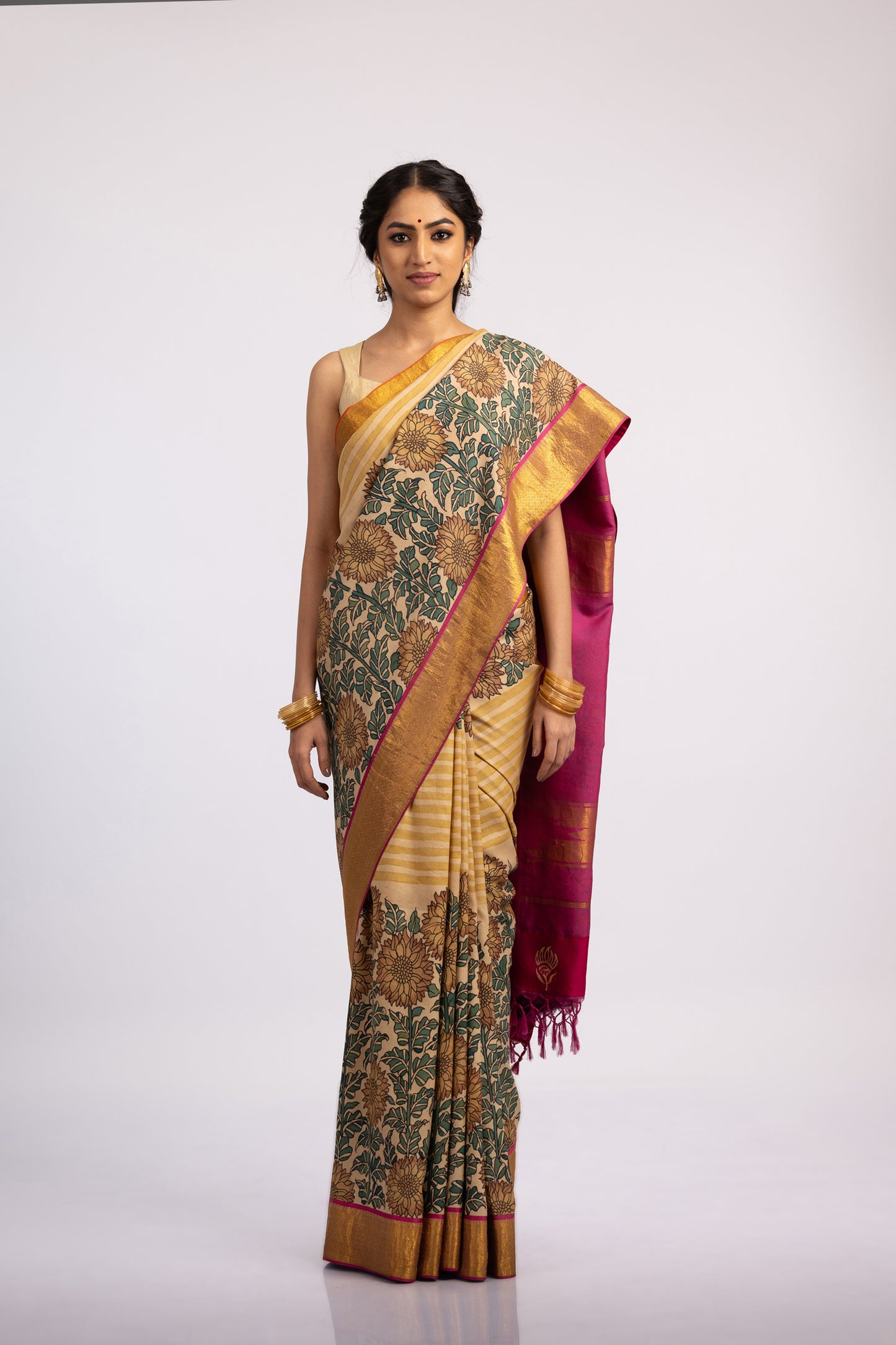 Pure handwoven kanjivaram silk saree with a cream-colored backdrop. Embellished with hand-painted Kalamkari sunflower pattern. Central half of the saree is decorated with awning stripes. Gold Zari border. Pallu contrasts with hand-painted traditional Kalamkari.