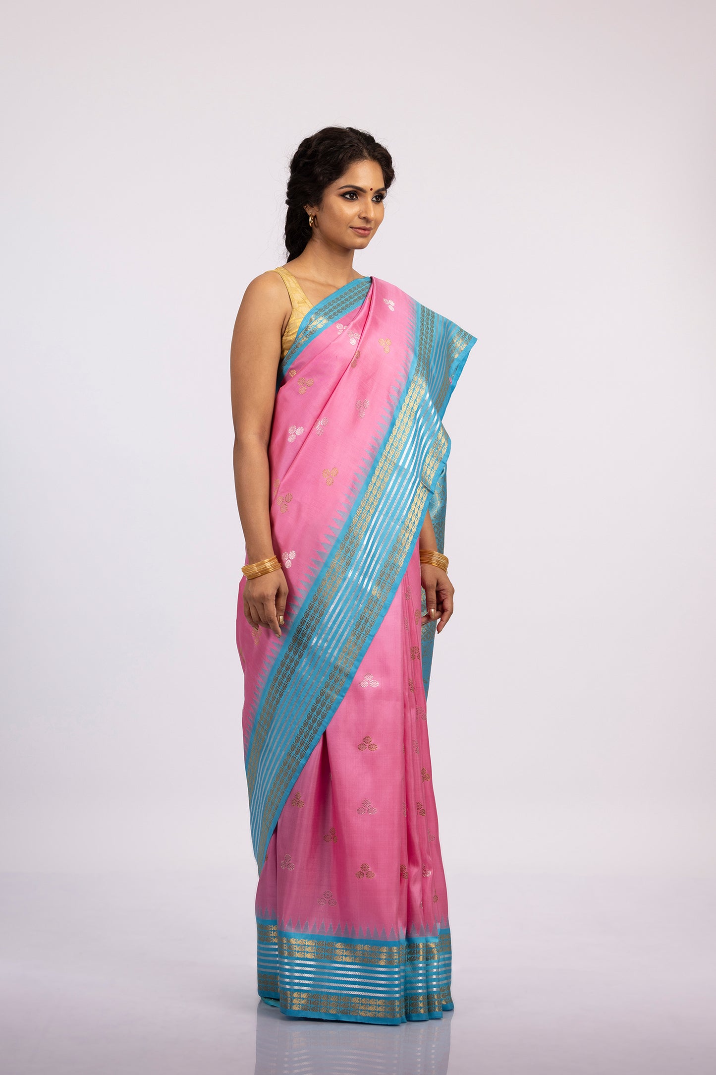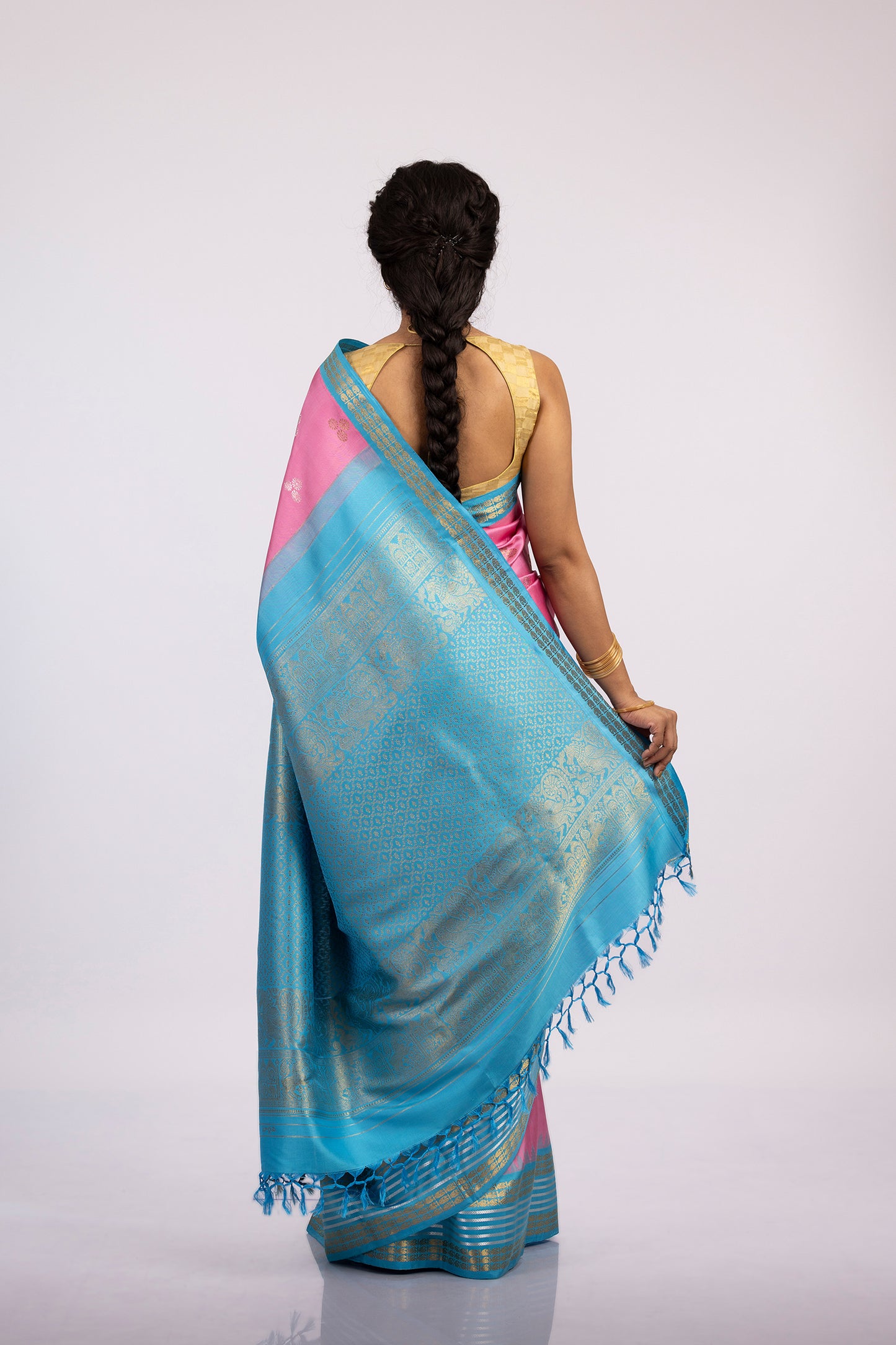 Light pink Kanjivaram handloom saree with silver and gold zari buttas. Light blue border with temple motifs, paisley, and chevron stripes. Pallu with woven animal border and peacock designs.