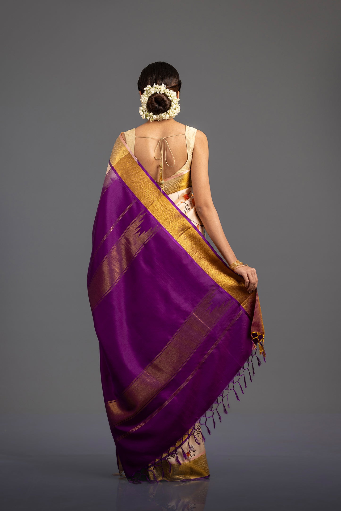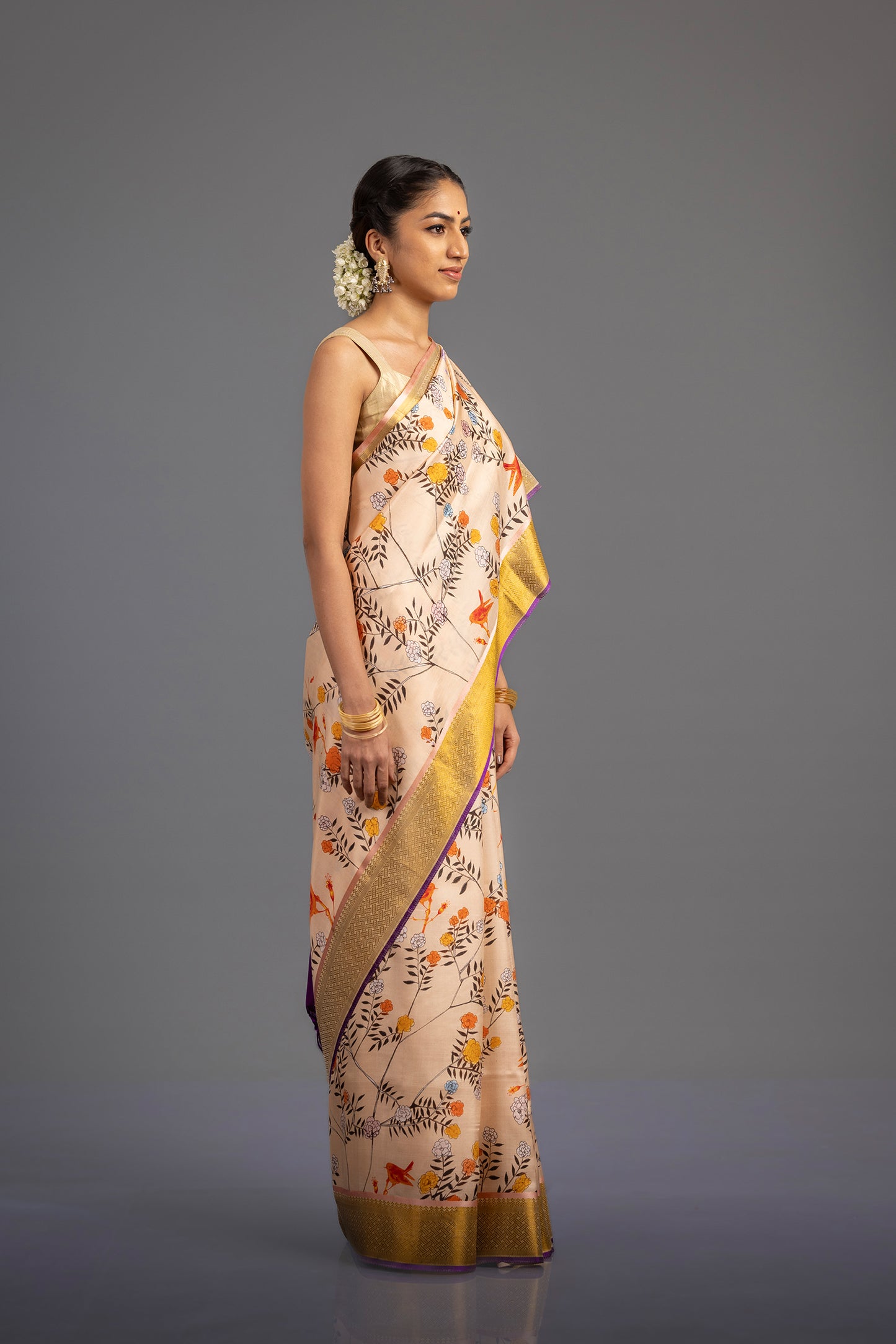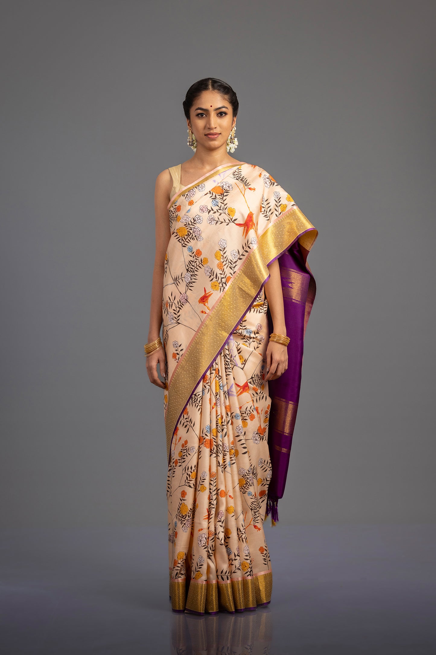Handwoven light pink Kanjivaram printed saree with all-over floral and bird print. Bordered with a Kanchi weave and purple selvedge. Pallu is woven in a purple tint.