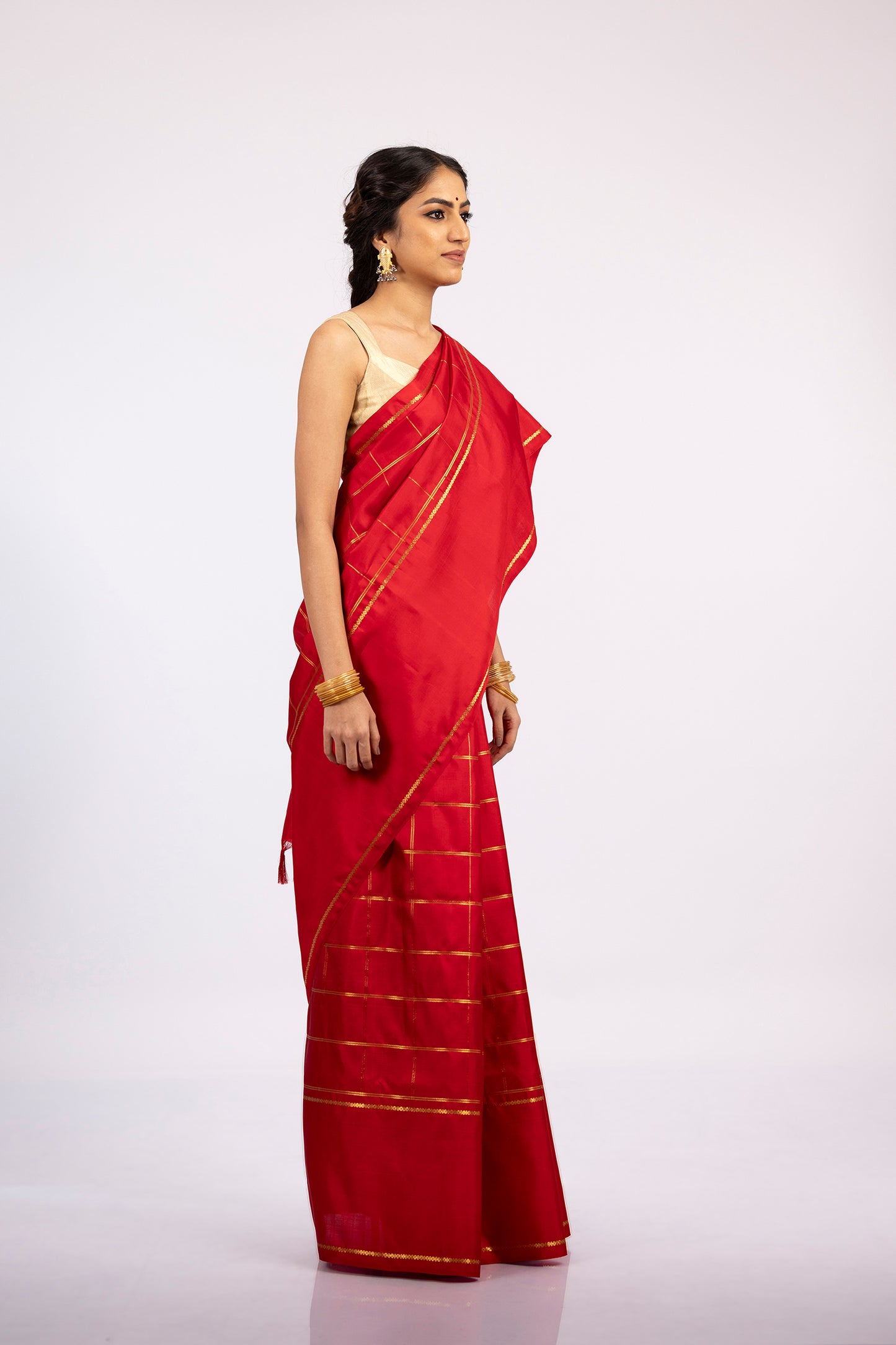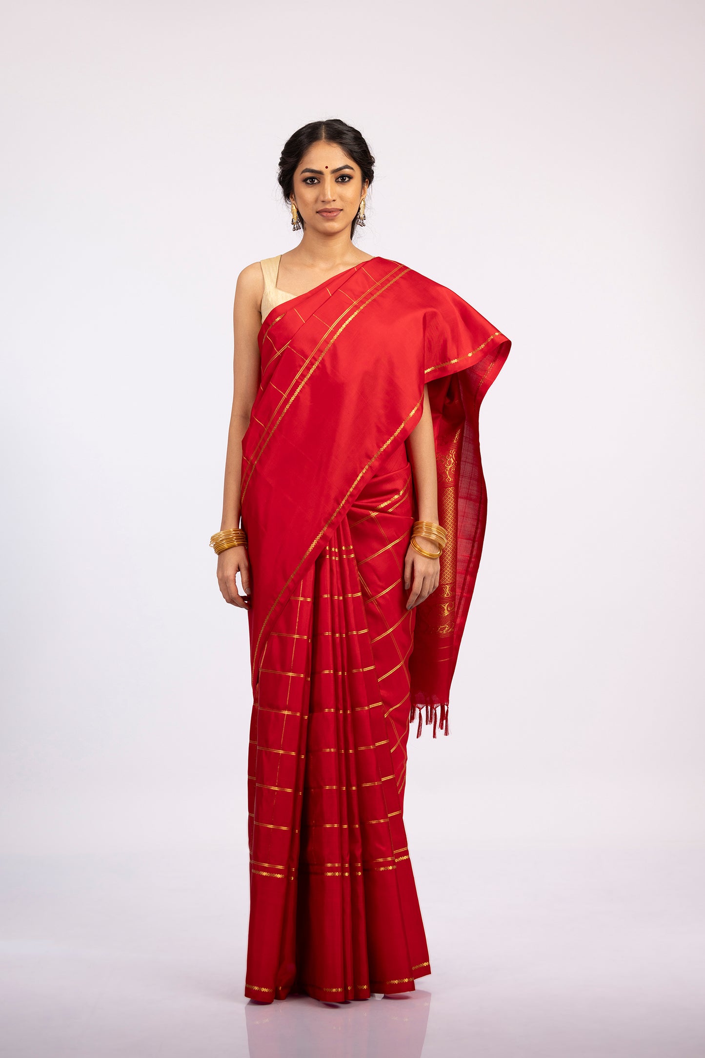 Kanjivaram handloom saree in redwith all-over Zari check pattern. Zari flower border. Pallu has a woven paisley border.