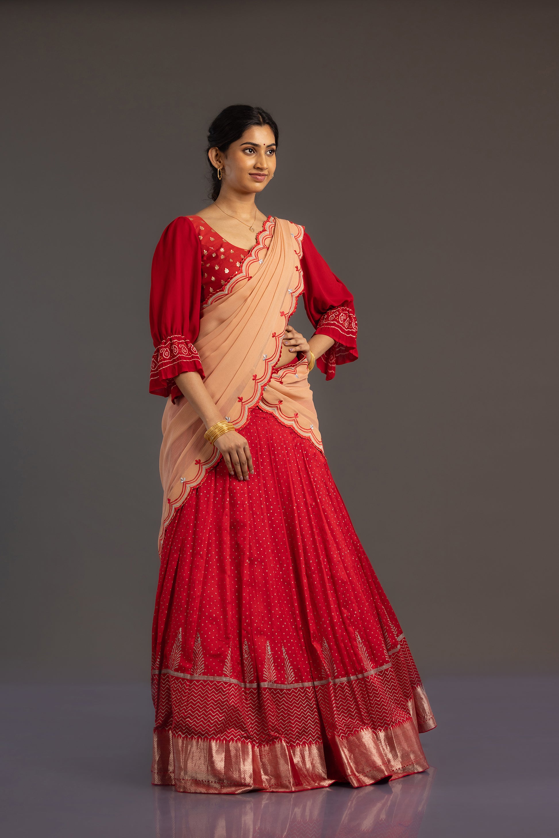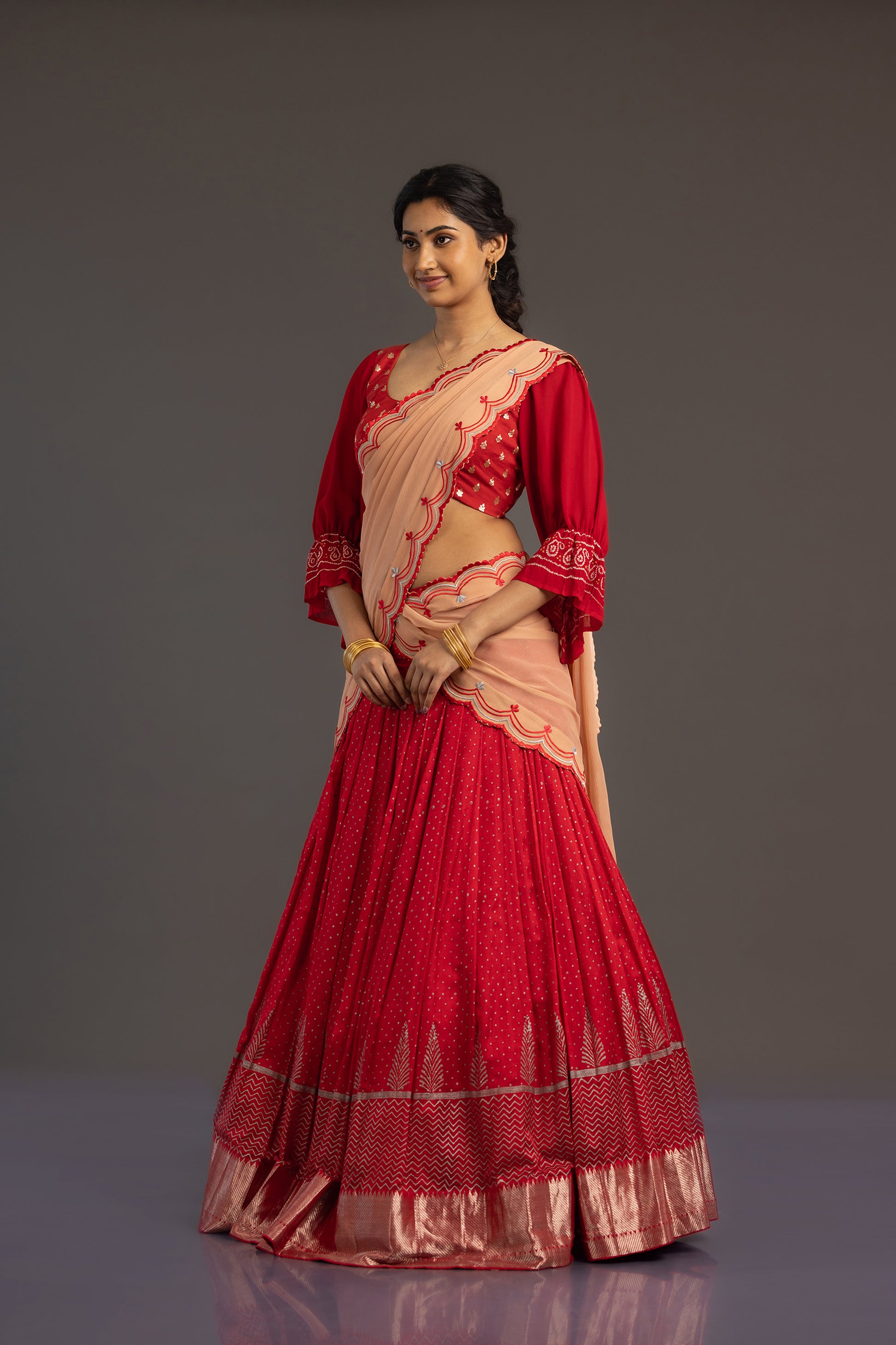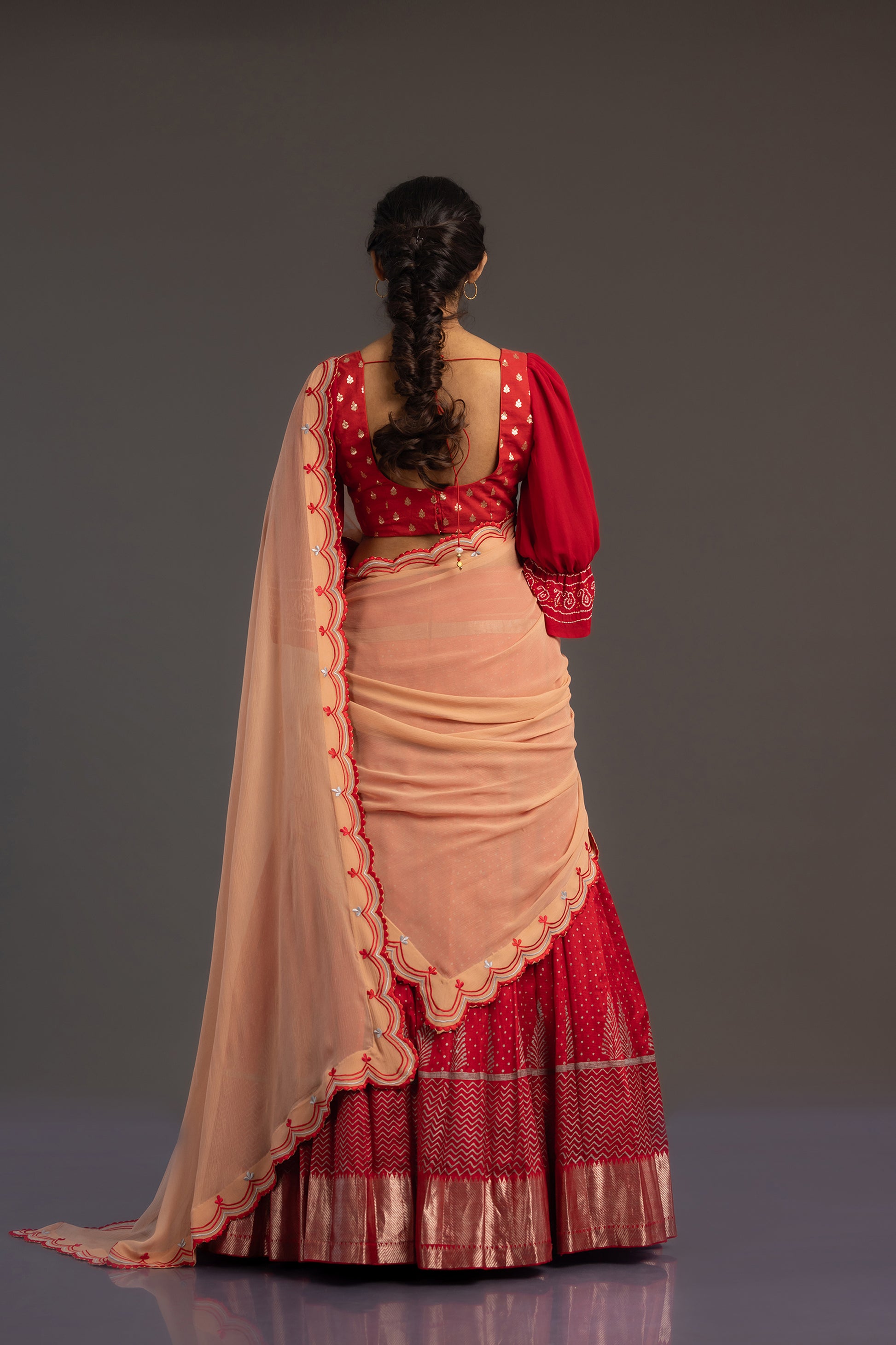 Vivid red blouse with Chanderi butti designs on the body and georgette Bandhini sleeves.