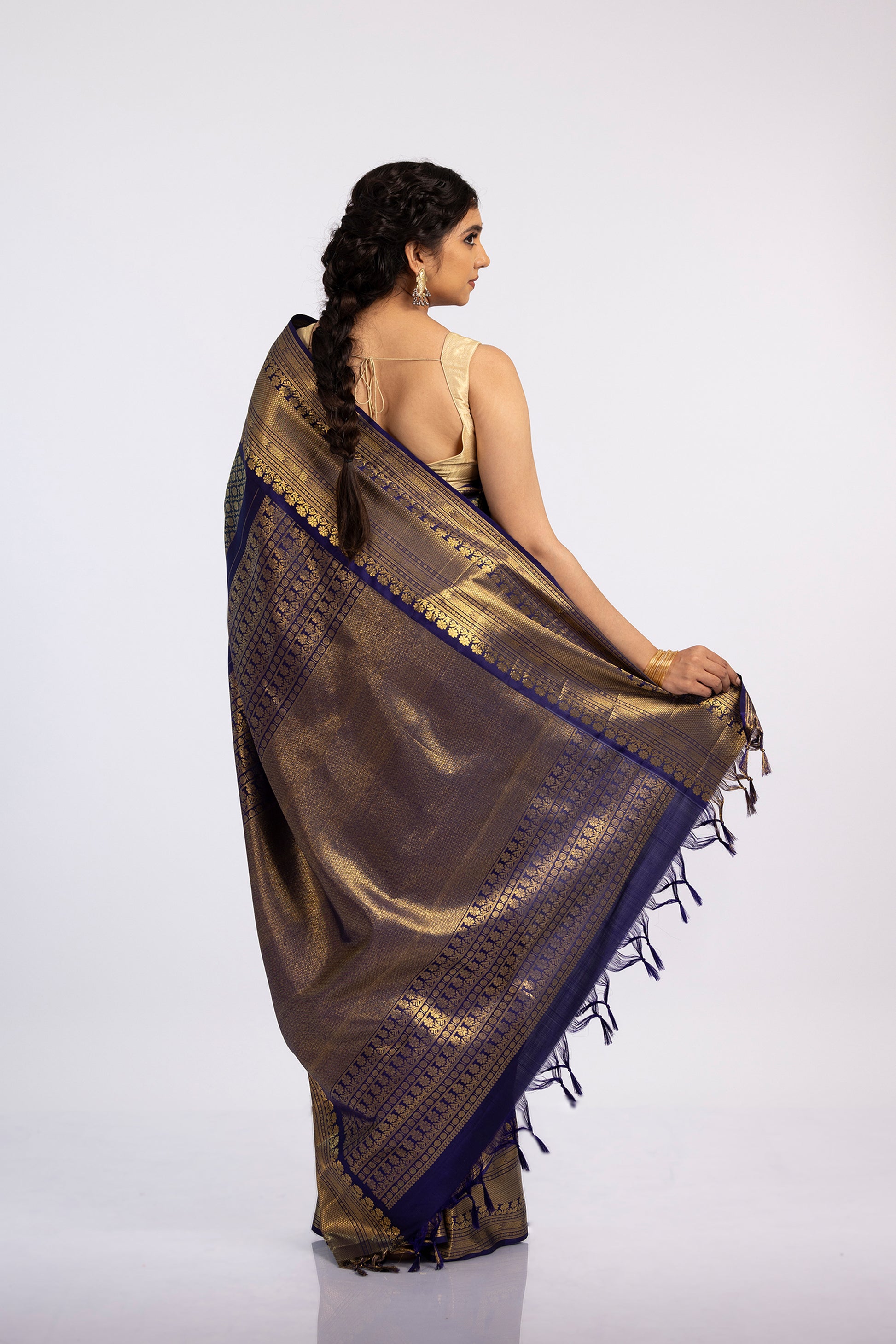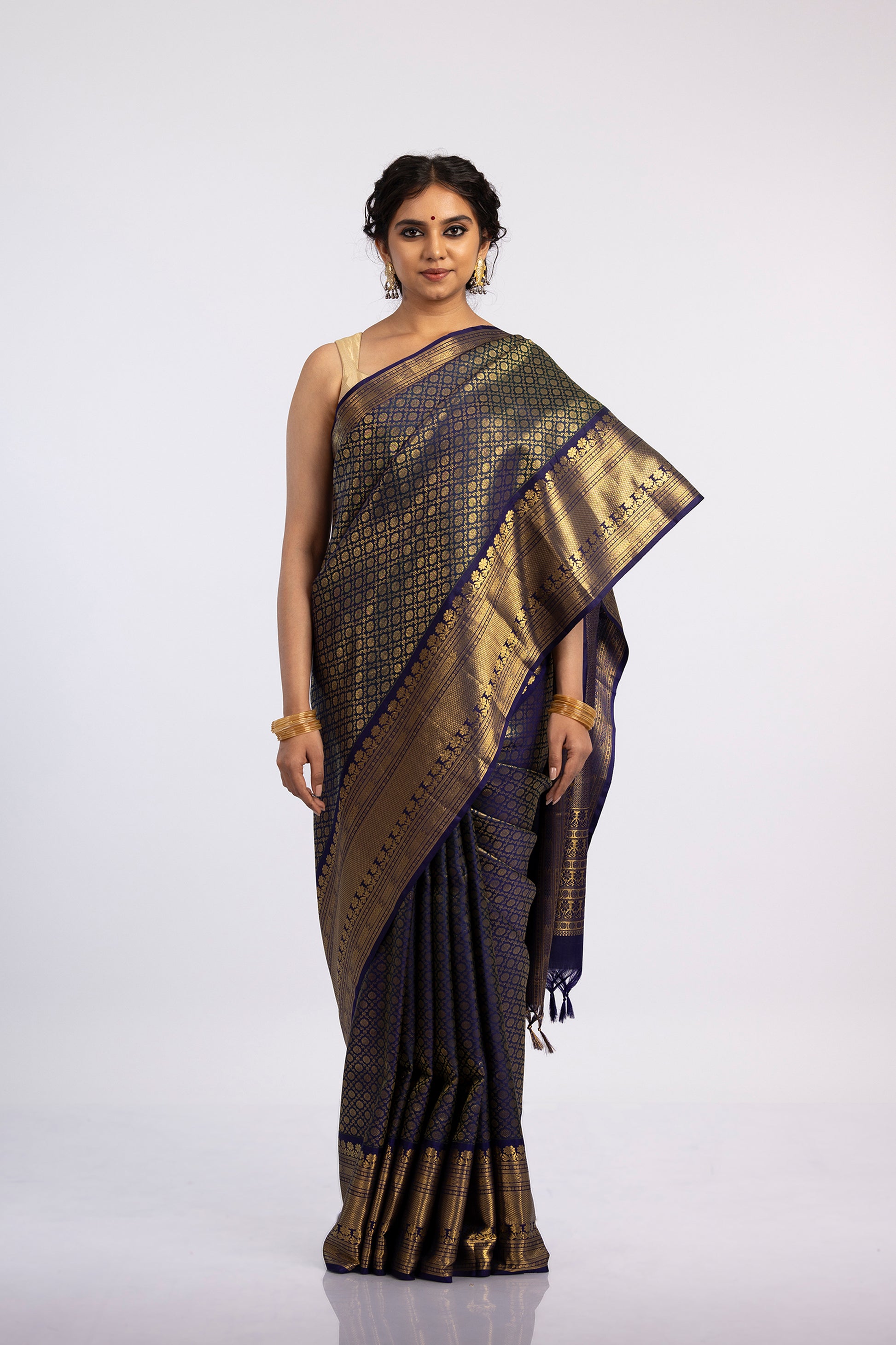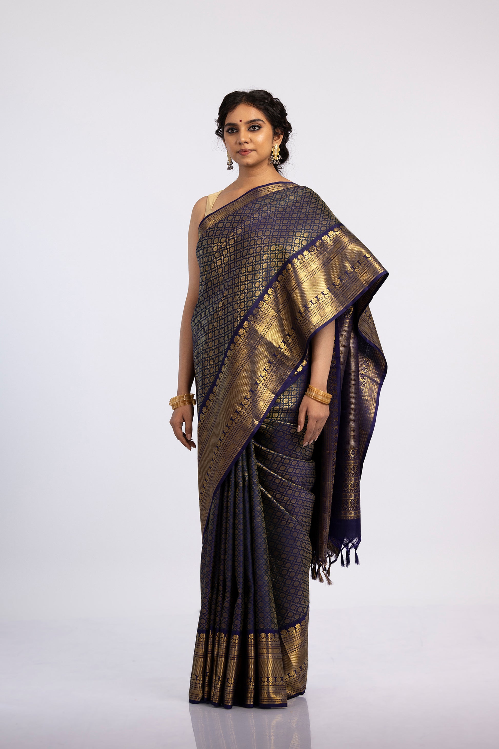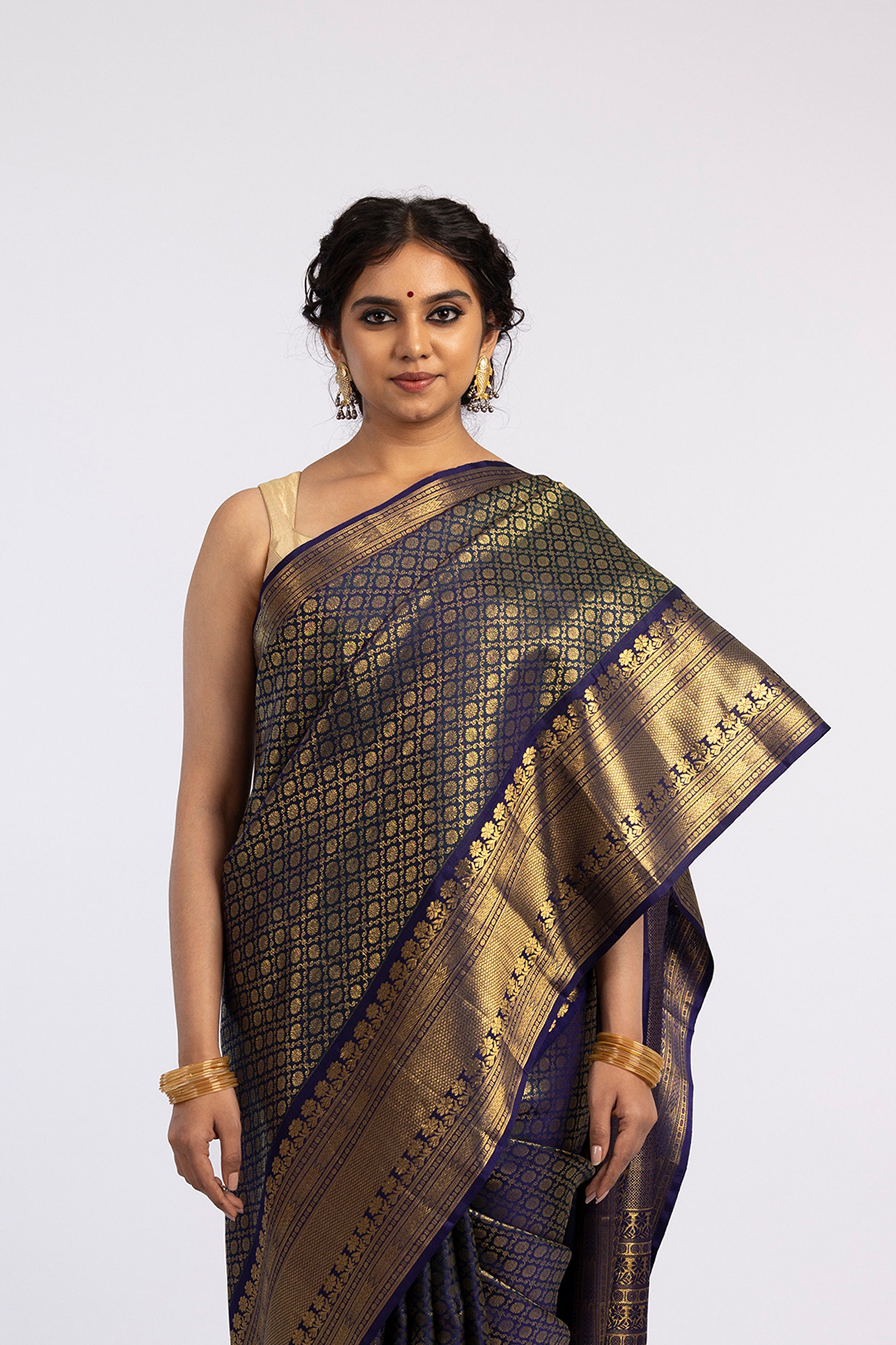 Kanjivaram handwoven saree in dark blue woven with a floral check pattern, with buttas. Zari self-border created with floral designs and a kadi border. Pallu has all-over brocade pattern, floral border and a rudraksha border.