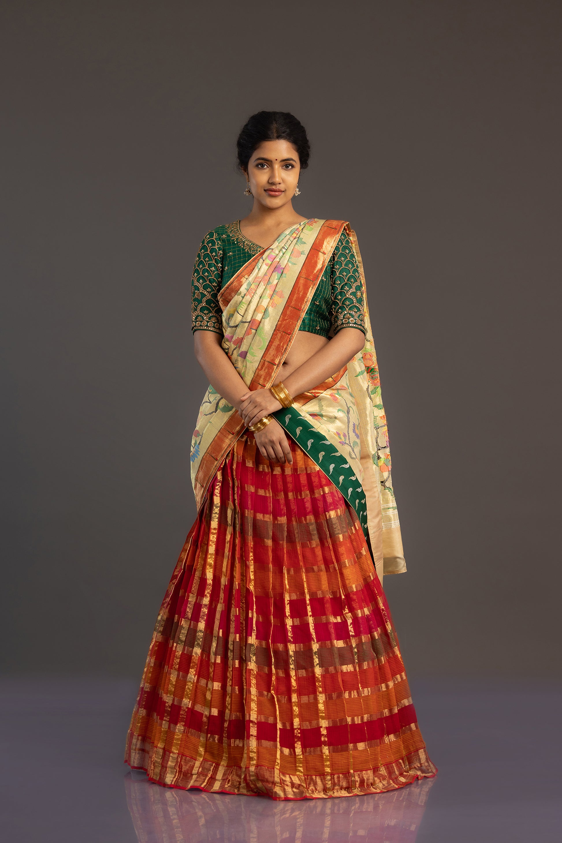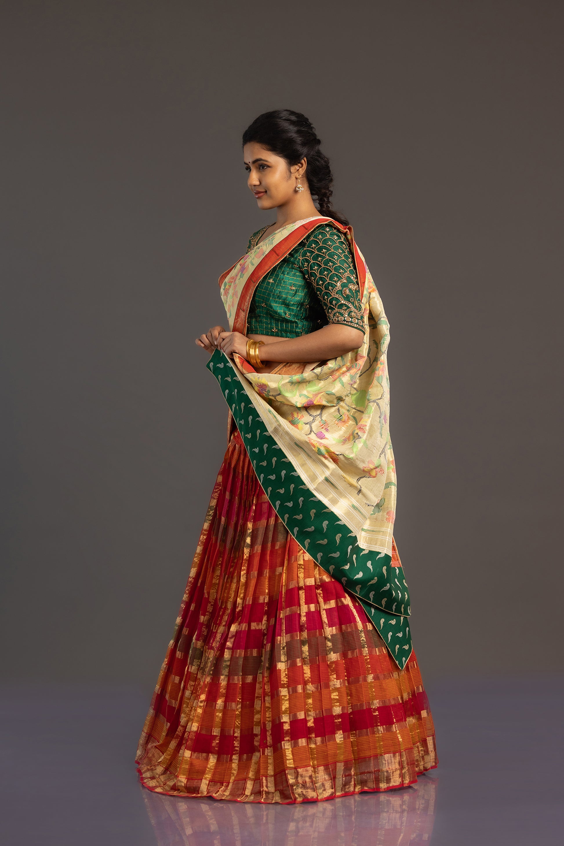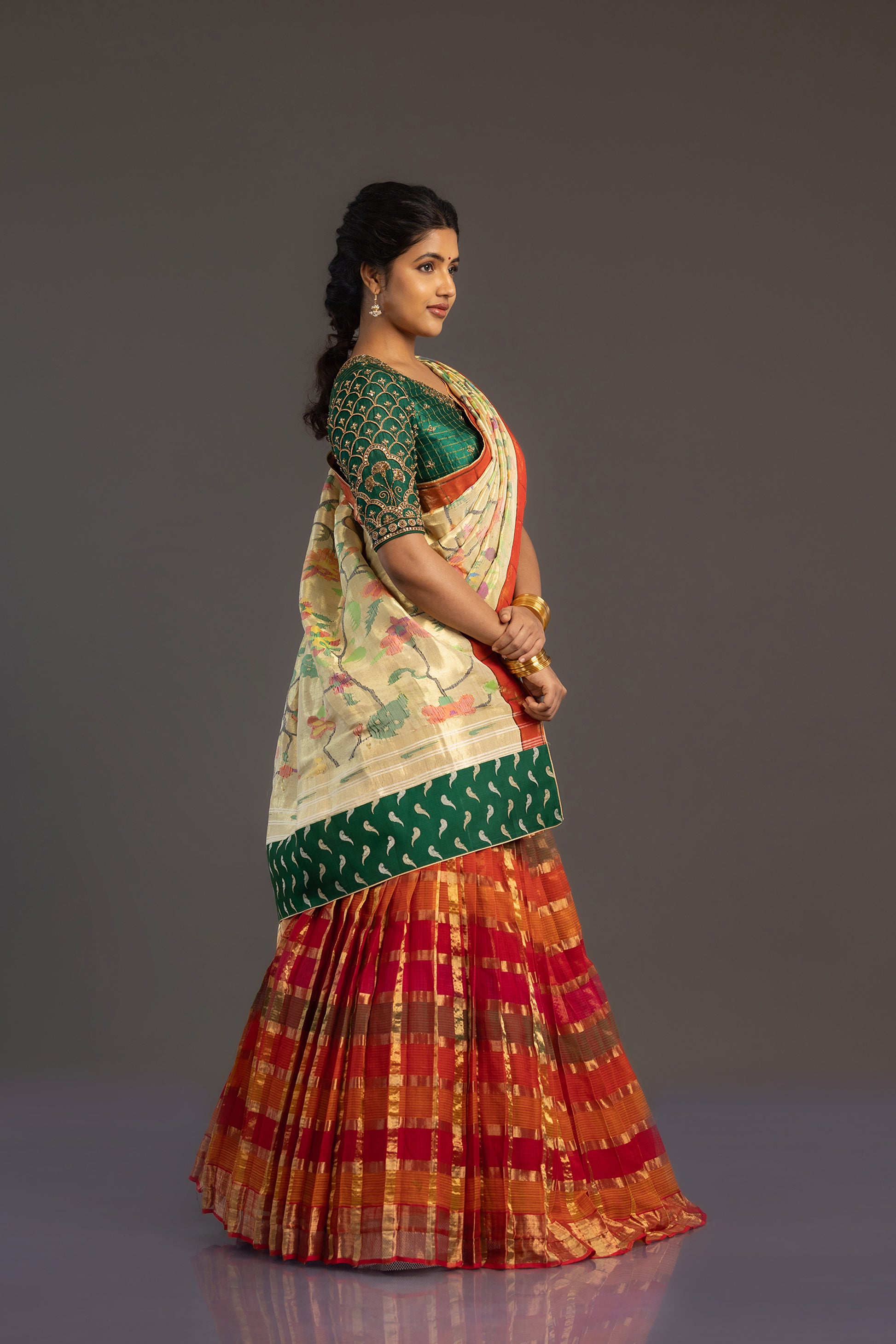 The combination is completed with a gorgeous handwoven Paithani tissue dupatta against a dazzling golden backdrop. The dupatta is adorned with all-over flowery Paithani designs. A striking crimson border with the Muniya (parrot) Paithani motif frames the piece. The pallu is highly designed, with a handwoven Muniya Paithani border, gorgeous Zari stripes, and an attached green silk panel intricately woven with vivid parrots, a tribute to Paithani weaving traditions that date back generations.