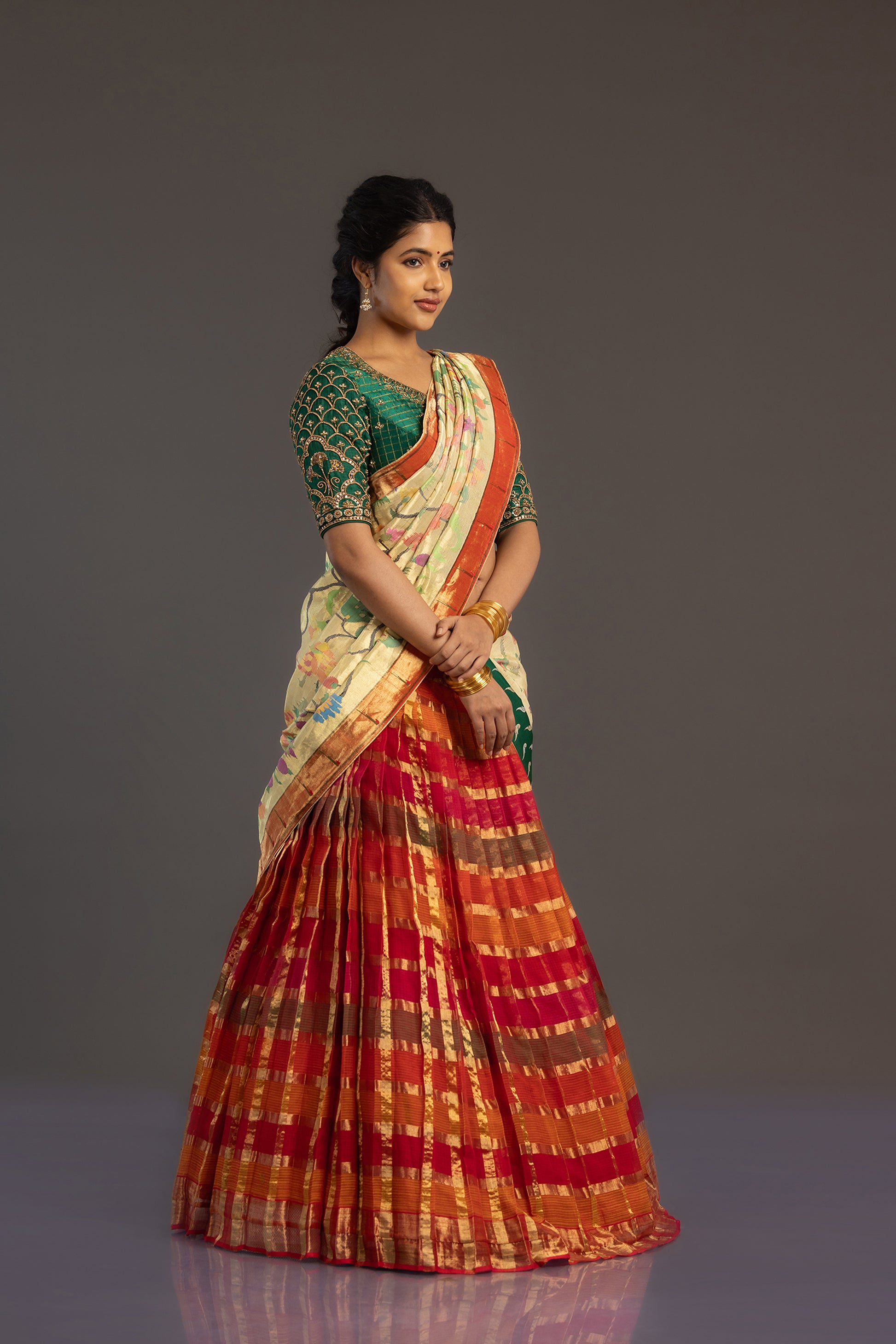 Handwoven silk Kota lehenga with multi-colored check pattern woven with Zari checks. Zari kadi border and bright crimson selvedge.