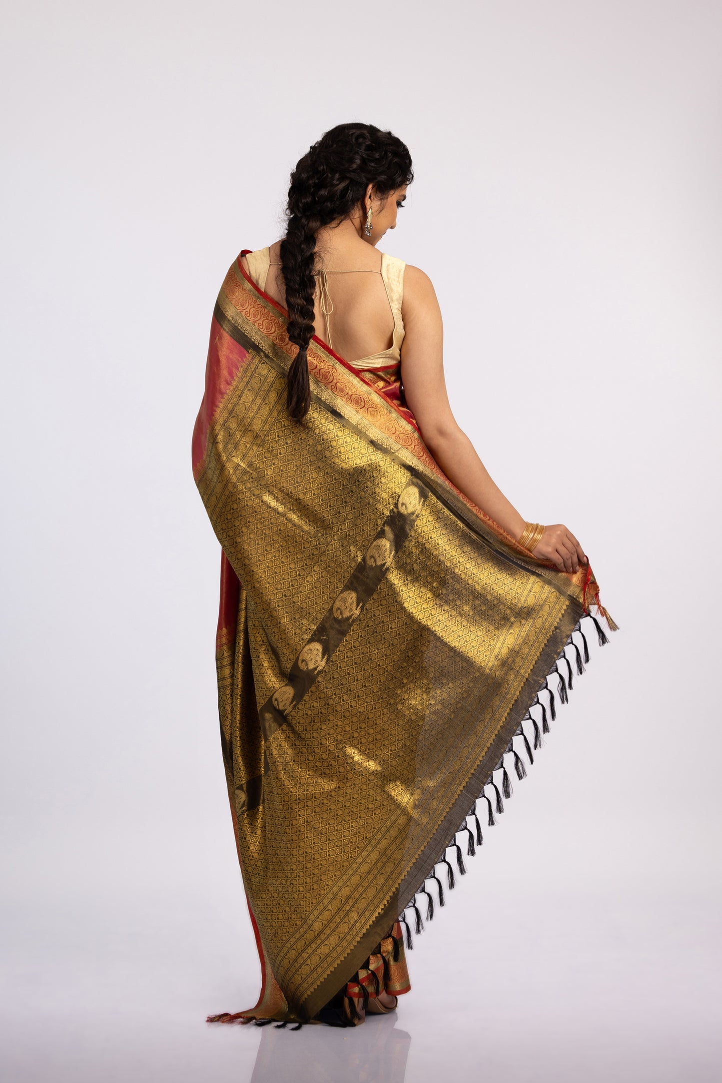 Kanjivaram silk tissue handloom saree. Metallic pink colour body adorned with ‘kamalam’ (lotus) motifs, woven with rich golden Zari. Complementary Zari border featuring variations of the traditional ‘manga’ (mango) motif.