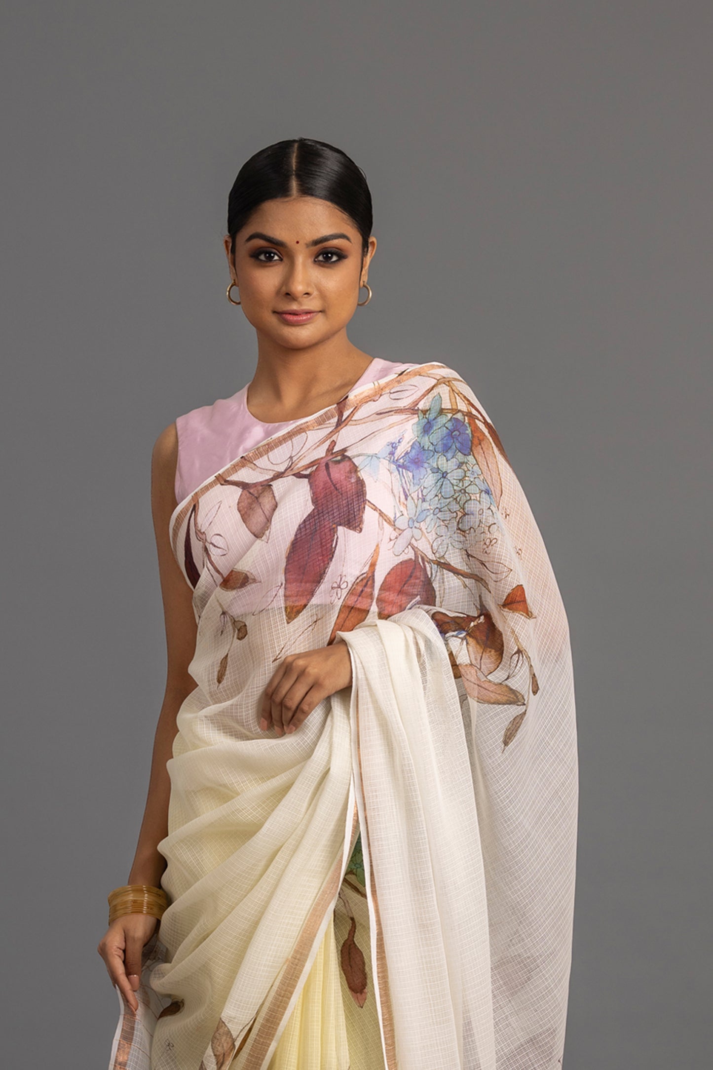Kota cotton handwoven printed saree with an off-white backdrop. Floral and stem pattern print. The saree is framed by a gold Zari kadi border.