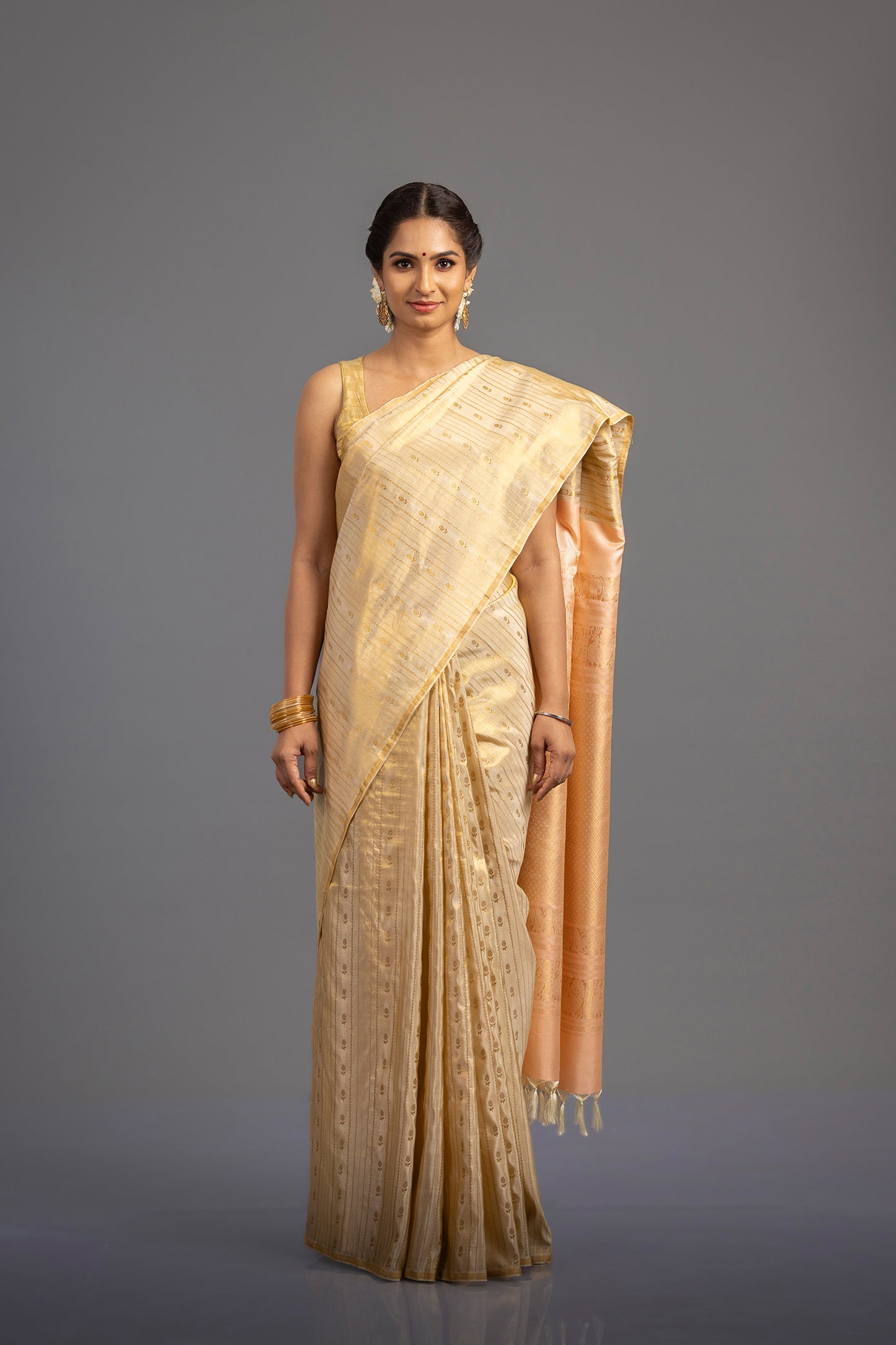 Kanjivaram tissue saree in cream with intricate Zari motifs and chalk stripes all over the saree. Features a small kadi border. Pallu has all-over Zari brocade and peacock border.