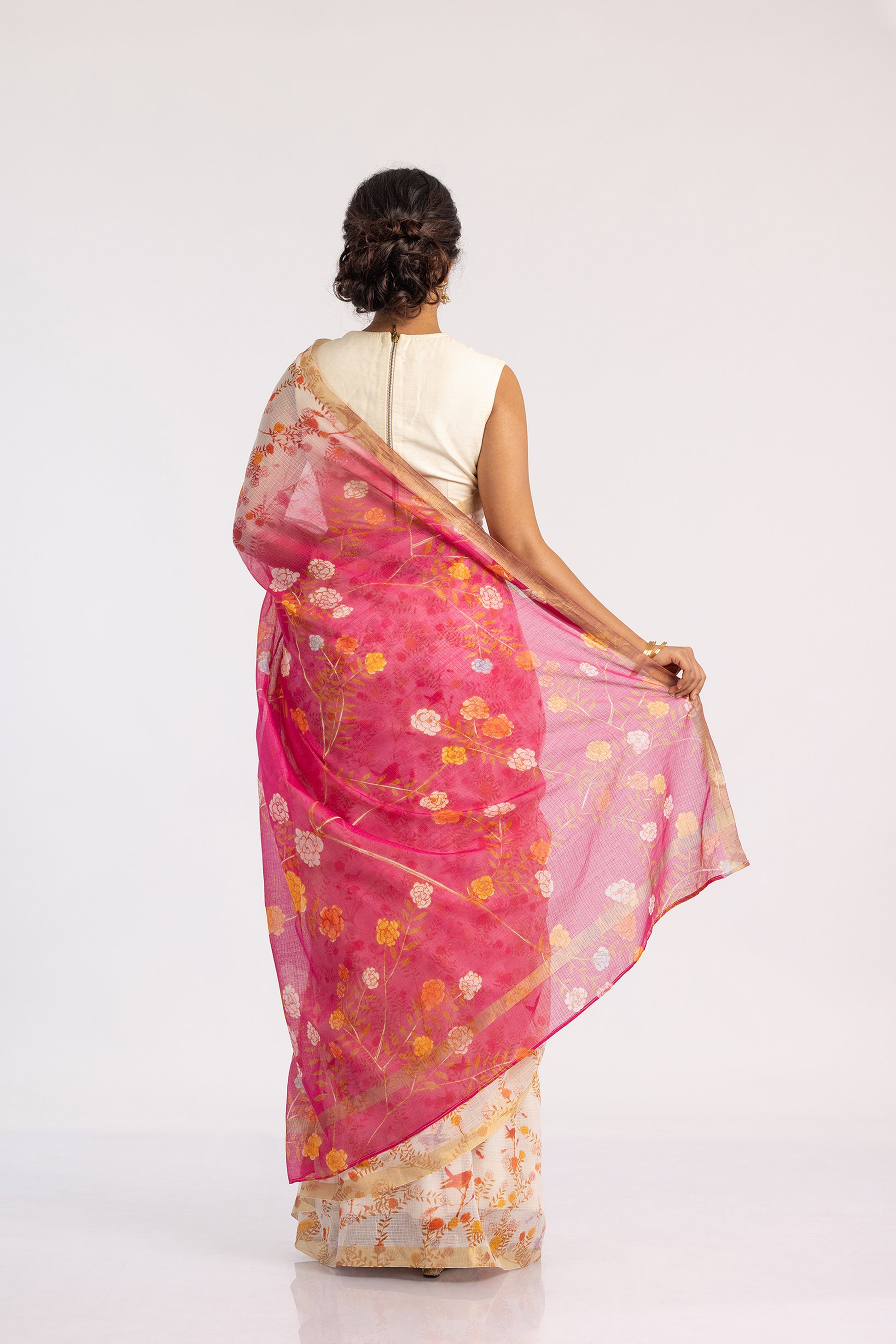 Handwoven Kota cotton saree in white with floral art print interwoven with bird images. Zari bands on edges. Pink pallu with an enlarged version of the body's floral and bird print.