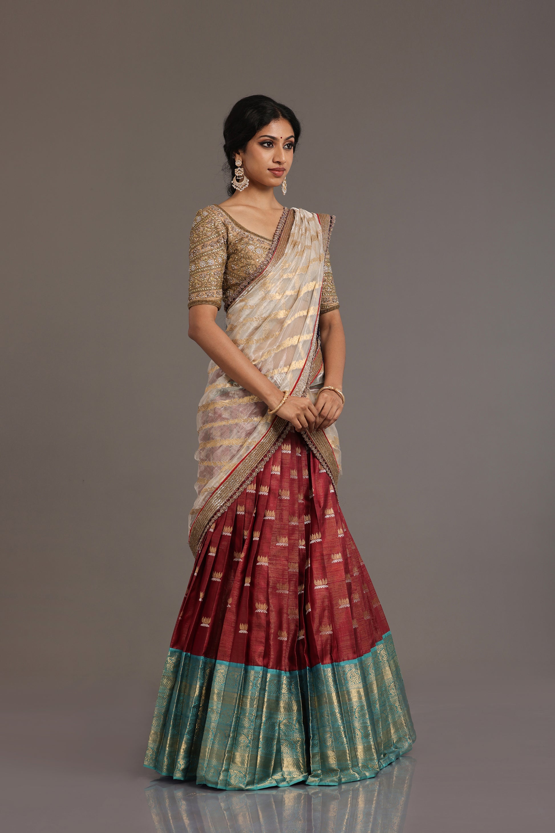 The combination oozes richness when paired with a silk blouse in a golden color. The blouse is adorned with extensive hand embroidery, which adds depth, substance, and artistic delicacy to the appearance.