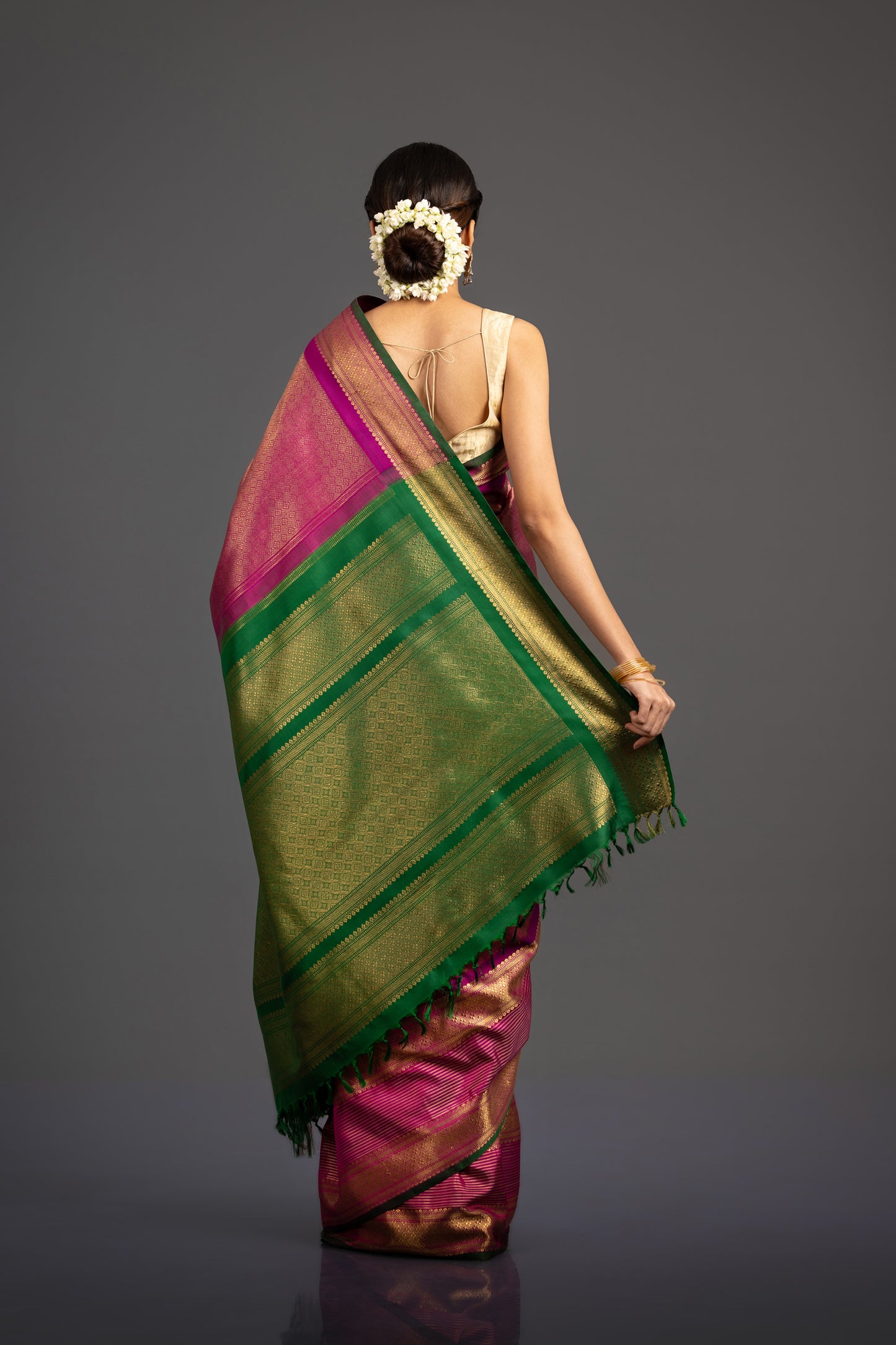 Handloom pure silk Kanjivaram saree in pink colour with geometric patterns. Self-Zari border with stripes and green selvedge. Contrast green Zari pallu.