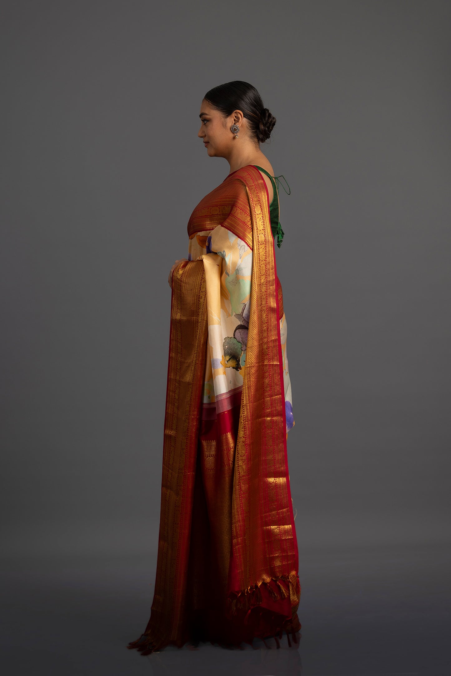Handwoven Kanchi-printed saree. Cream with printed designs. Bordered with a traditional Kanchi weave, and red selvedge. Pallu is woven in a red tint.