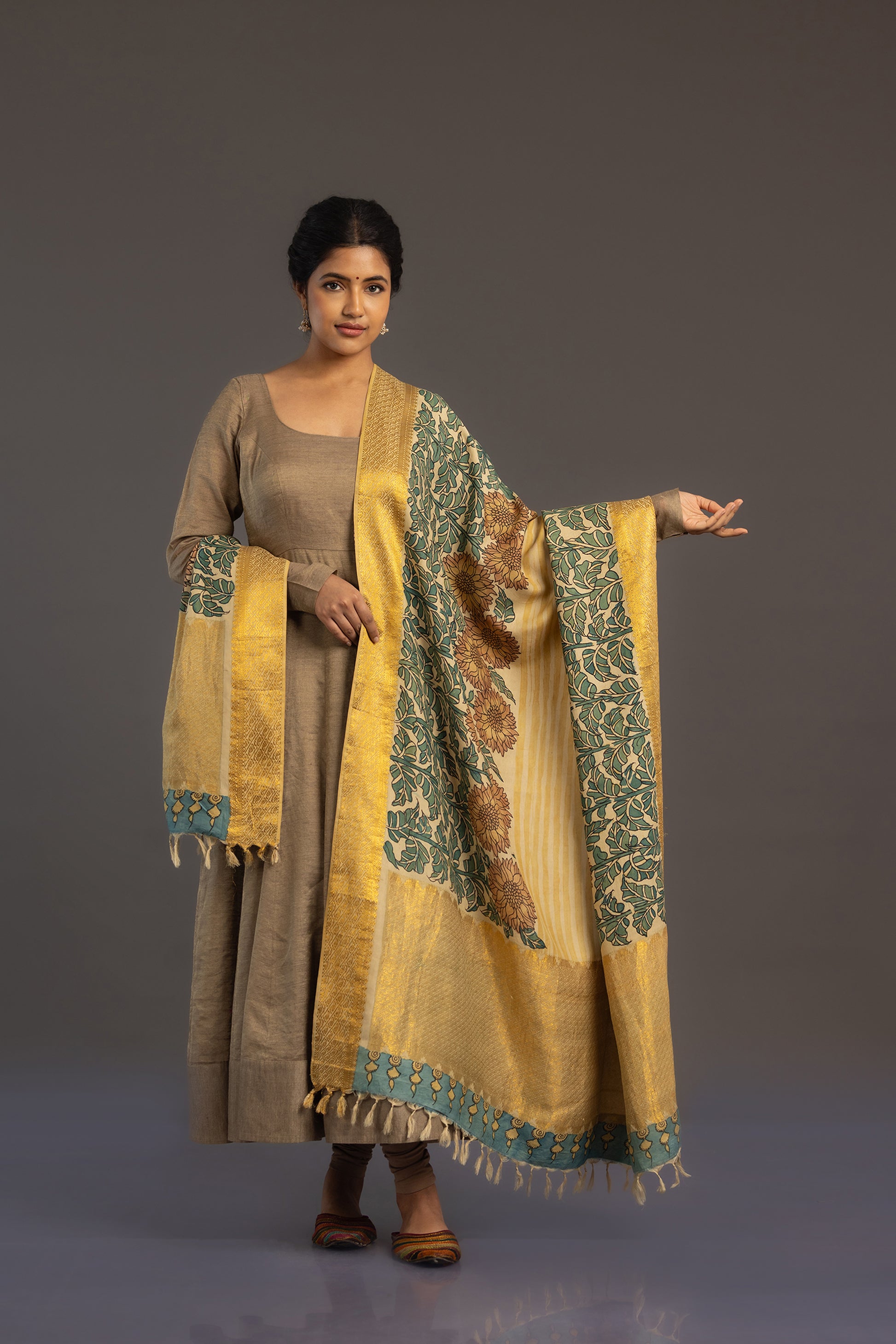 Handwoven Kanjivaram dupatta in cream with hand-drawn Kalamkari sunflower motifs with yellow stripes. Borders woven with Rudraksha designs. Pallu has geometrical Zari panel with pen Kalamkari motifs.