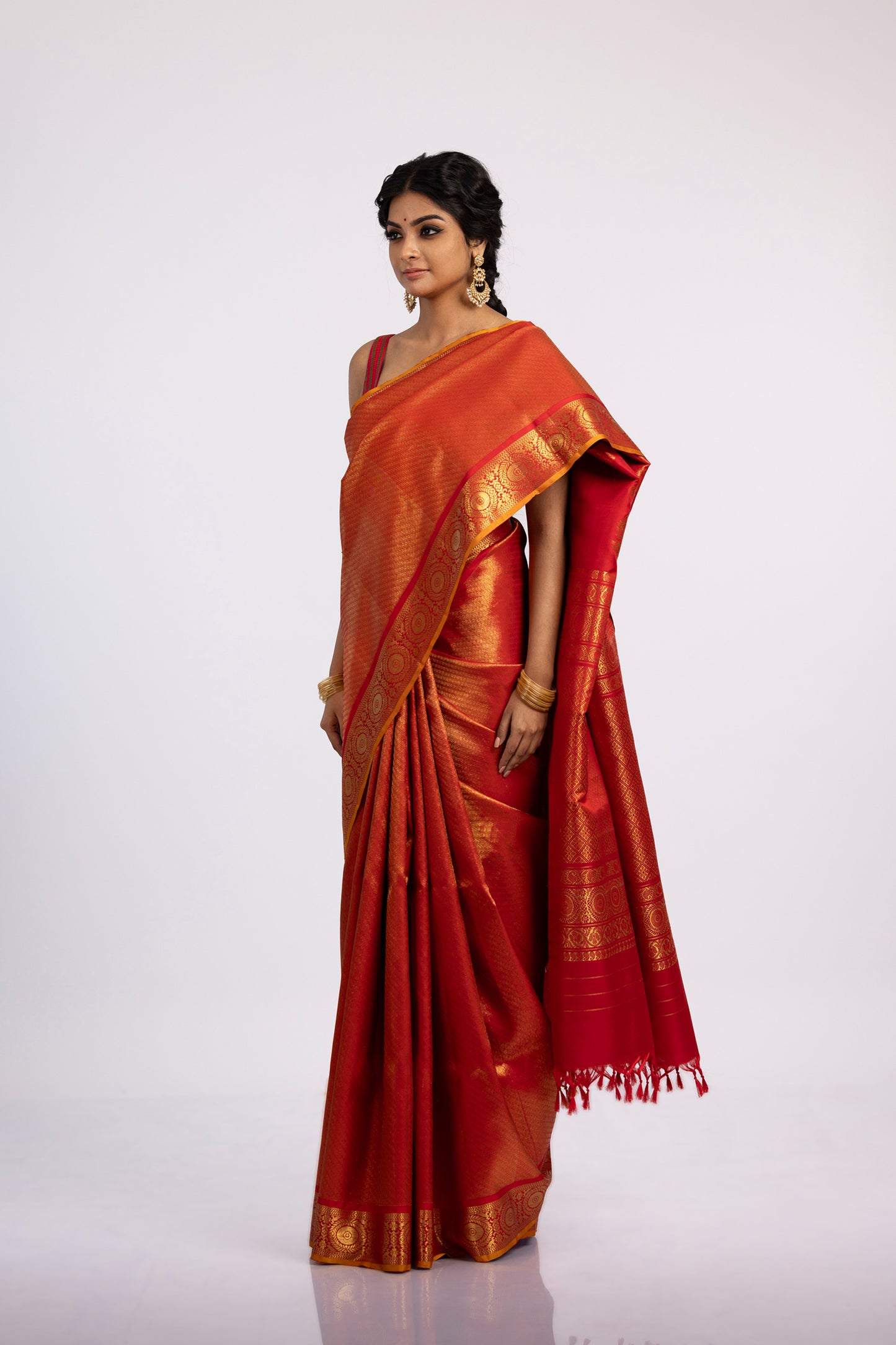 Handwoven orange Kanjivaram saree featuring all-over Zari stripes. Floral and contemporary Zari border with contrasting mustard yellow selvedge. Red Zari pallu.