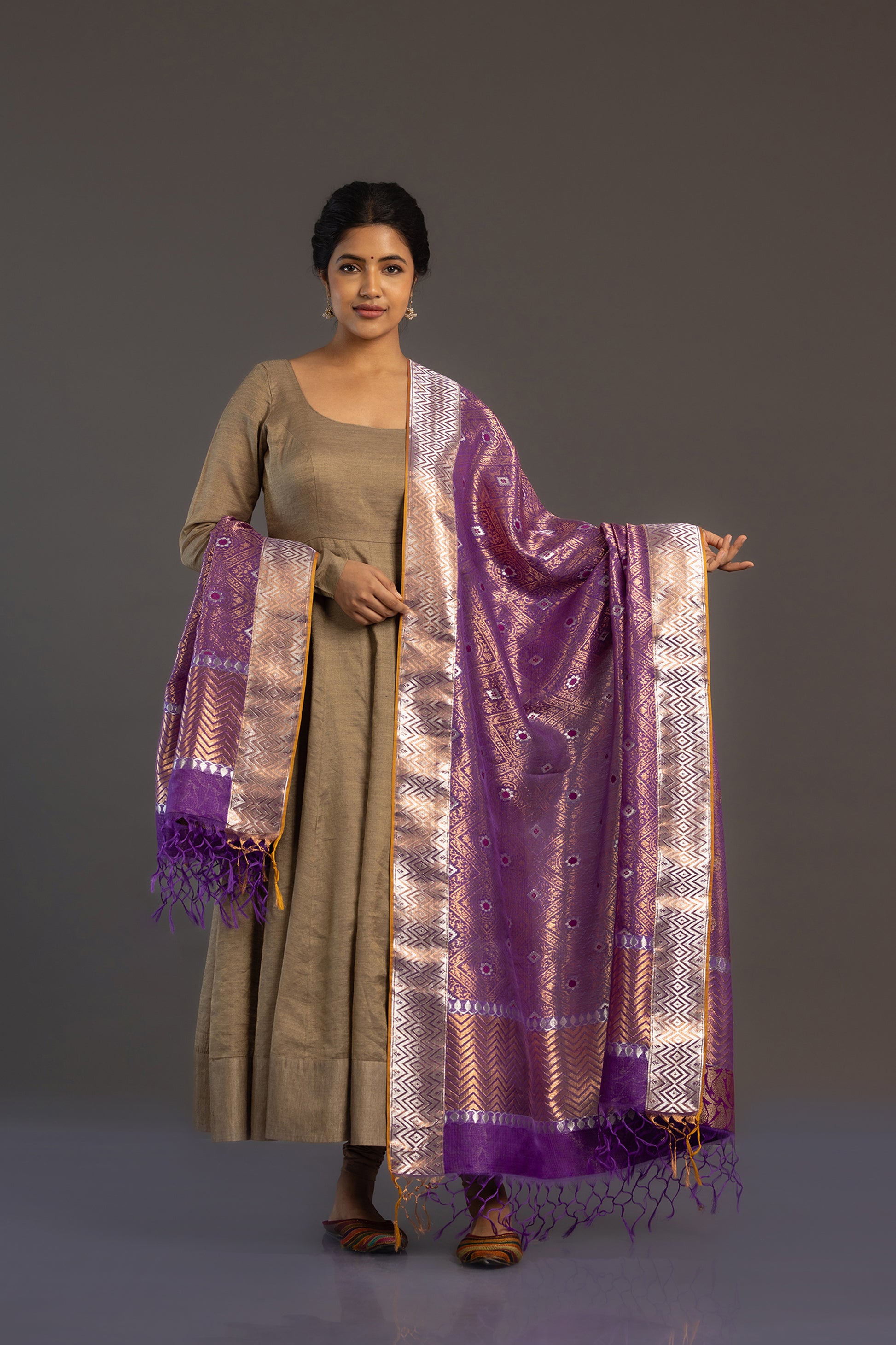 Handwoven Zari Kota dupatta in deep purple with double-weave pattern. Woven check pattern with an alternate Zari motif, accented with Meenakari detailing. Silver Zari check border with yellow selvedge. Pallu has a woven Zari chevron stripes panel.