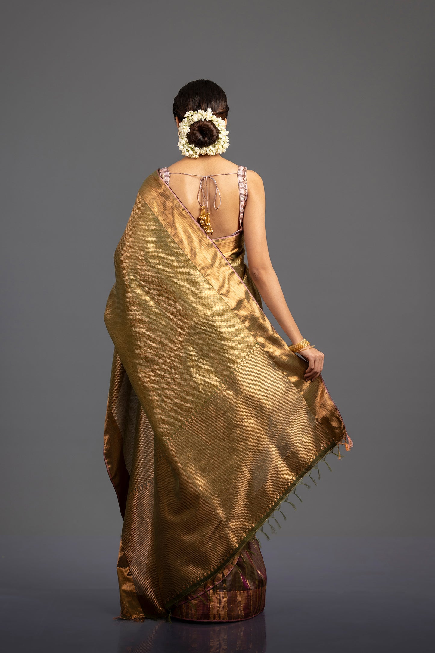Pure handloom Zari Kota saree in a lovely olive green colour with multi-coloured stripes. Gold Zari border with Peking stripes. Pallu has Zari candy stripes.