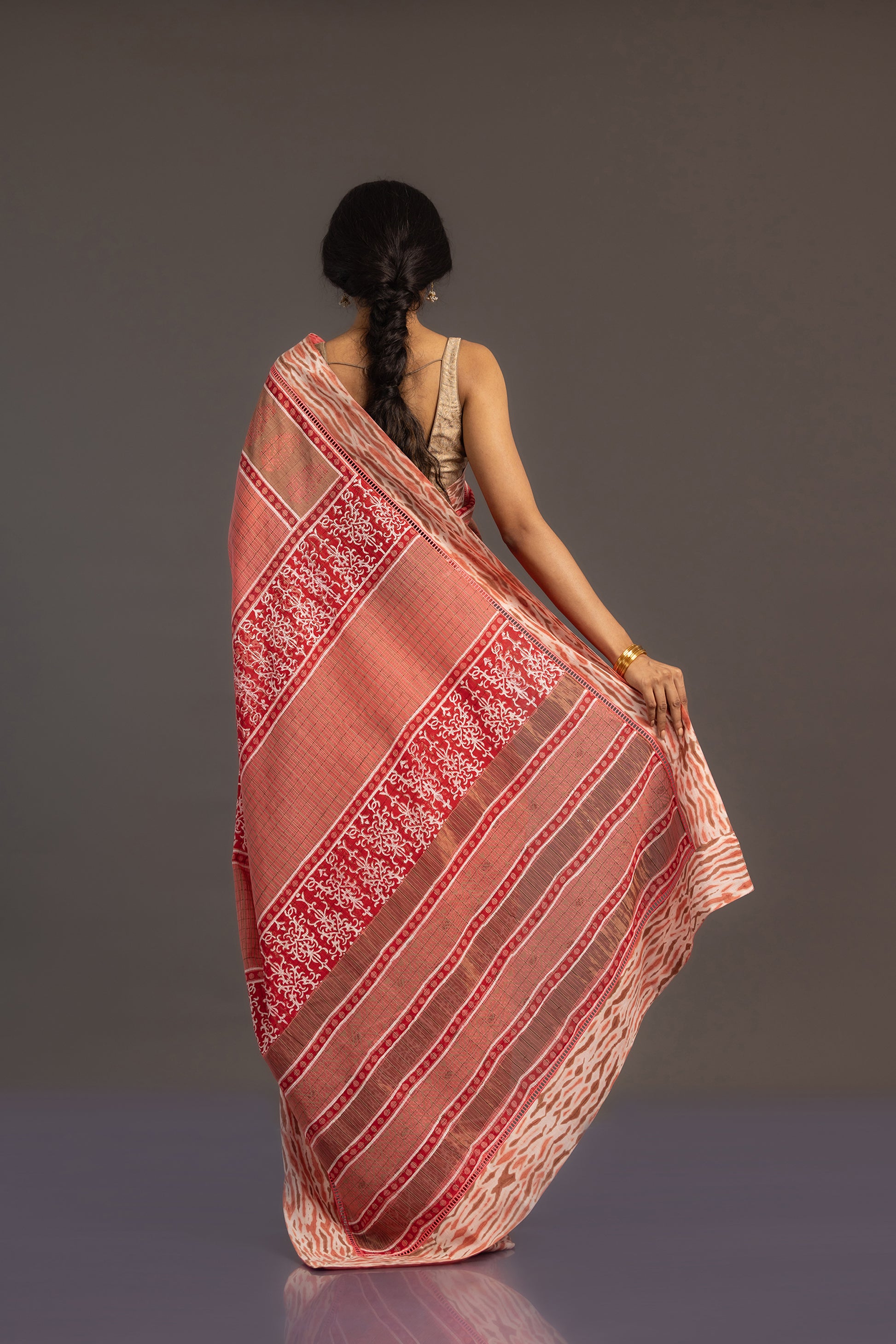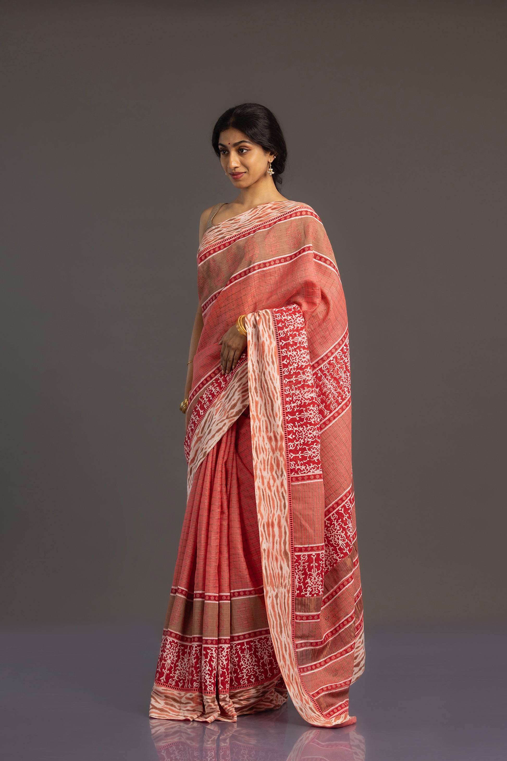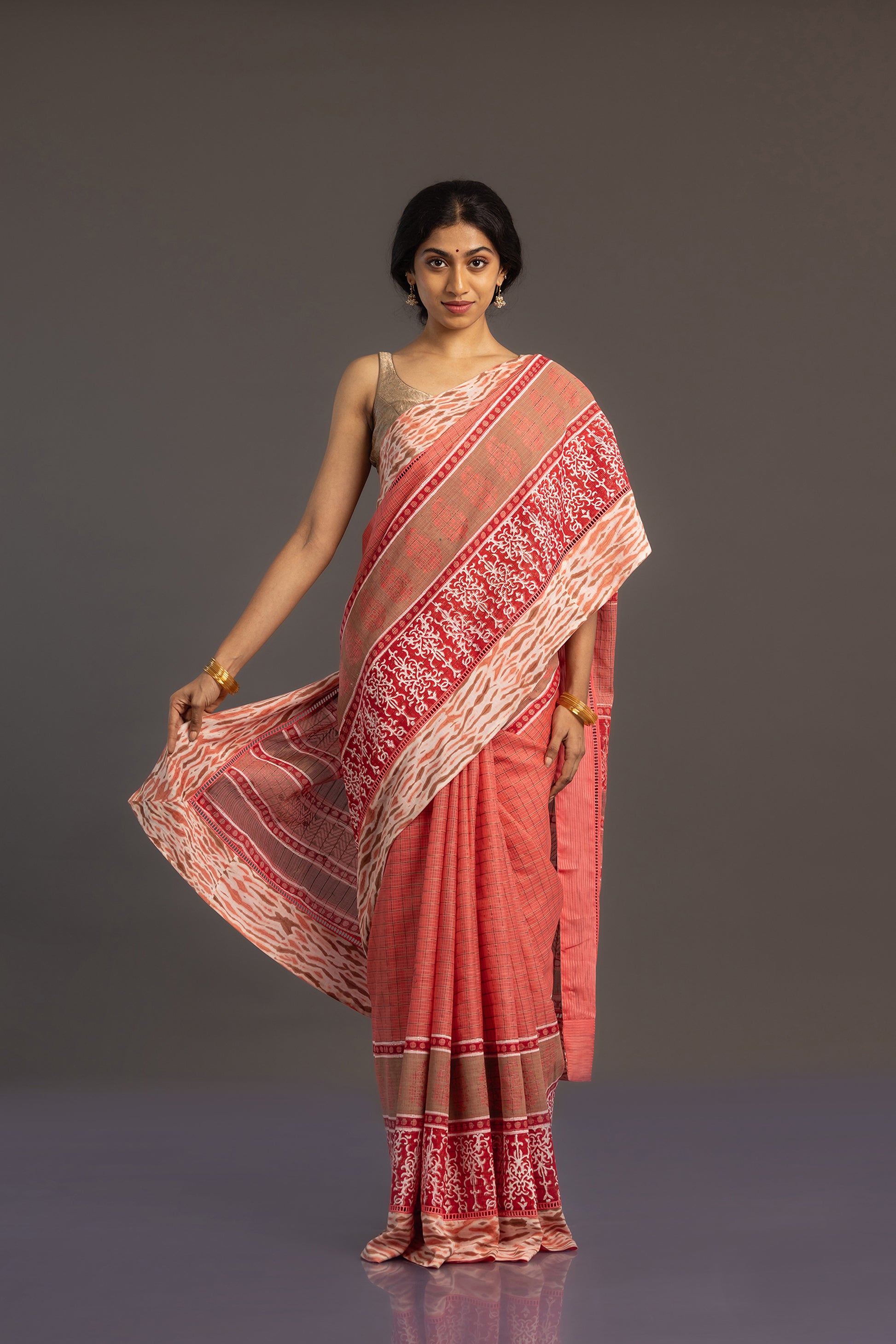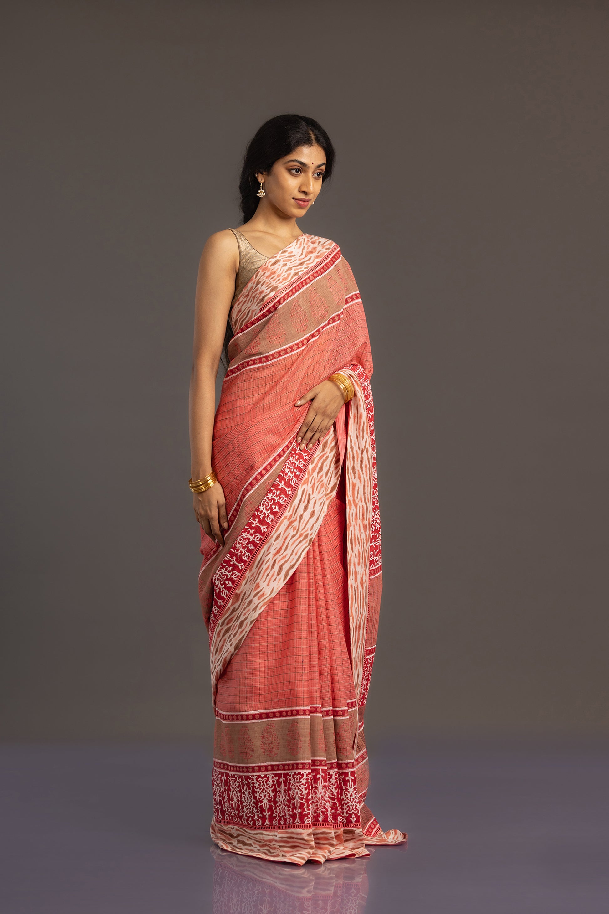 Handwoven cotton Kota saree in pink with woven Zari checks. Upper and bottom borders have hand block-printed Gadh paisley motif, flanked by white stripes enclosed within a red printed border. Lace and attached silk tie-and-dye border frame the saree.