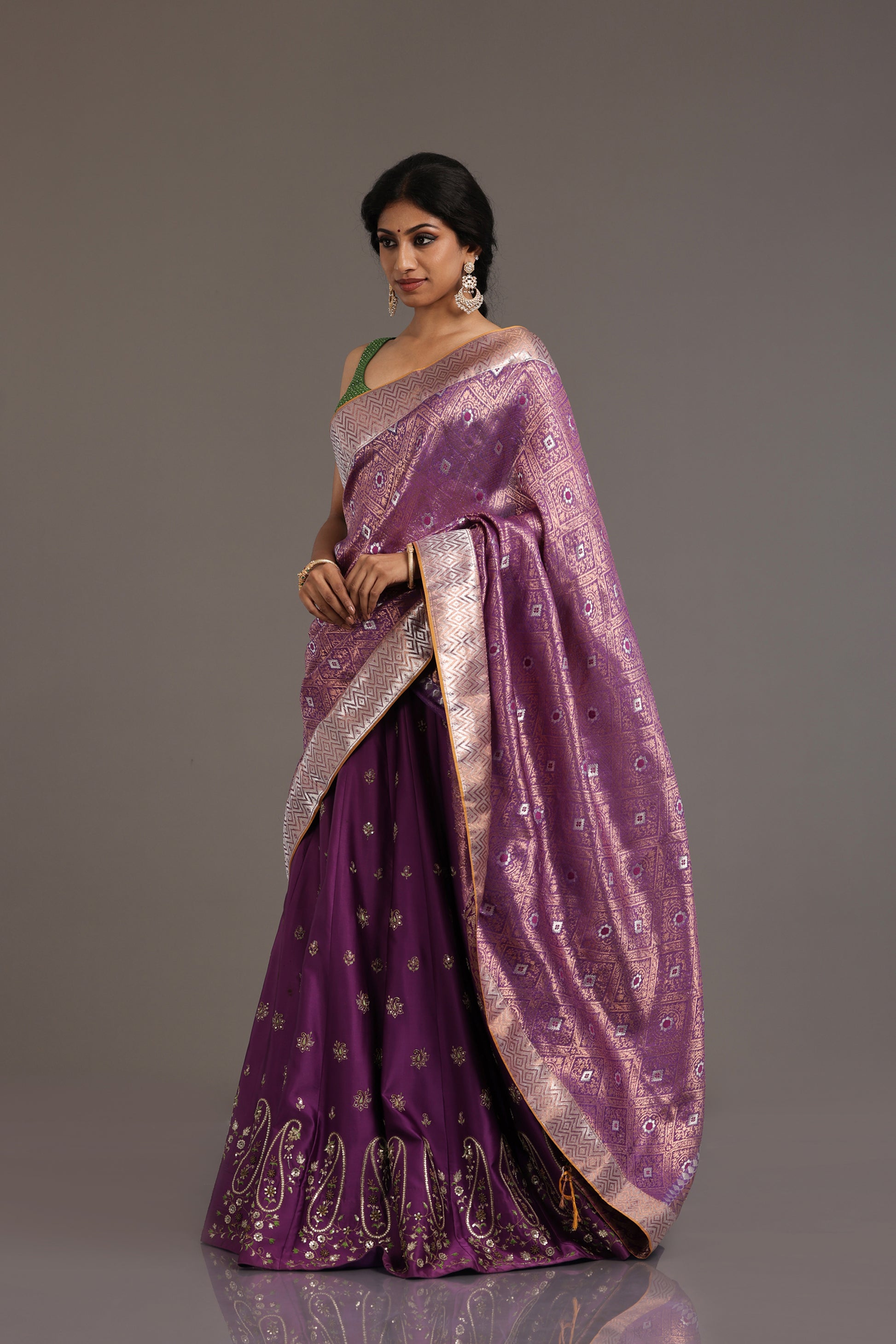 Pure satin silk purple lehenga with hand-embroidered paisley motifs. Self border with hand embroidery.