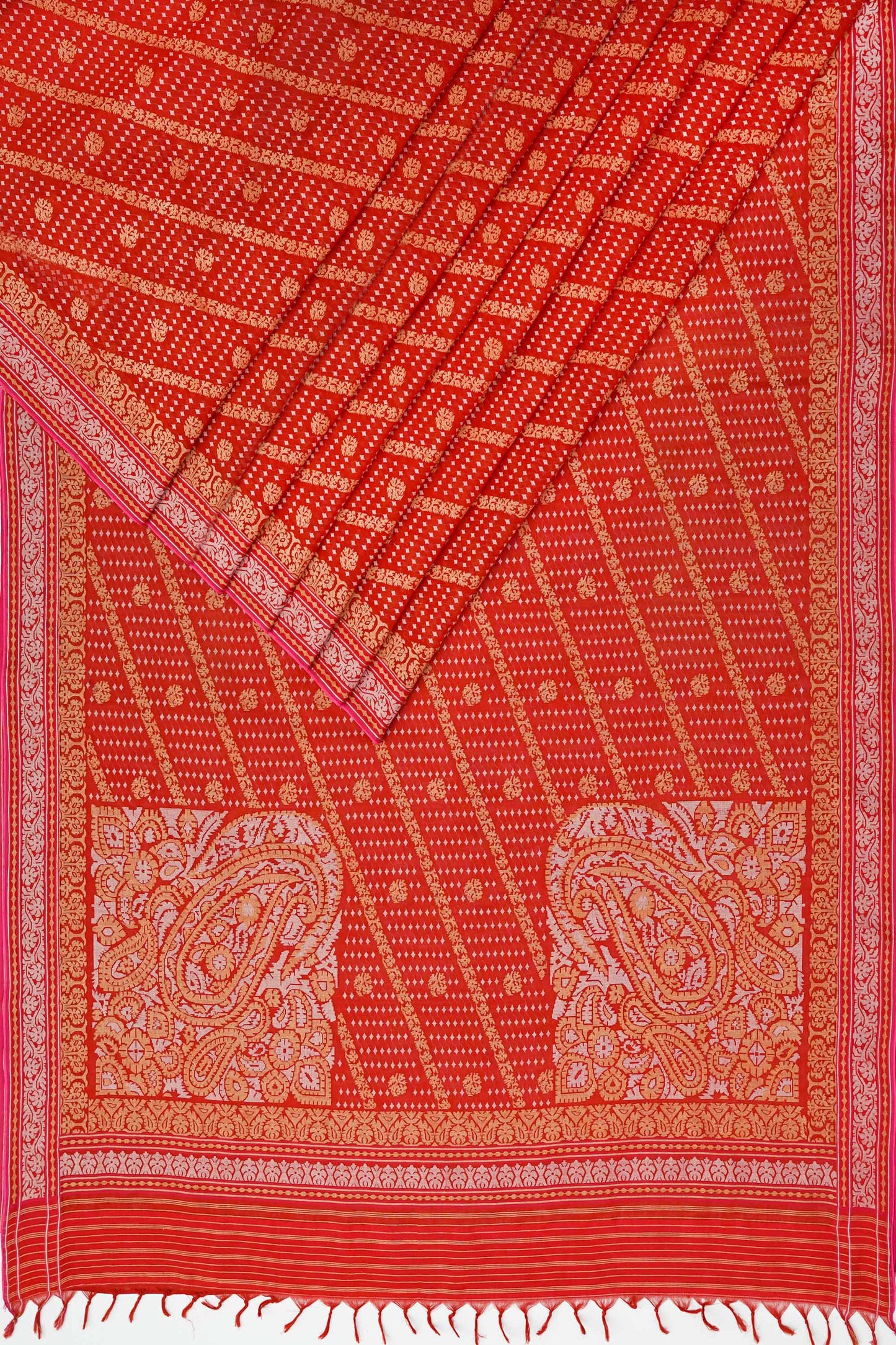 Set against a rich, vibrant red backdrop, the entire saree is enveloped in a mesmerizing rakthmabari base, a symphony of color that gleams like rubies caught in the sunlight. Its fiery richness is only enhanced by the intricate artistry of Banarasi weaving. Adorning this vibrant base is a spectacular display of gold and silver brocade, a luxurious tapestry that speaks of centuries of tradition and skill.