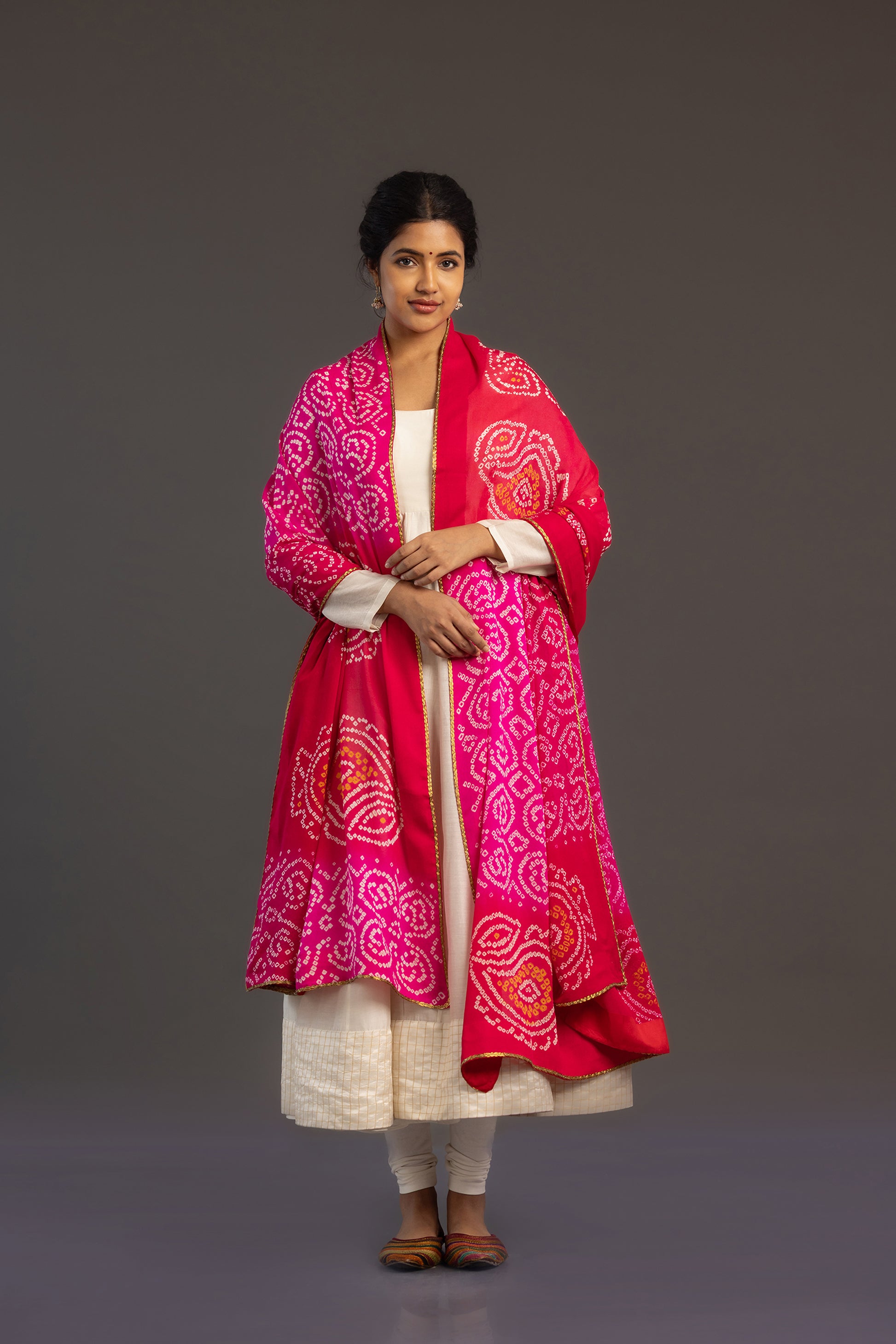 Pure georgette Bandhani dupatta in pink with tie-and-dye Bandhani work. Gold lace edges.