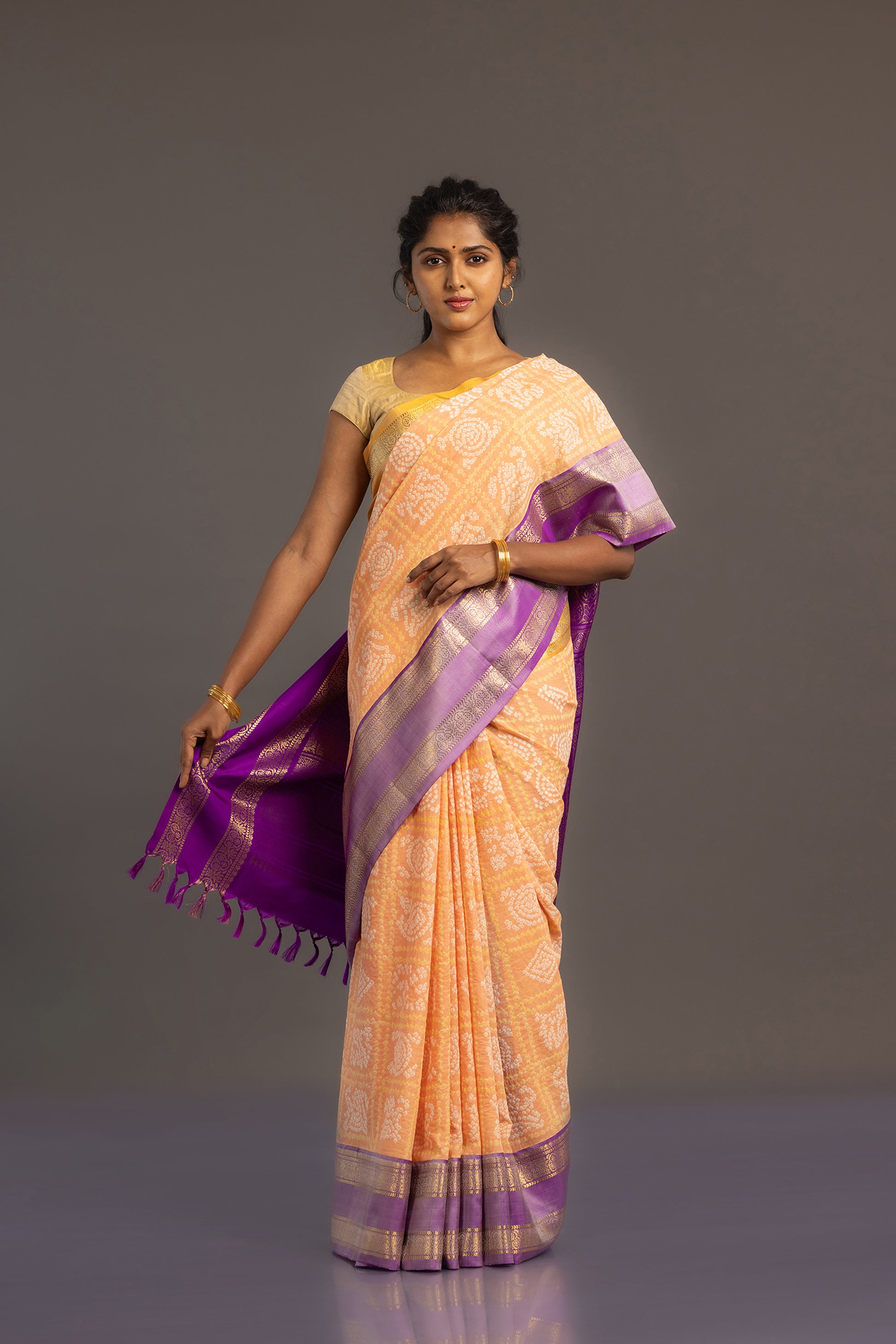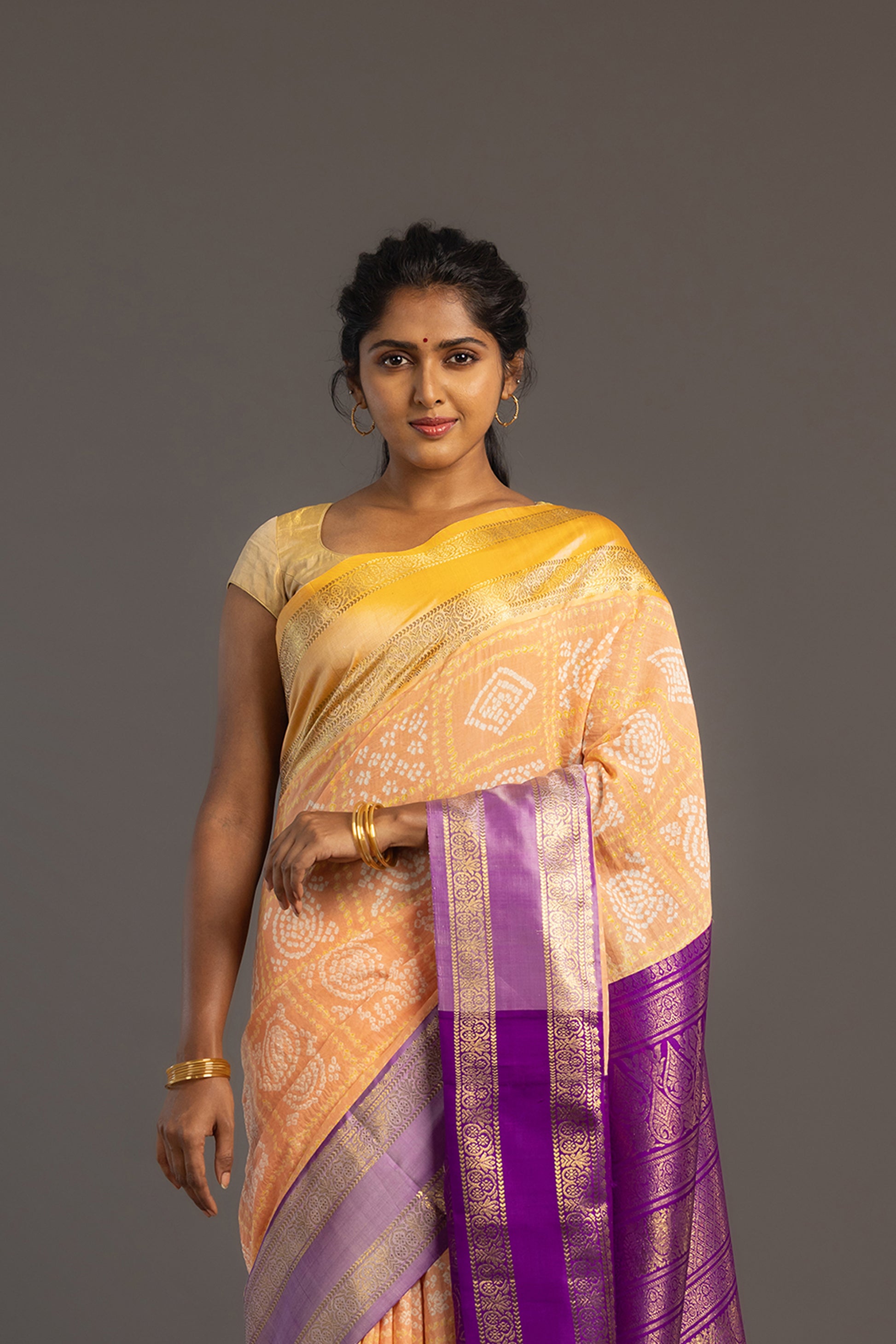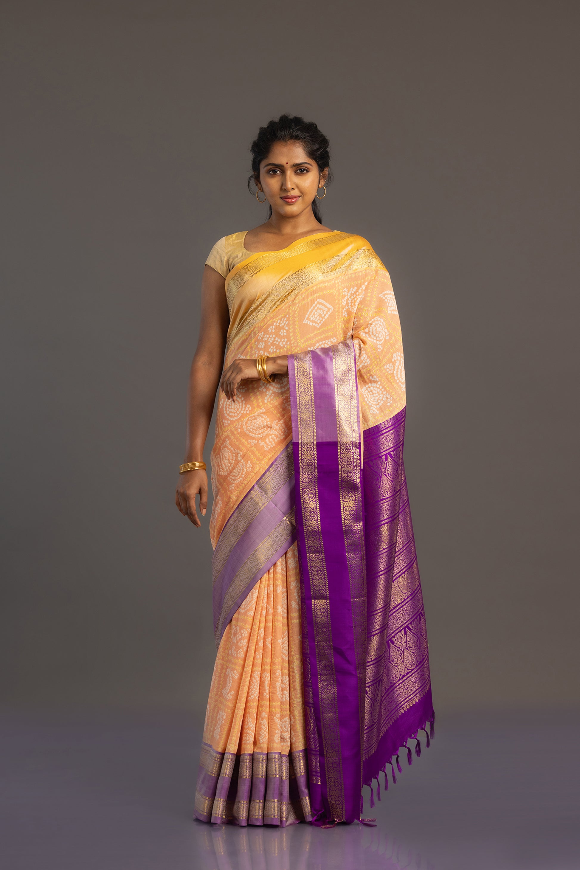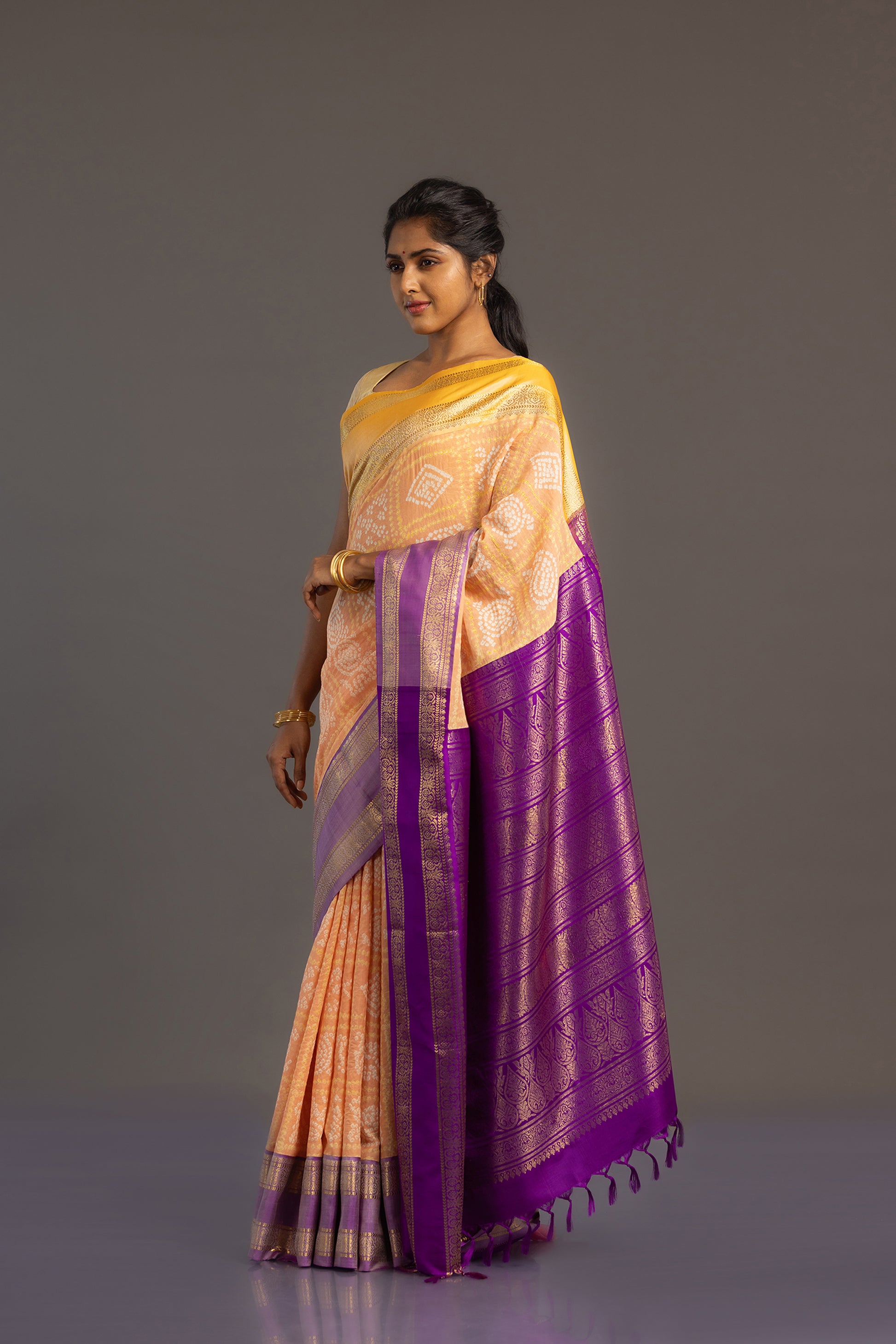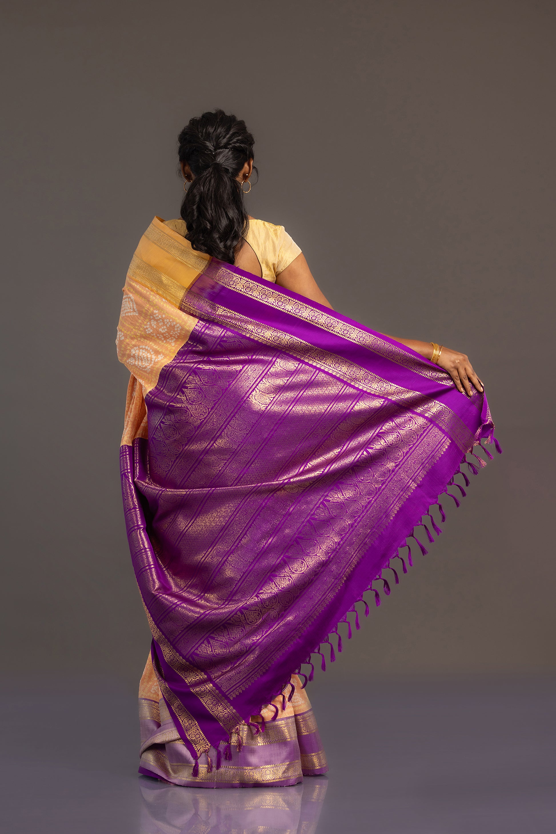Handwoven Kanjivaram Bandhini saree in peach-pink with an all-over Bandhini check pattern, with each square including modern embellishments. Ganga Jamuna Kanchi border in peach-orange and purple, woven with a modern gold Zari design. Contrast pallu has a check-enclosed floral pattern brocade, a flowing Kodi Visiri (creeper) border, a modern border, and a traditional Paan (leaf) motif border, all woven in gold Zari.