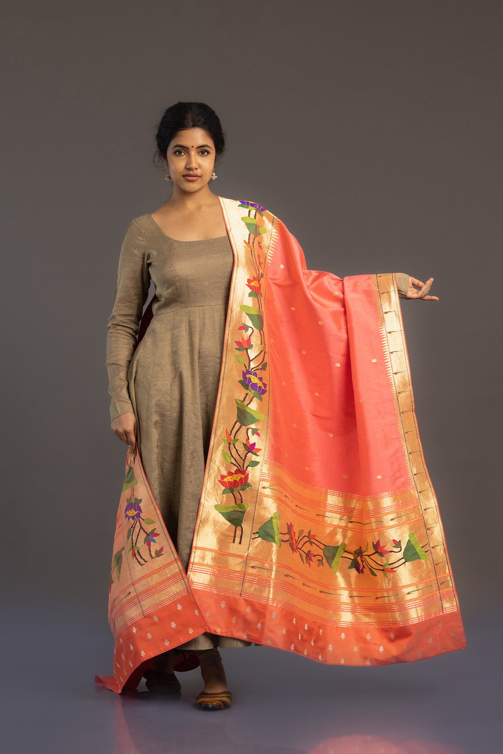 Handwoven Paithani dupatta in peach with all-over Zari polka dots. One side of the border has a Lotus Paithani border with a Zari temple weave. The other side has a Muniya Paithani border combined with temple design. Pallu has Lotus and Muniya Paithani borders, Zari stripes, and an attached Benarasi Zari pattern panel.