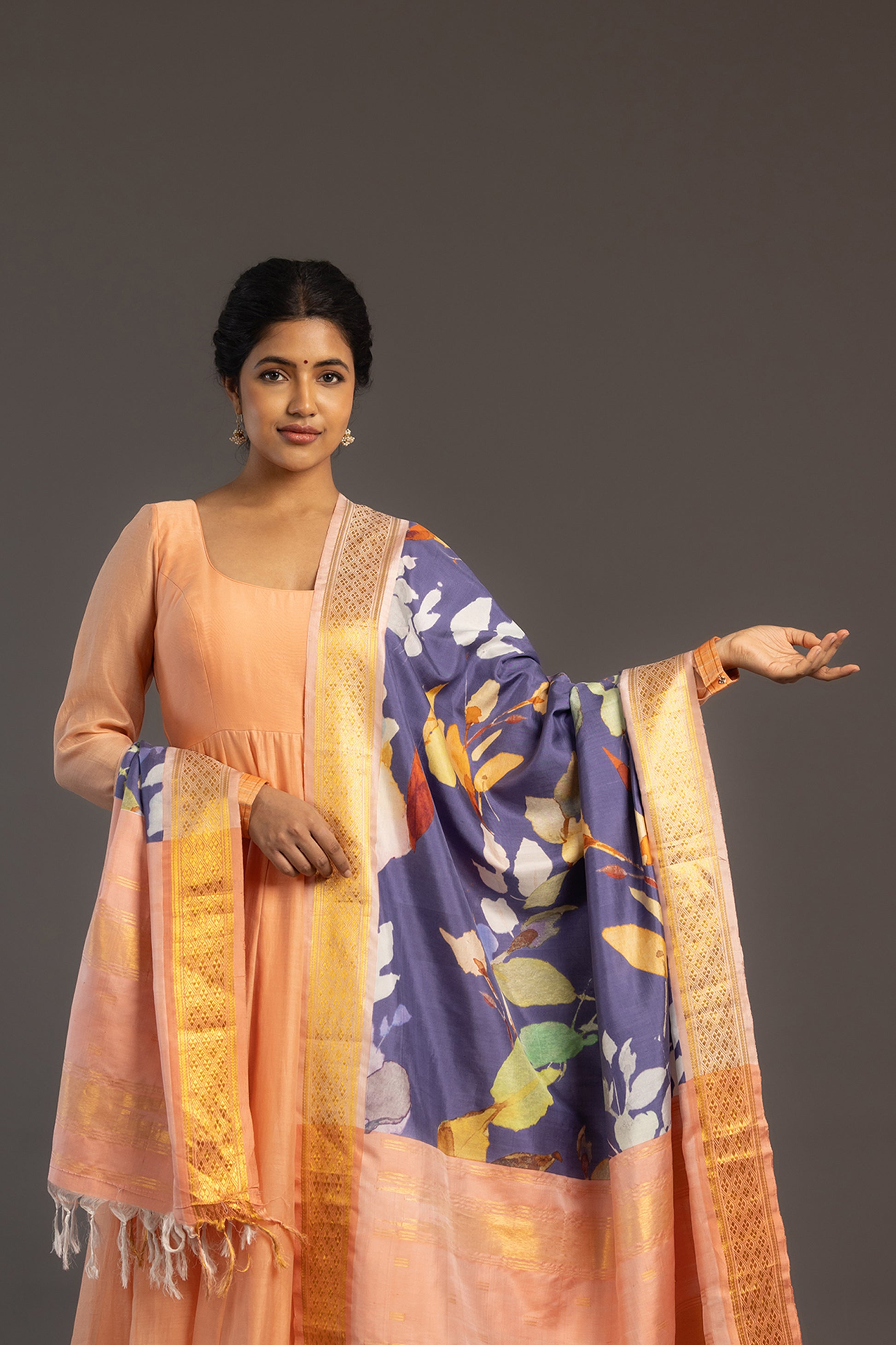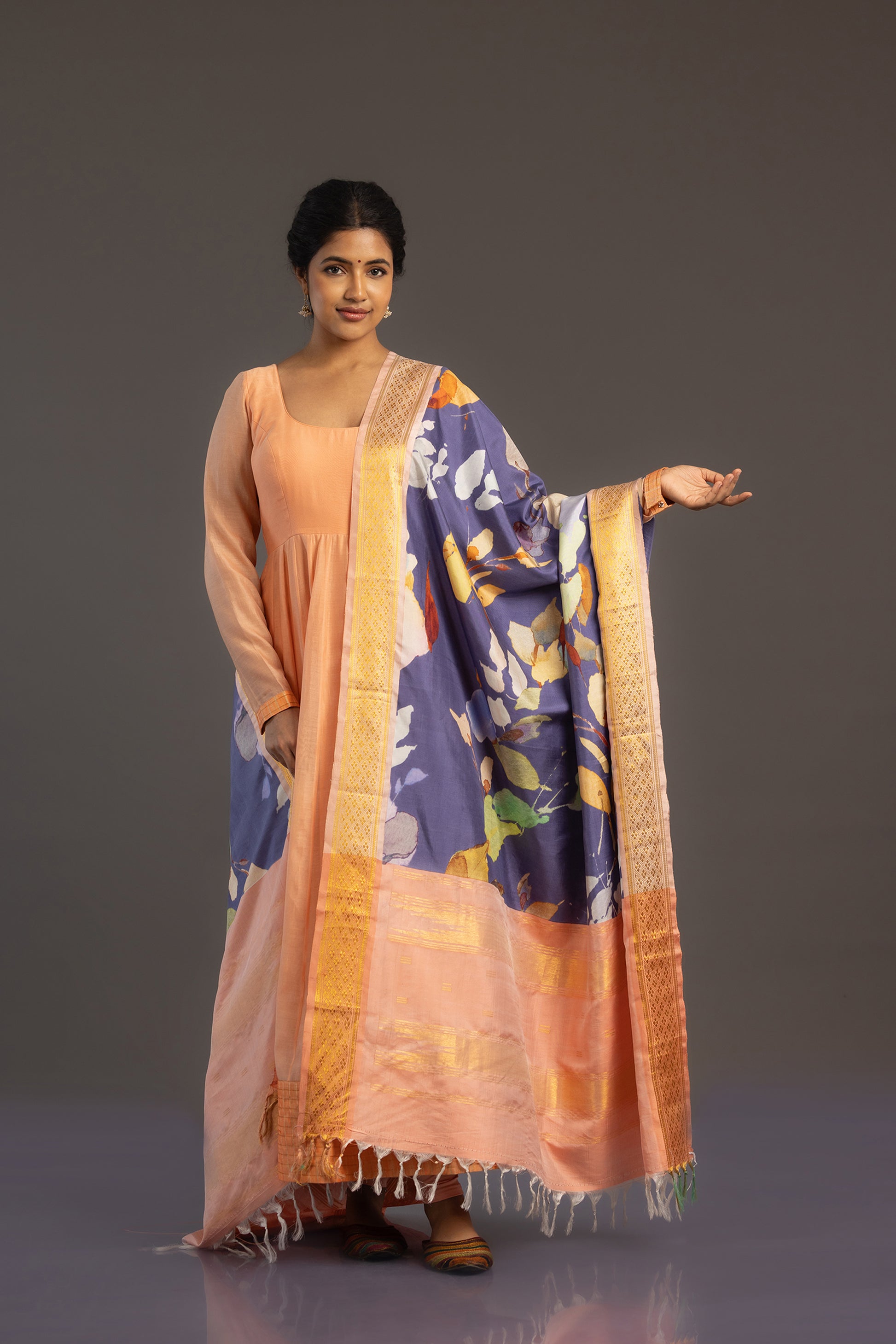 Handwoven Kanjivaram printed dupatta in blue with abstract art prints. Borders are made of a peach Kanchi weave with Zari. Pallu is in deeper peach with woven Seeprekku (stepped) band highlighted by alternating gold Zari stripes.