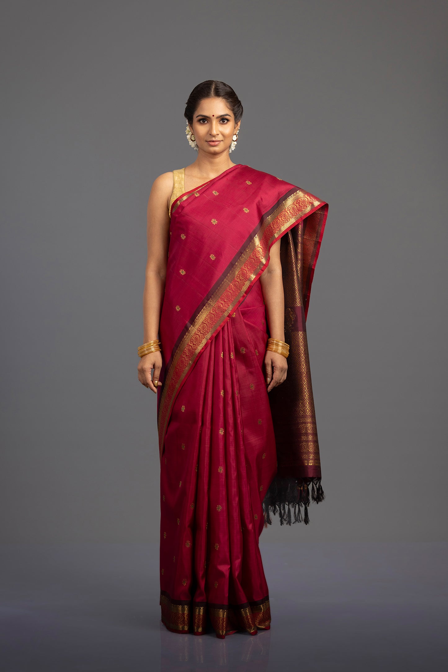Dark red Kanjivaram handloom saree woven with zari buttas. The border has a paisley pattern. The pallu is in a maroon color with paisley and floral brocade pattern.