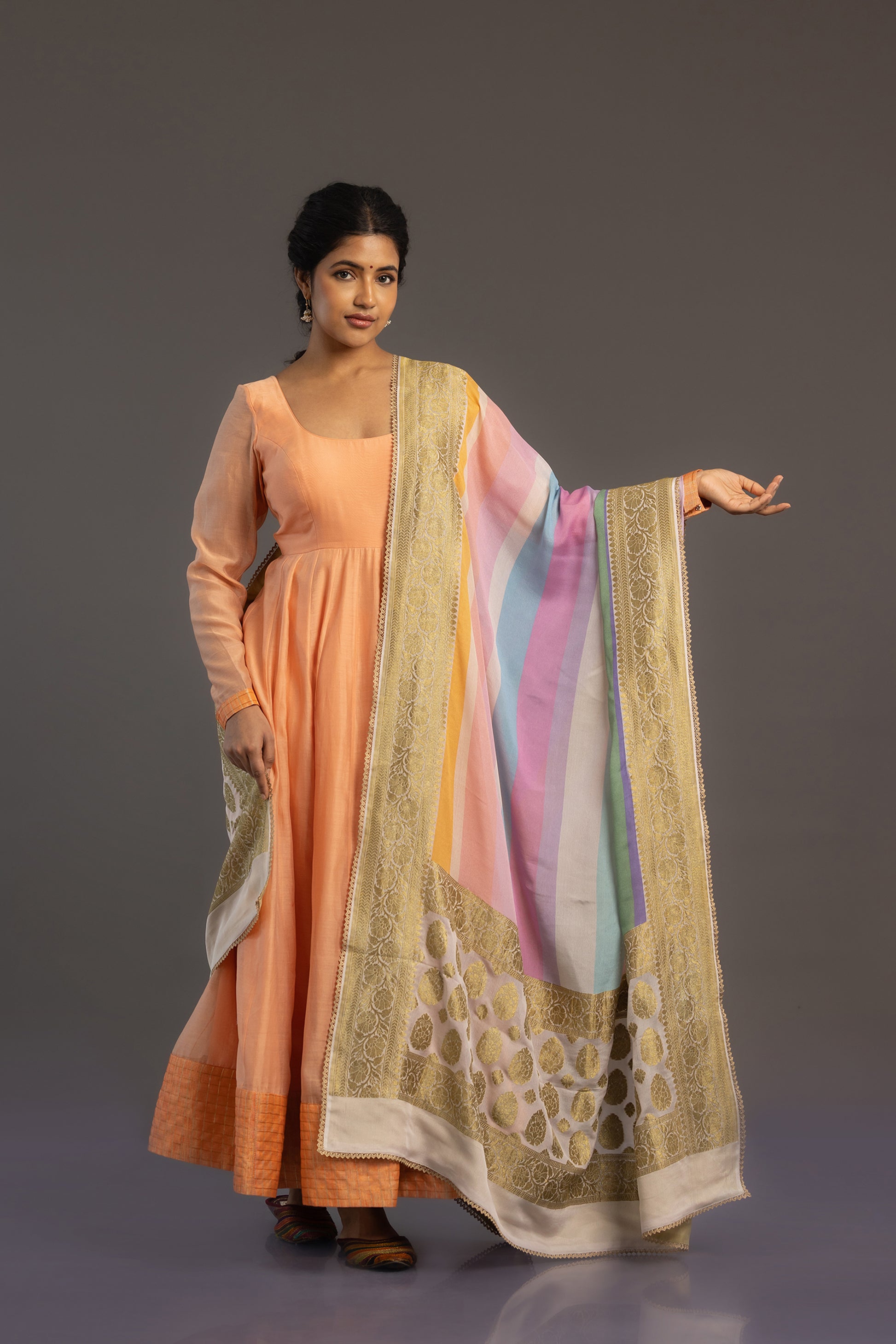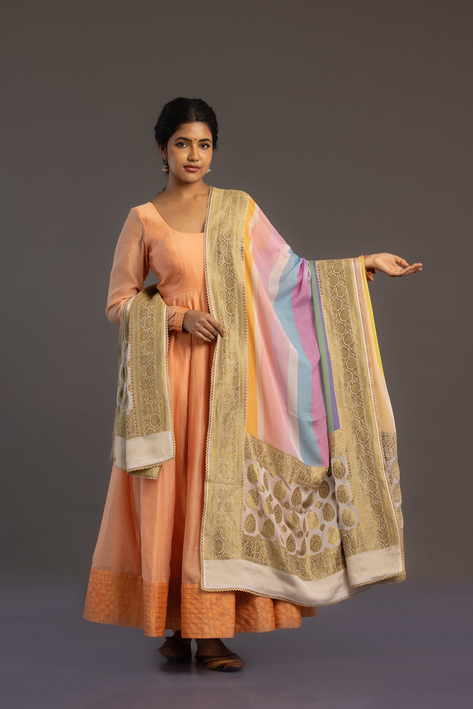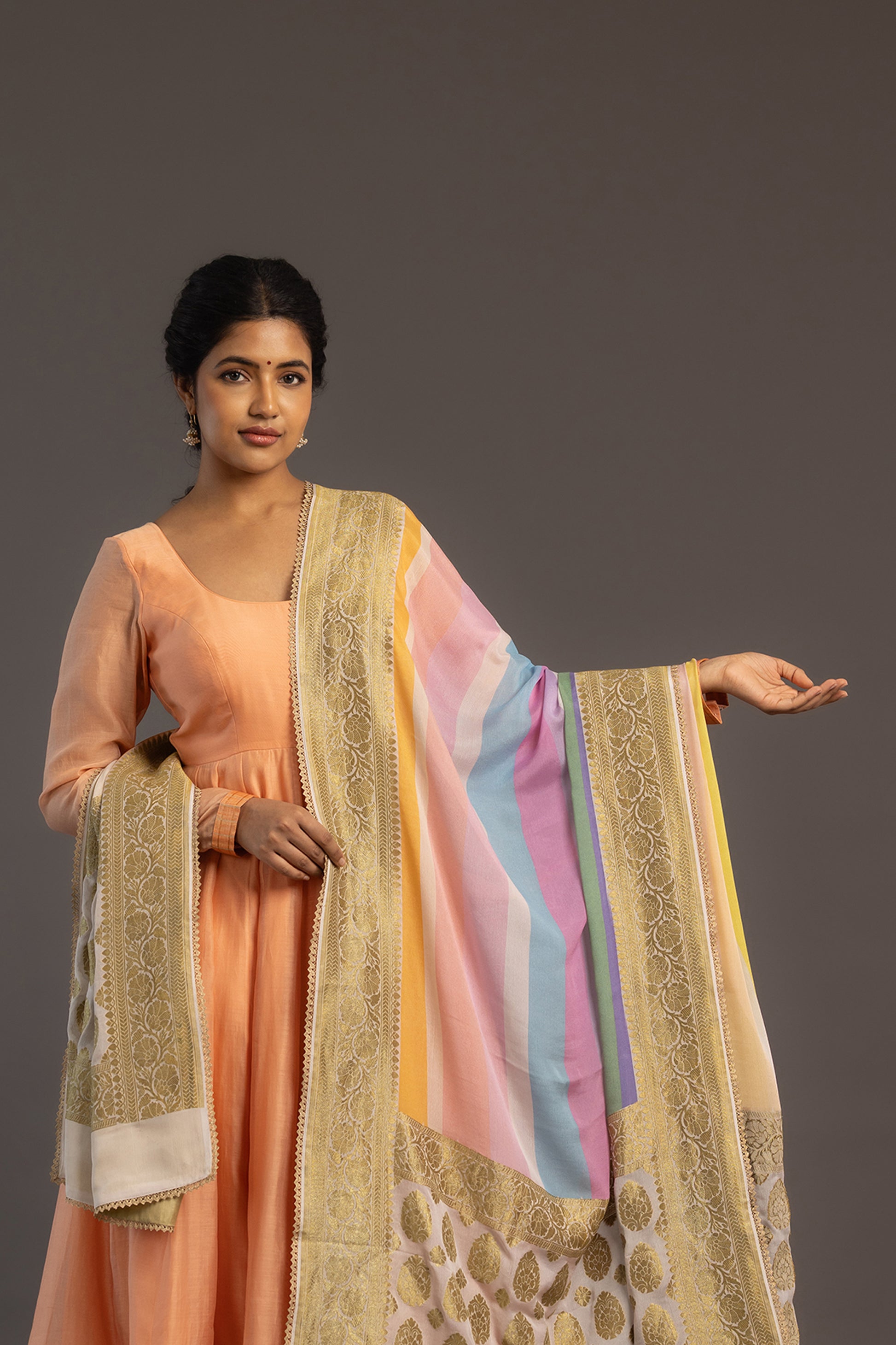 Handwoven georgette Benarasi dupatta with multicolored printed stripes. Off-white Benarasi border with a woven floral creeper motif in Zari. Pallu has Mughal-inspired Zari designs and finished with a scalloped lace edging.