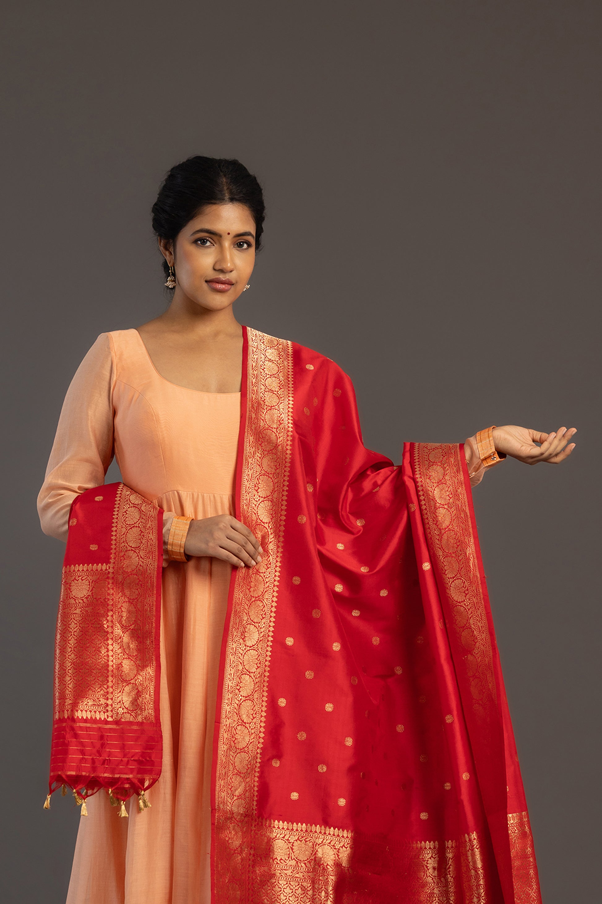 Handwoven Benarasi dupatta in crimson with flower designs woven in Zari. Border has a Kodi Visiri (creeper) pattern woven in Zari. Pallu extends the border, along with a contemporary paan (leaf) design.