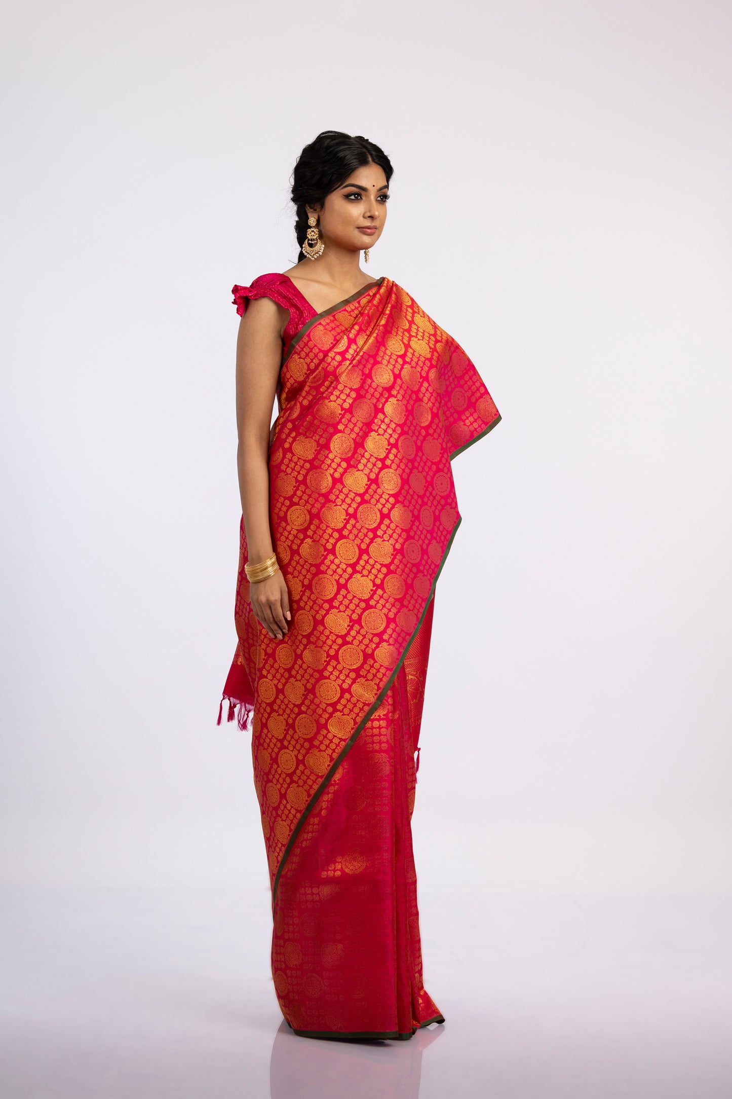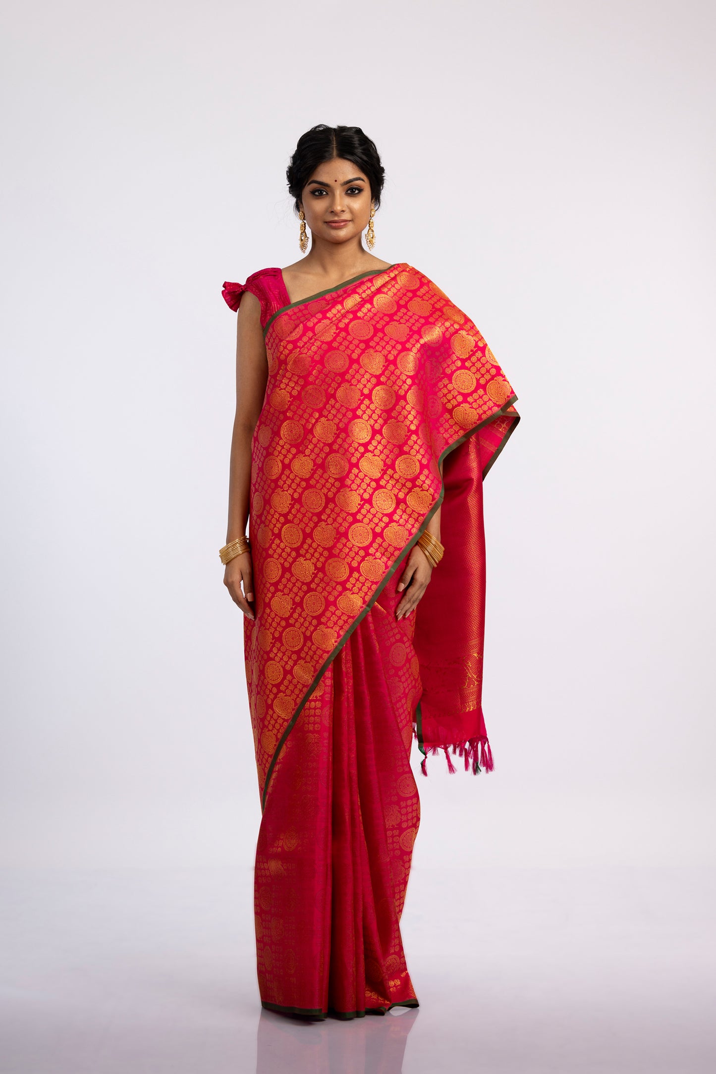 Kanjivaram handwoven saree in bright pink. All-over peacock brocade and contrasting green selvedge. Pallu is woven in a tiny check pattern with a peacock border.